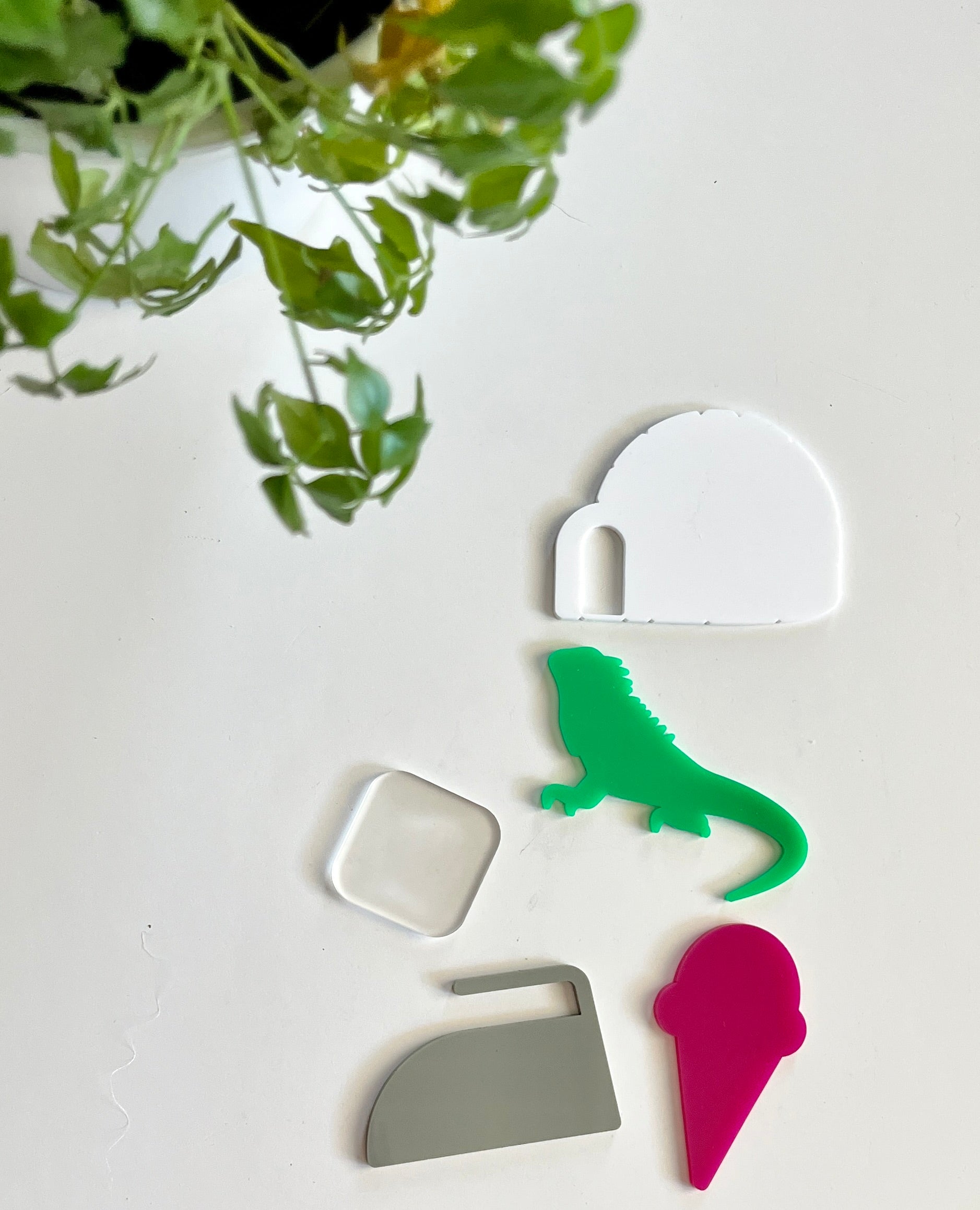 I – pink ice cream cone, white igloo, grey iron, frosted clear ice cube, green iguana