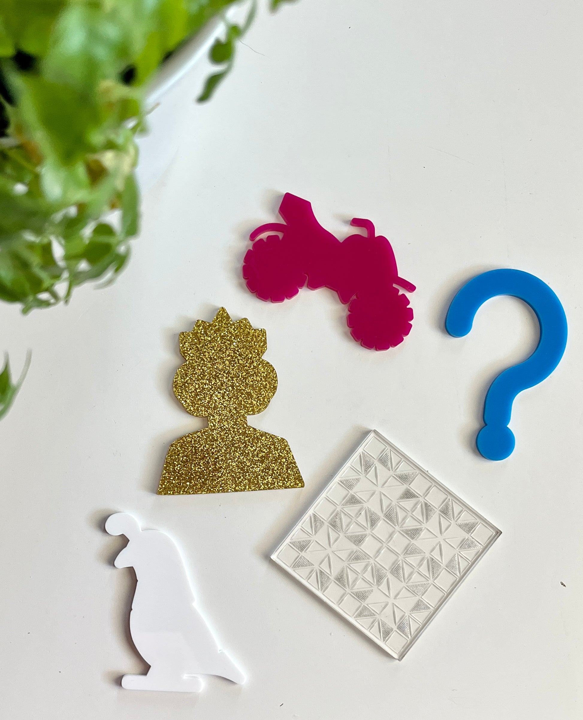 Q – gold queen, blue question mark, white quail, clear (engraved on back) quilt, pink quad