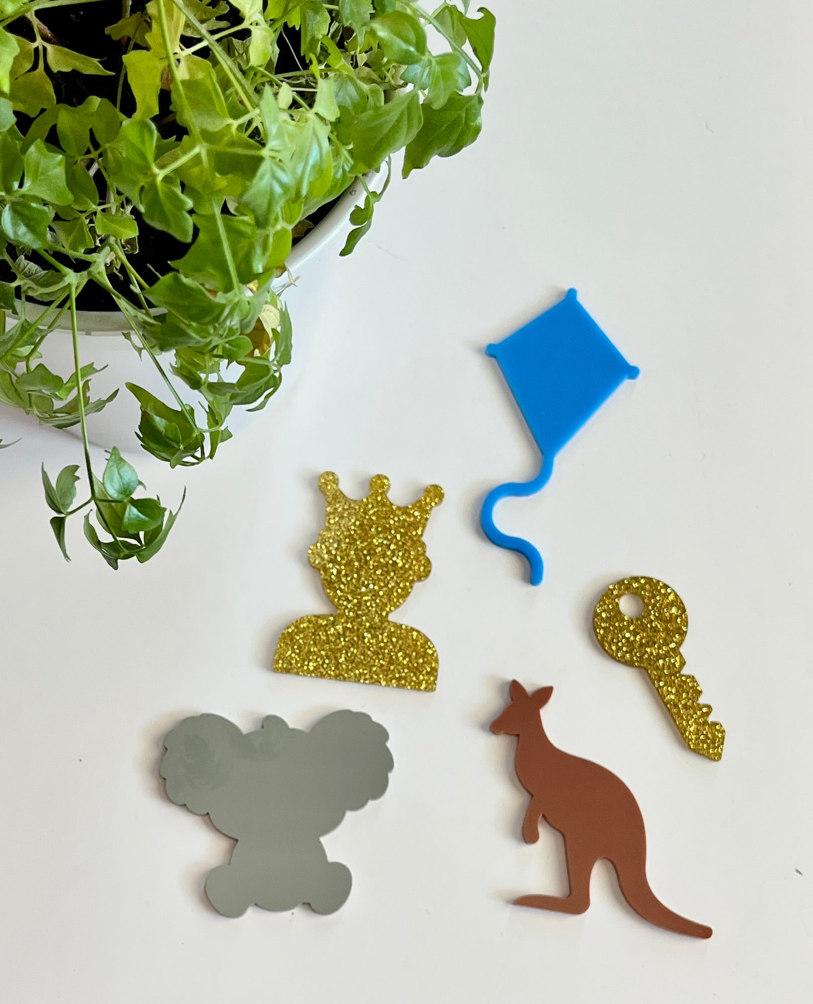 K – blue kite, gold key, grey koala, brown kangaroo, gold king