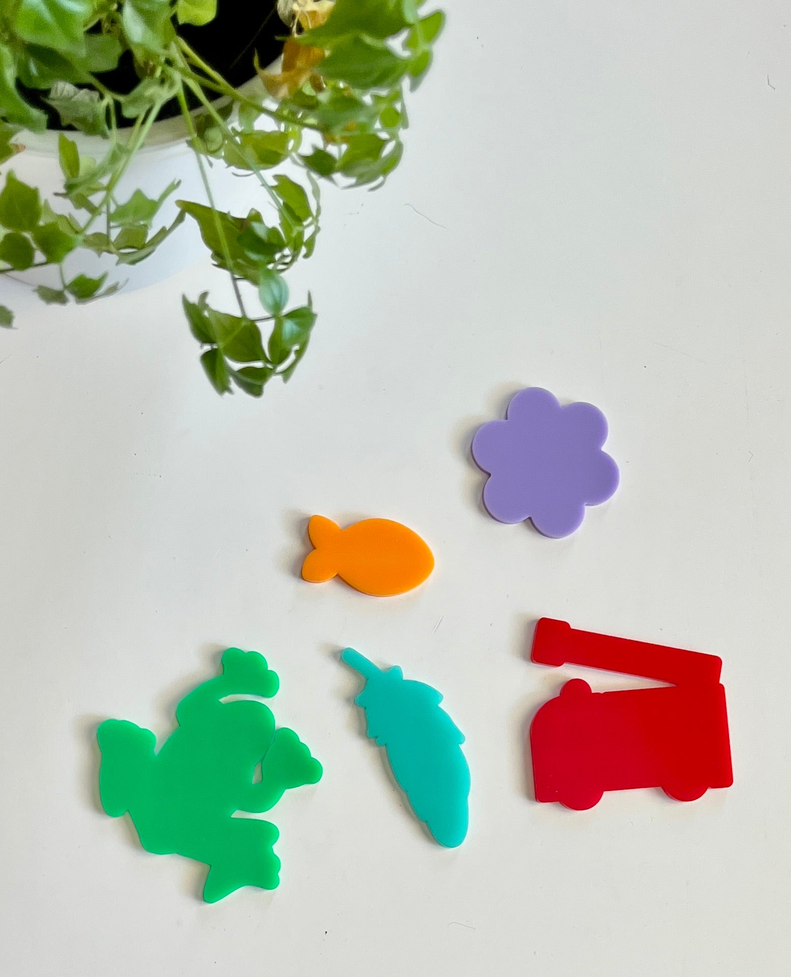 F – orange fish, green frog, purple flower, red firetruck, teal blue feather