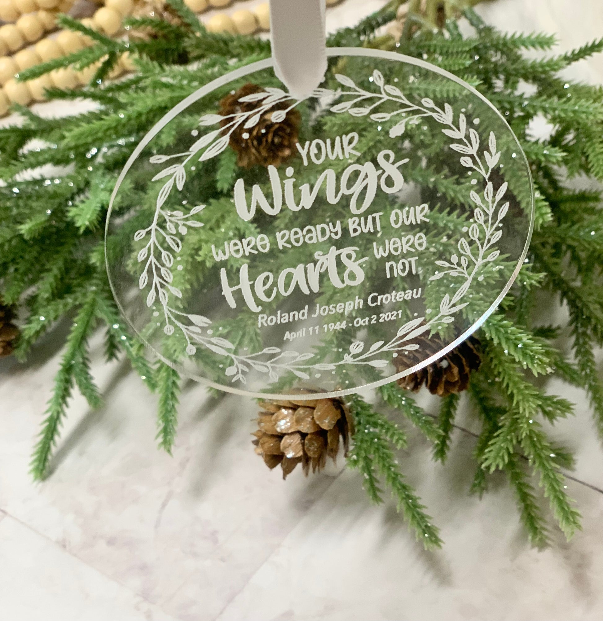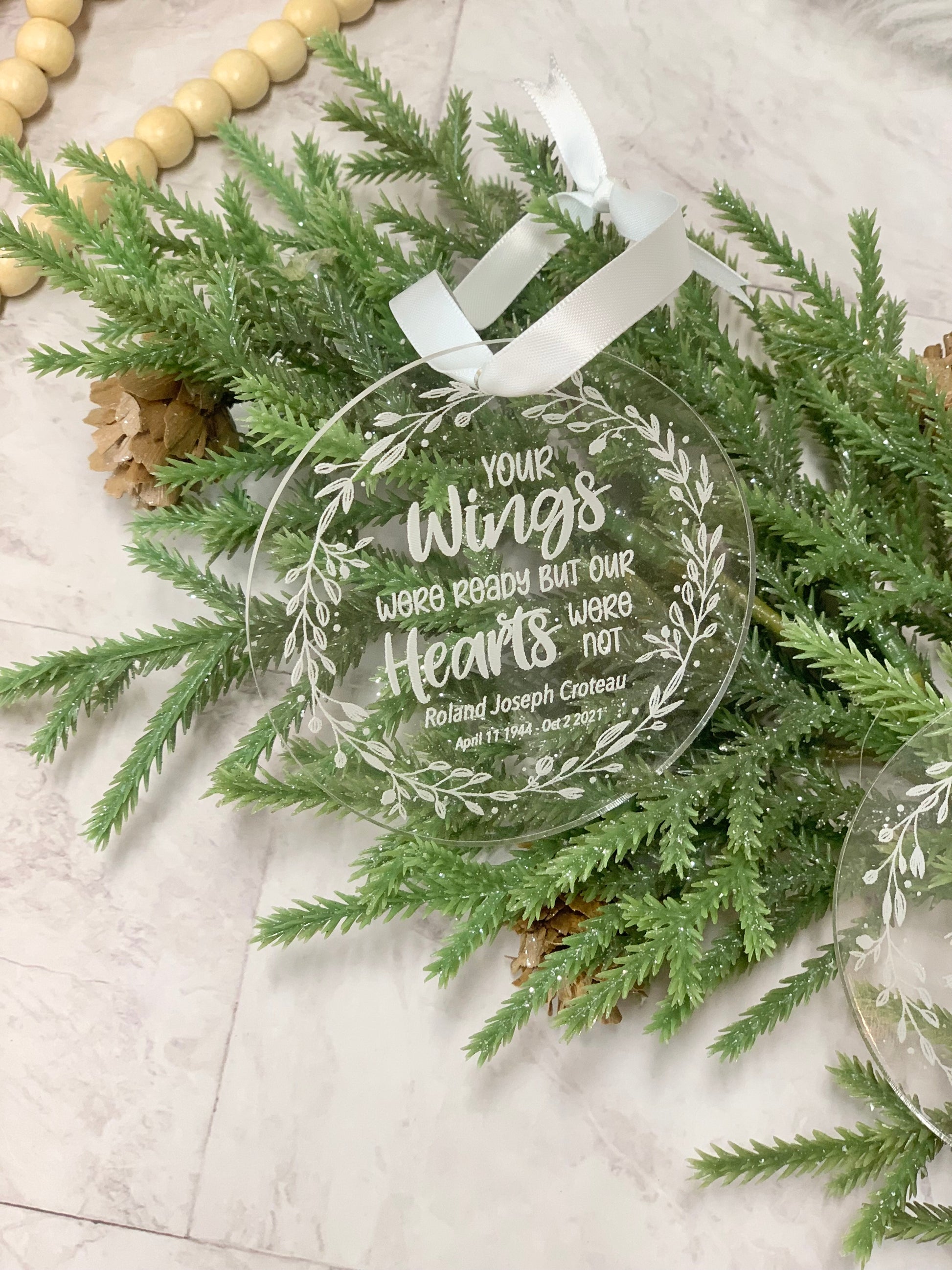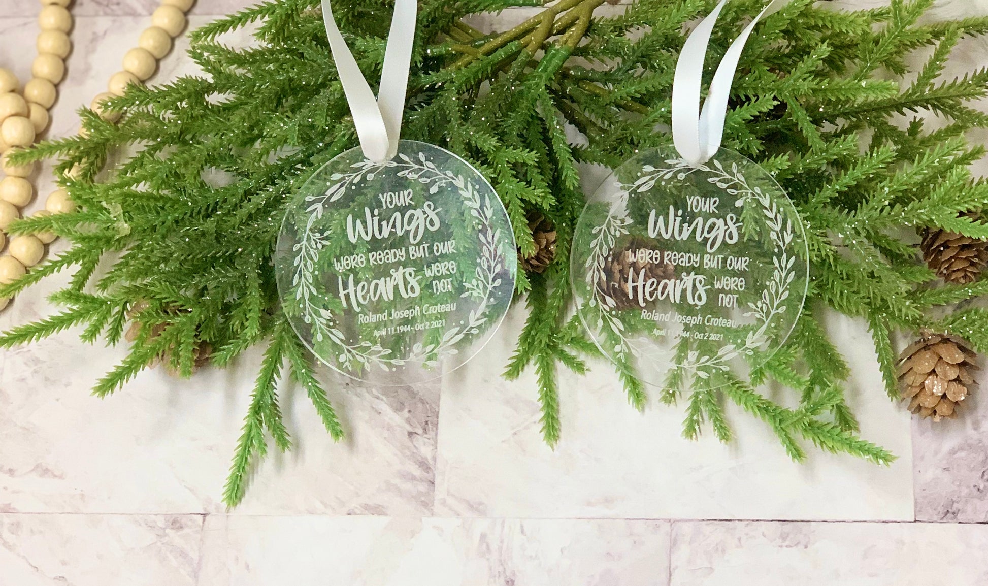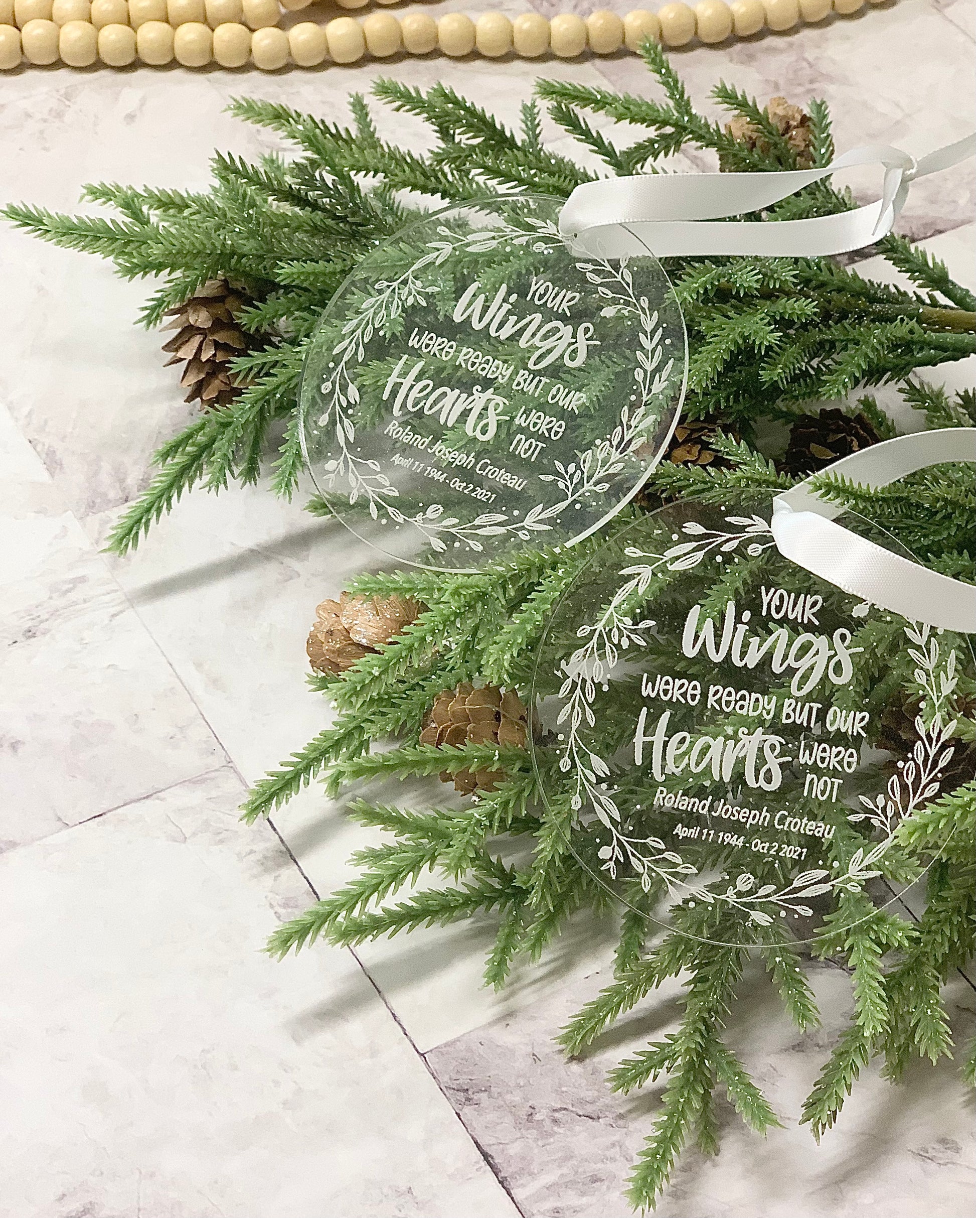 Each ornament is from 1/8” acrylic and engraved. Approximately 3.5” big.