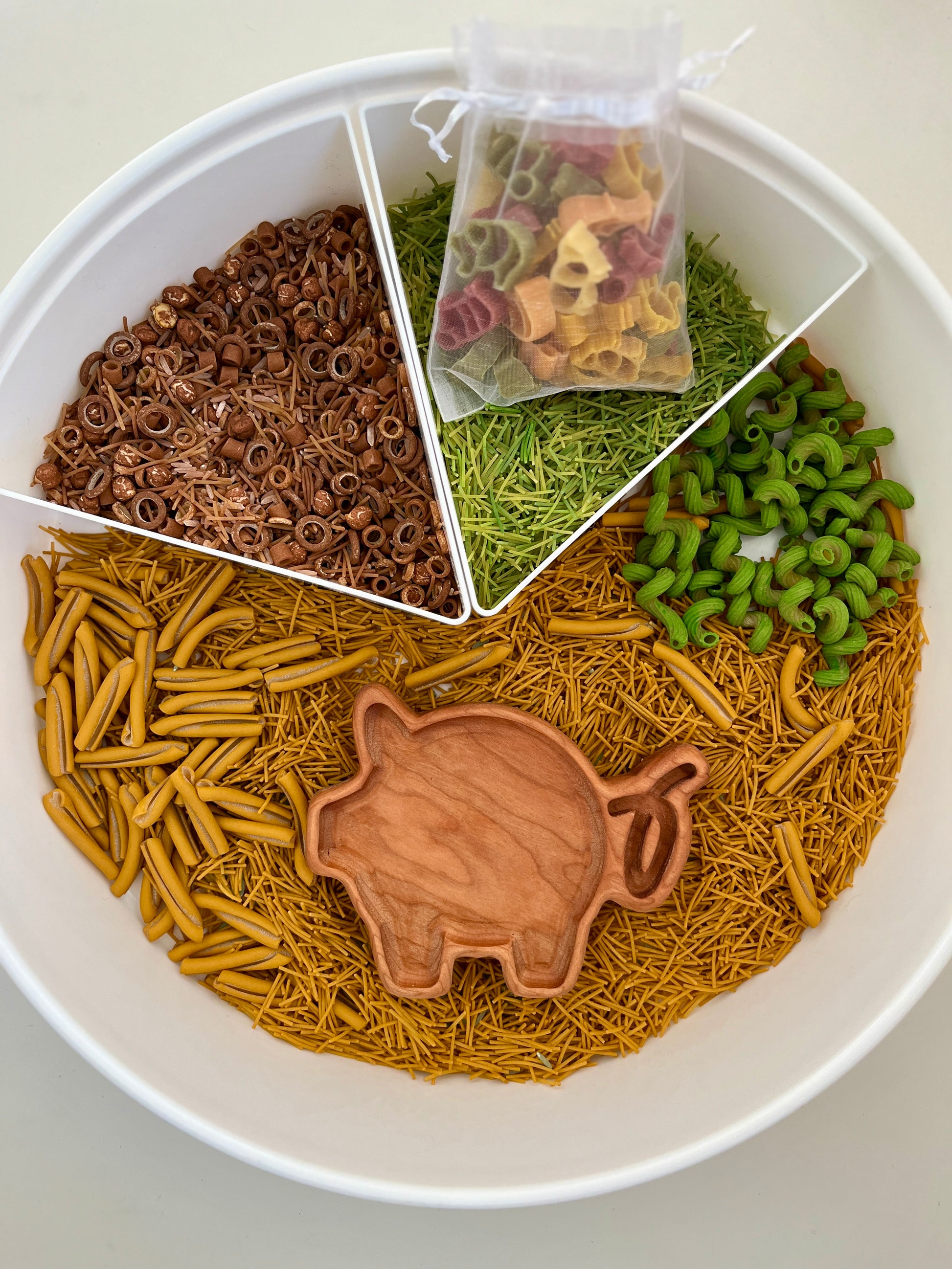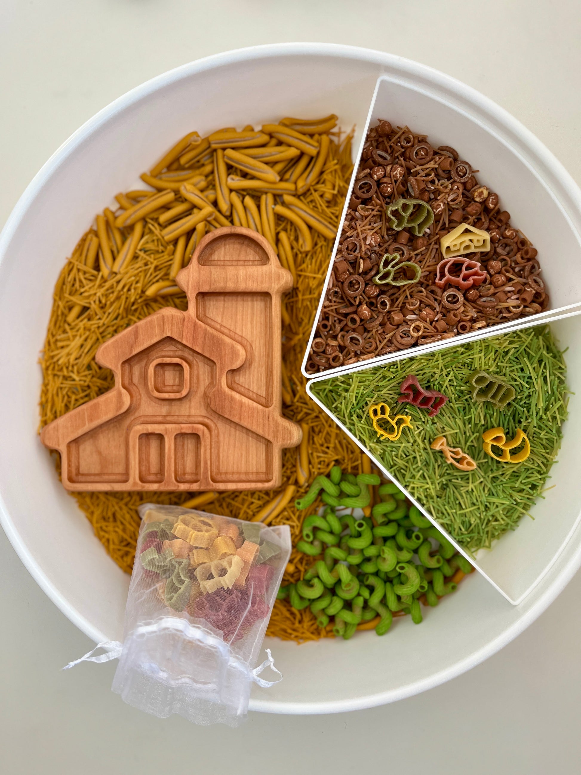 We prioritize sustainability with our use of natural wood and eco-friendly sensory fillers. The sensory tray is non-toxic and safe for children to explore. This sensory tray fosters cognitive development through sensory exploration, fine motor skills practice, and imaginative play. Children can learn about farm life and animal habitats while engaging in open-ended play.