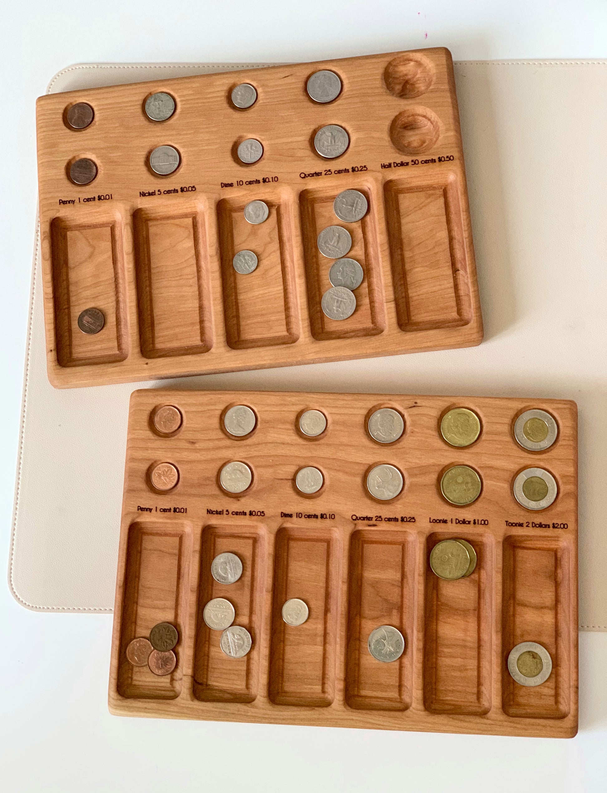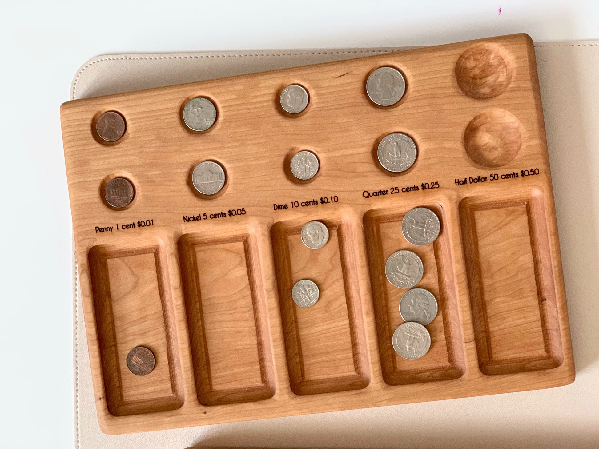 Introducing the Money Tray – an engaging educational tool designed to make learning about coins both interactive and fun! The top section features dual circle holes for each coin, allowing little ones to showcase both the front and back. The bottom area is designed with rectangles beneath each coin type, providing an ideal sorting space for organizing the corresponding change. This hands-on experience not only enhances early learning of coin values but also refines fine motor skills through tactile exploration. Elevate your child's understanding of money math in a playful and visually stimulating way with our thoughtfully designed Money Tray.