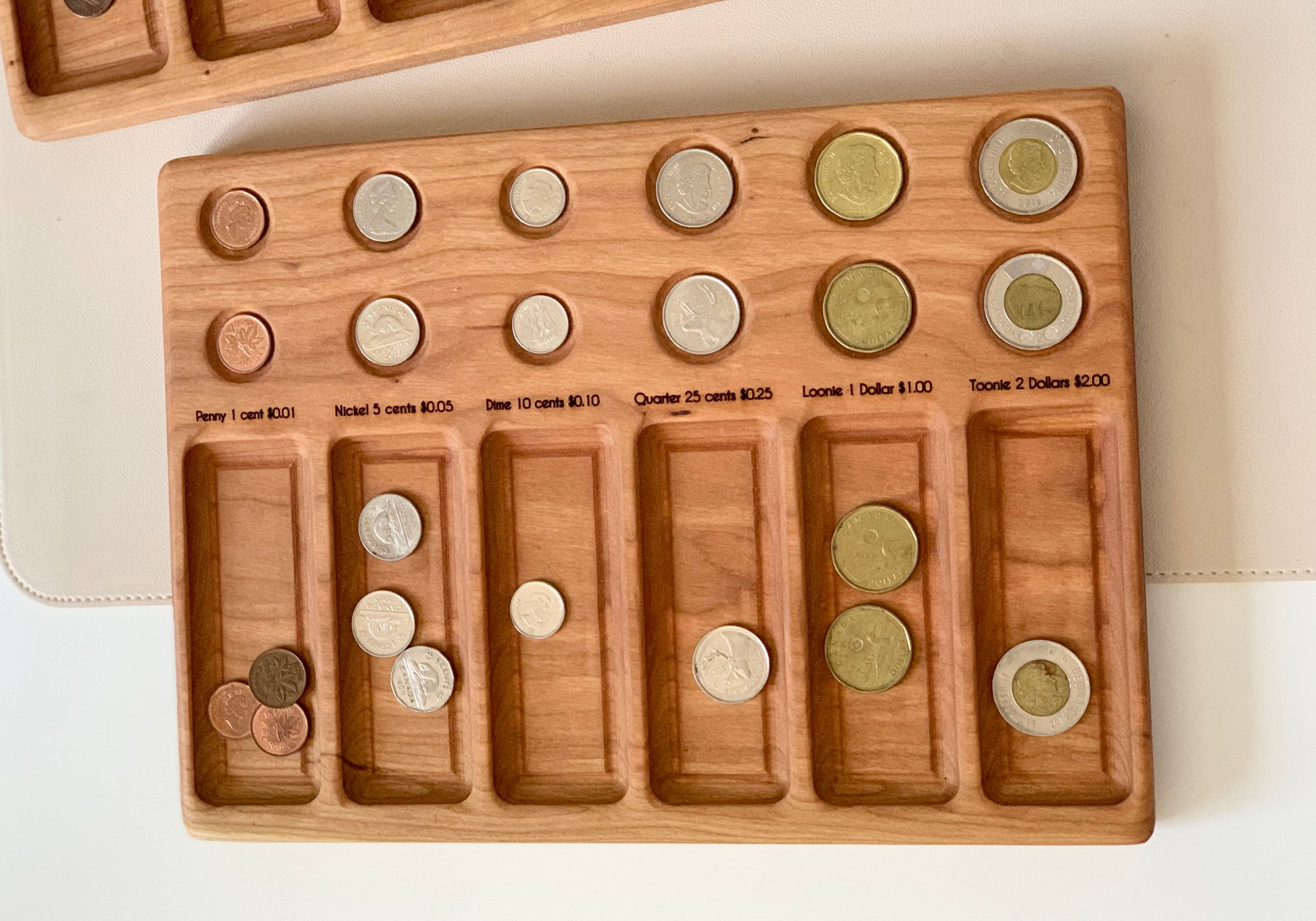 The Canadian version has spots for pennies, nickels, dimes, quarters, loonies and toonies. The American version has space for pennies nickels dimes quarters and half dollars.