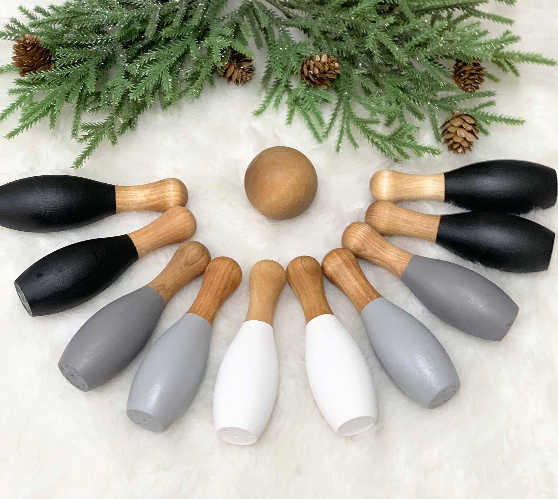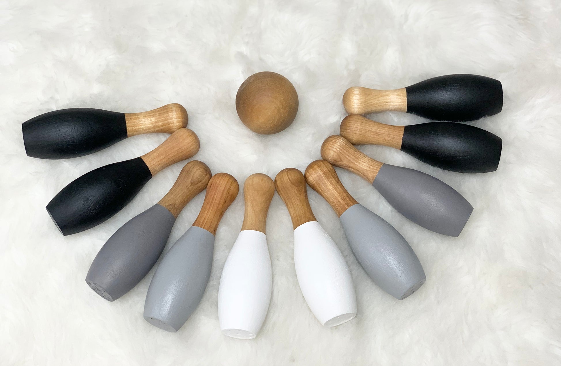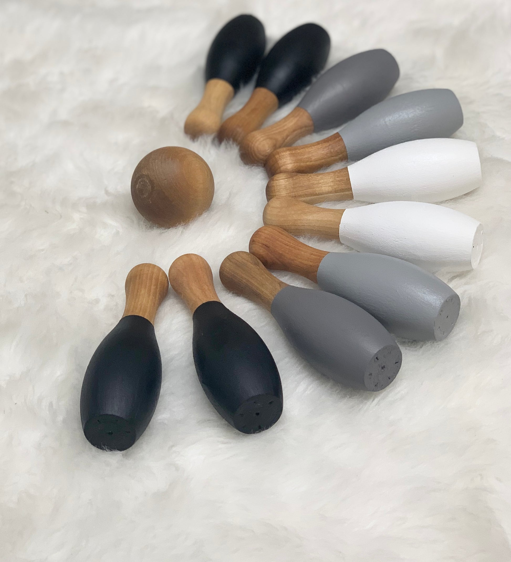 Your little one will love playing with & knocking over this wood bowling set! The perfect toddler and Montessori toy, these wood skittles make the perfect gift for toddlers and young children- whether it be for a baby shower, Christmas gift or stocking stuffer.