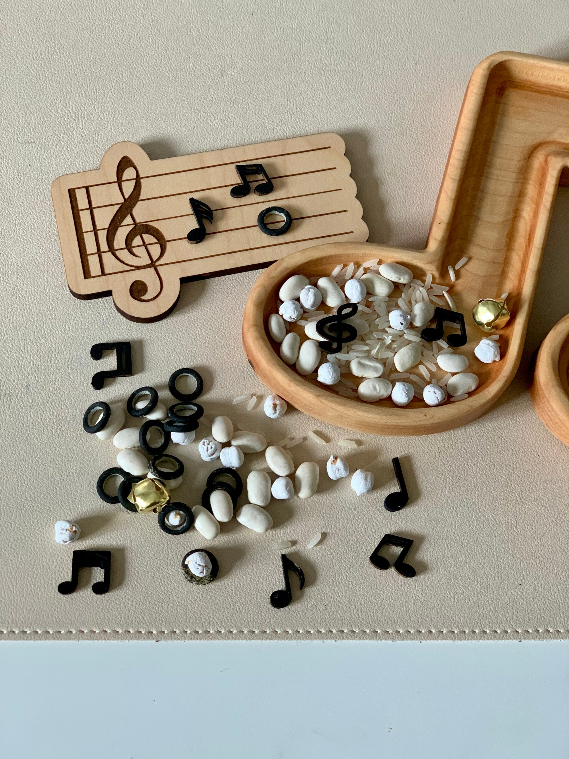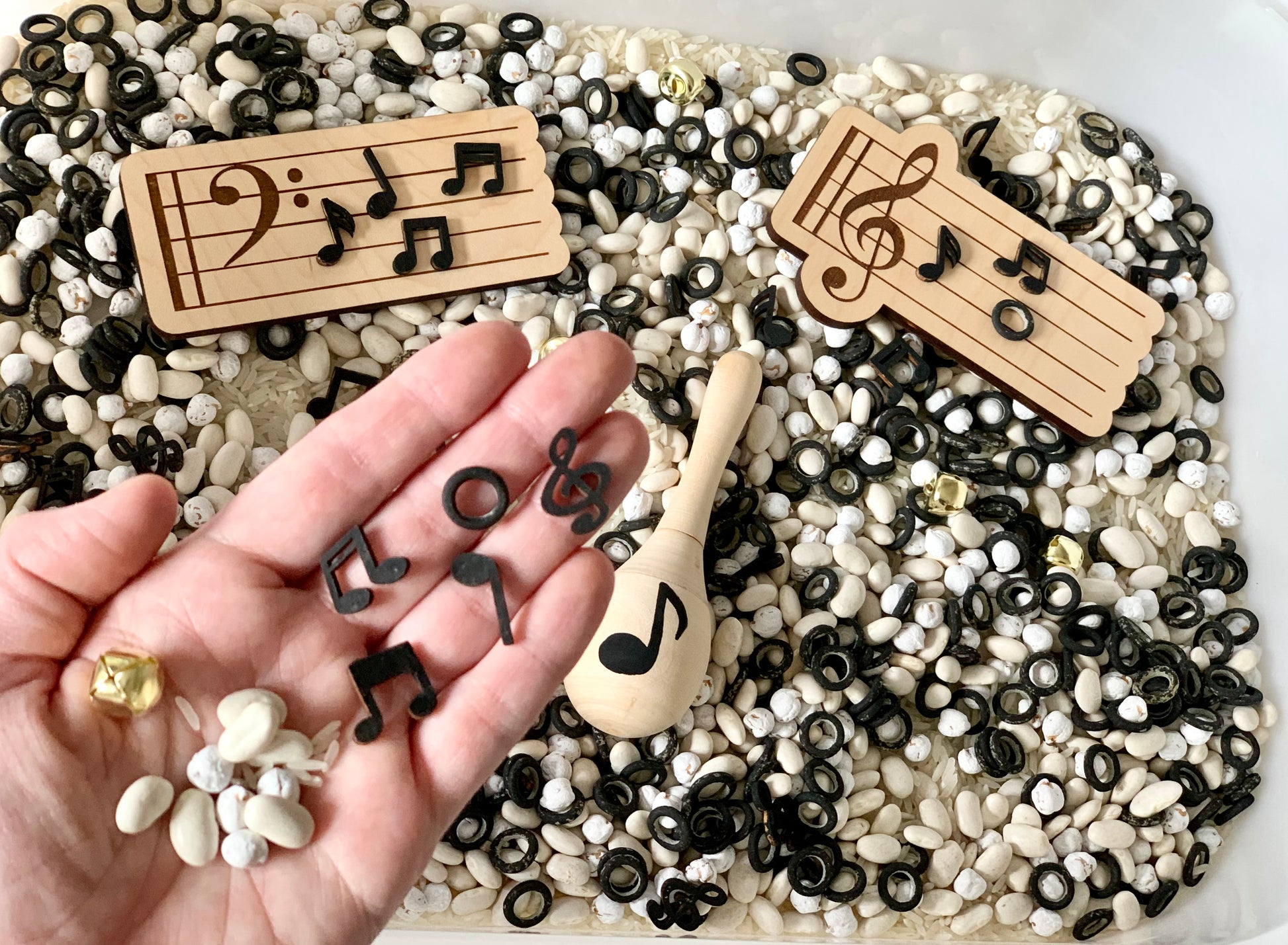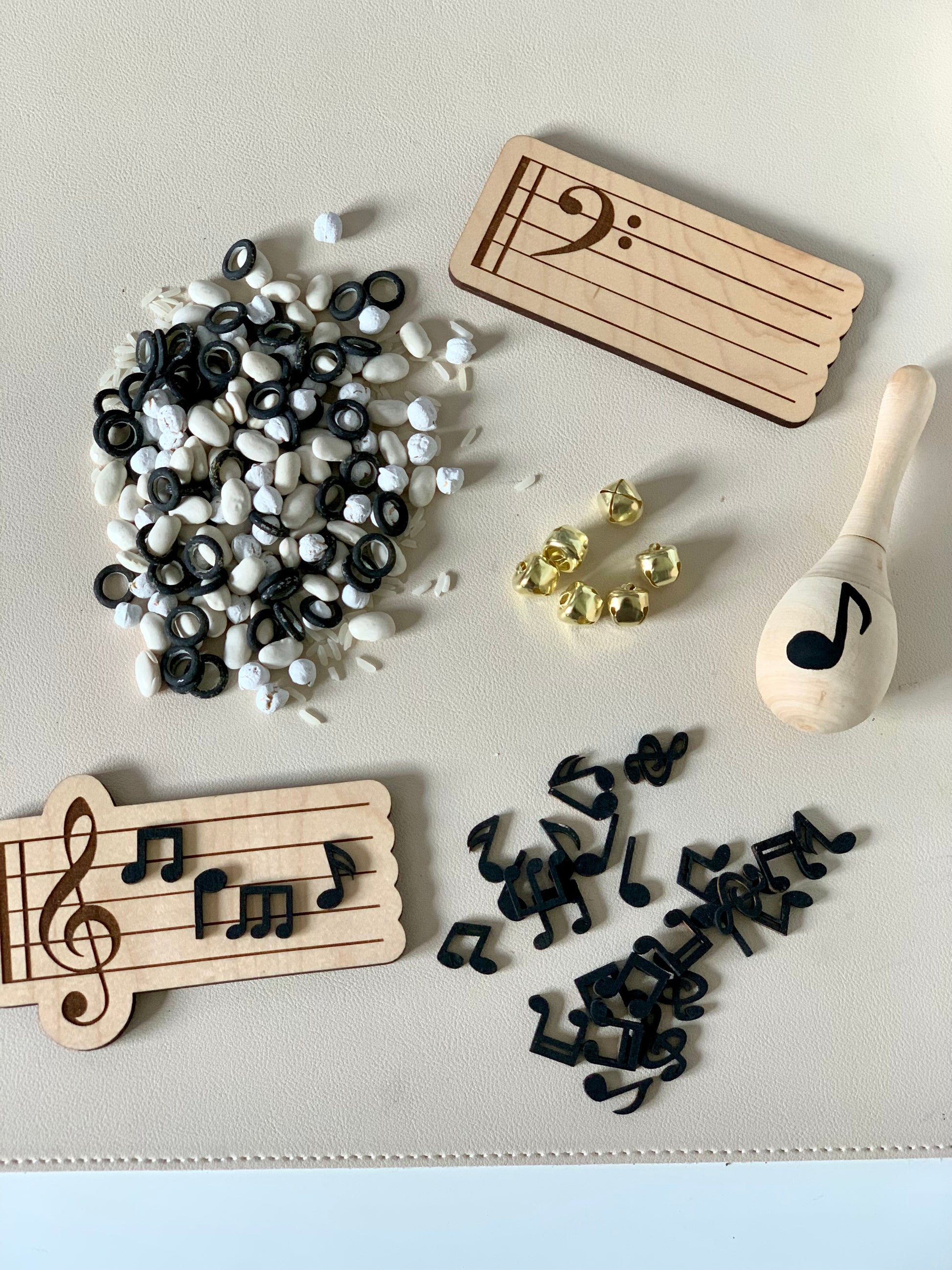 Each Kit comes with approximately 5 cups of fun filler complete with 6 bells, approximately 25 wooden music notes, 2 wooden “music sheets”, and a wooden maraca.
