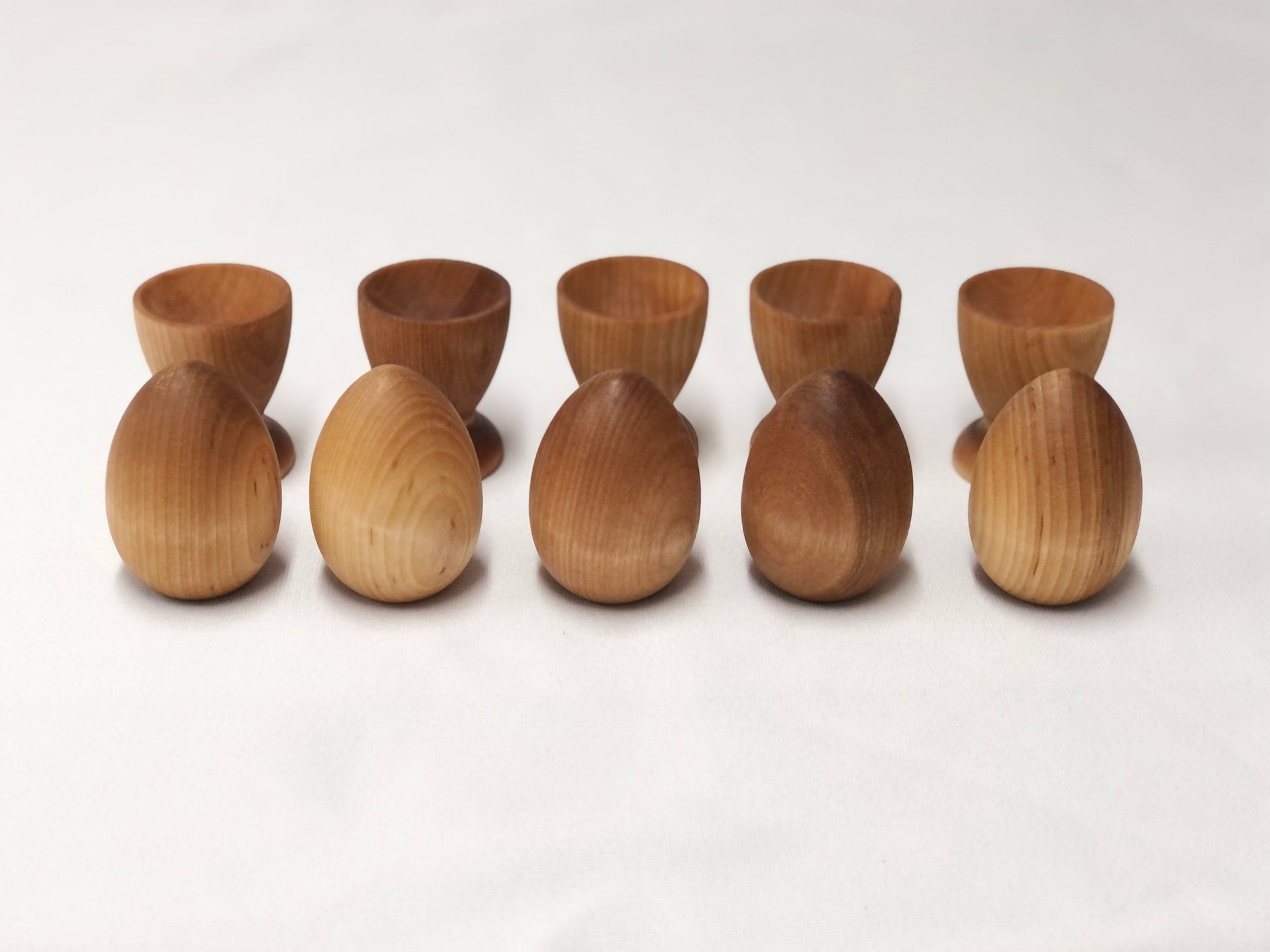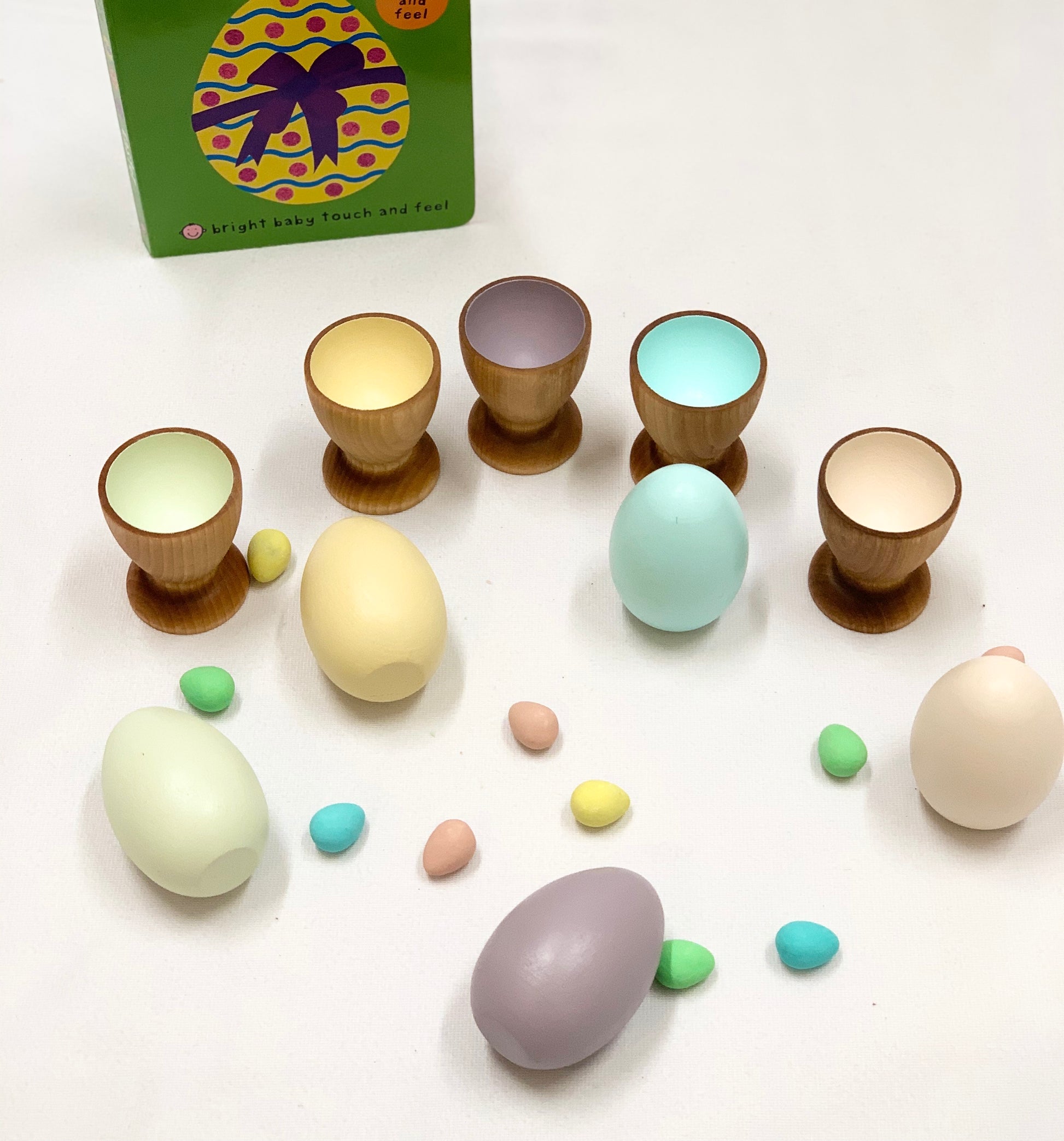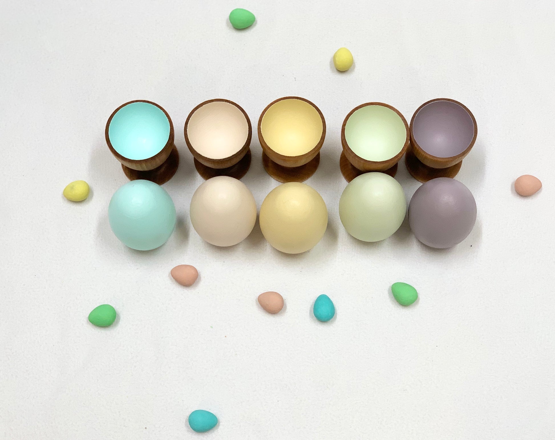 Open ended play is also encouraged — use the cups to pretend play in the kitchen — measuring out spices & ingredients and stirring the eggs in a bowl. Maybe the eggs are mini potatoes or some yummy breakfast for your dolls. The possibilities are endless. This set is the perfect addition to your toys for homeschool, daycare, or preschool. Painted in pastel and neutral colours, the eggs and cups are pleasing to touch; as well as look beautiful on a shelf.