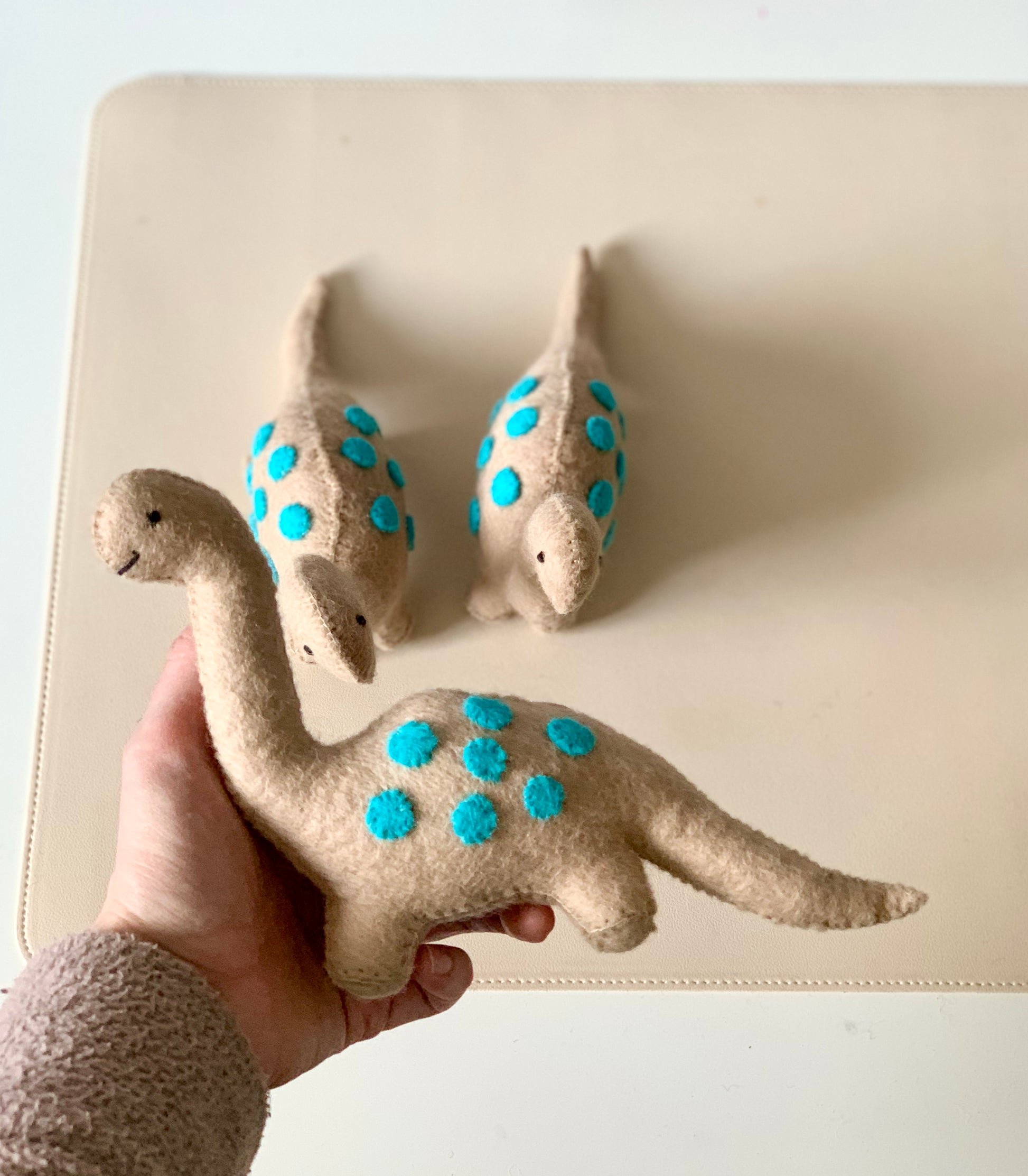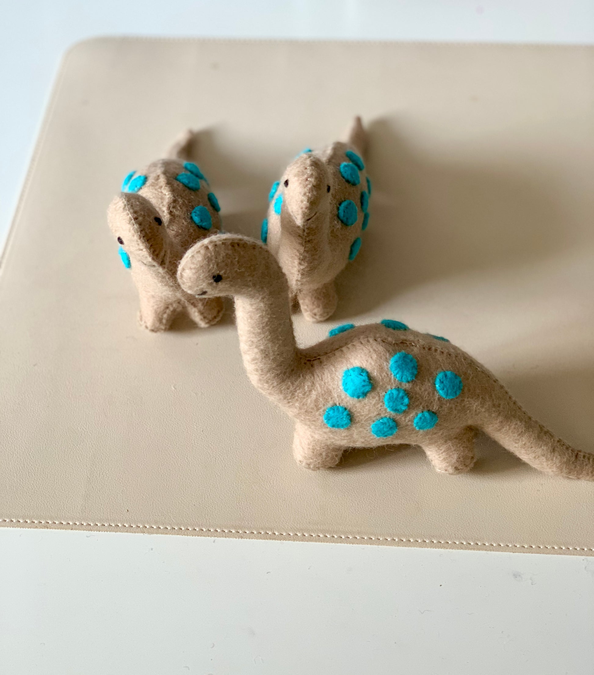 Each dinosaur is handmade, fair trade from Nepal, 100% pure organic wool. They are approximately 23x15x6cm.