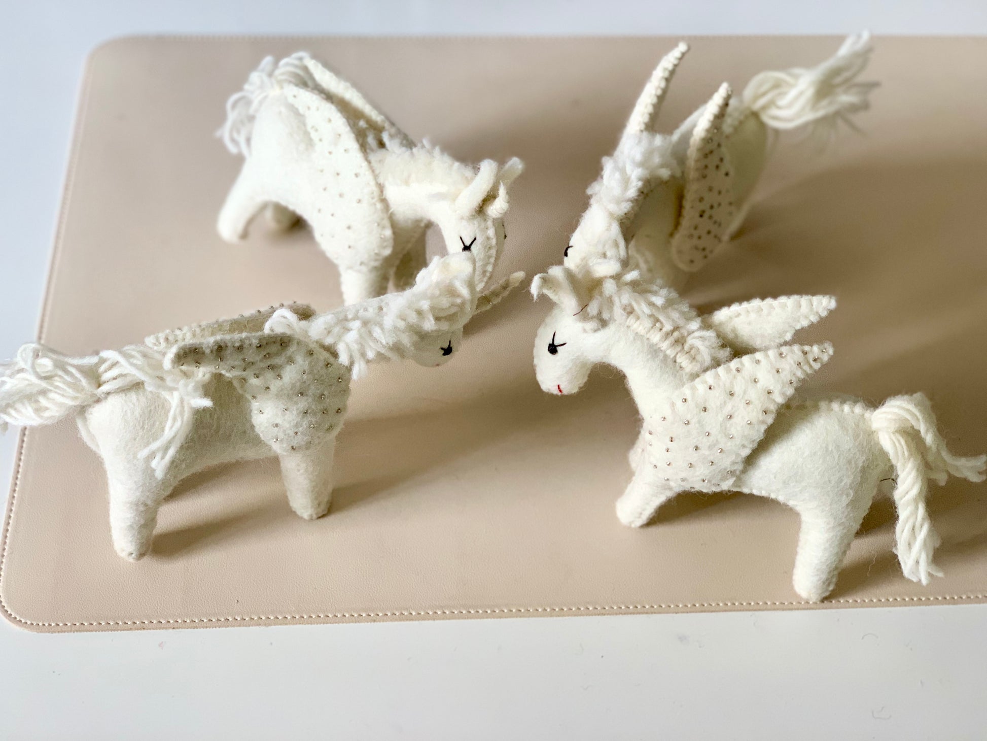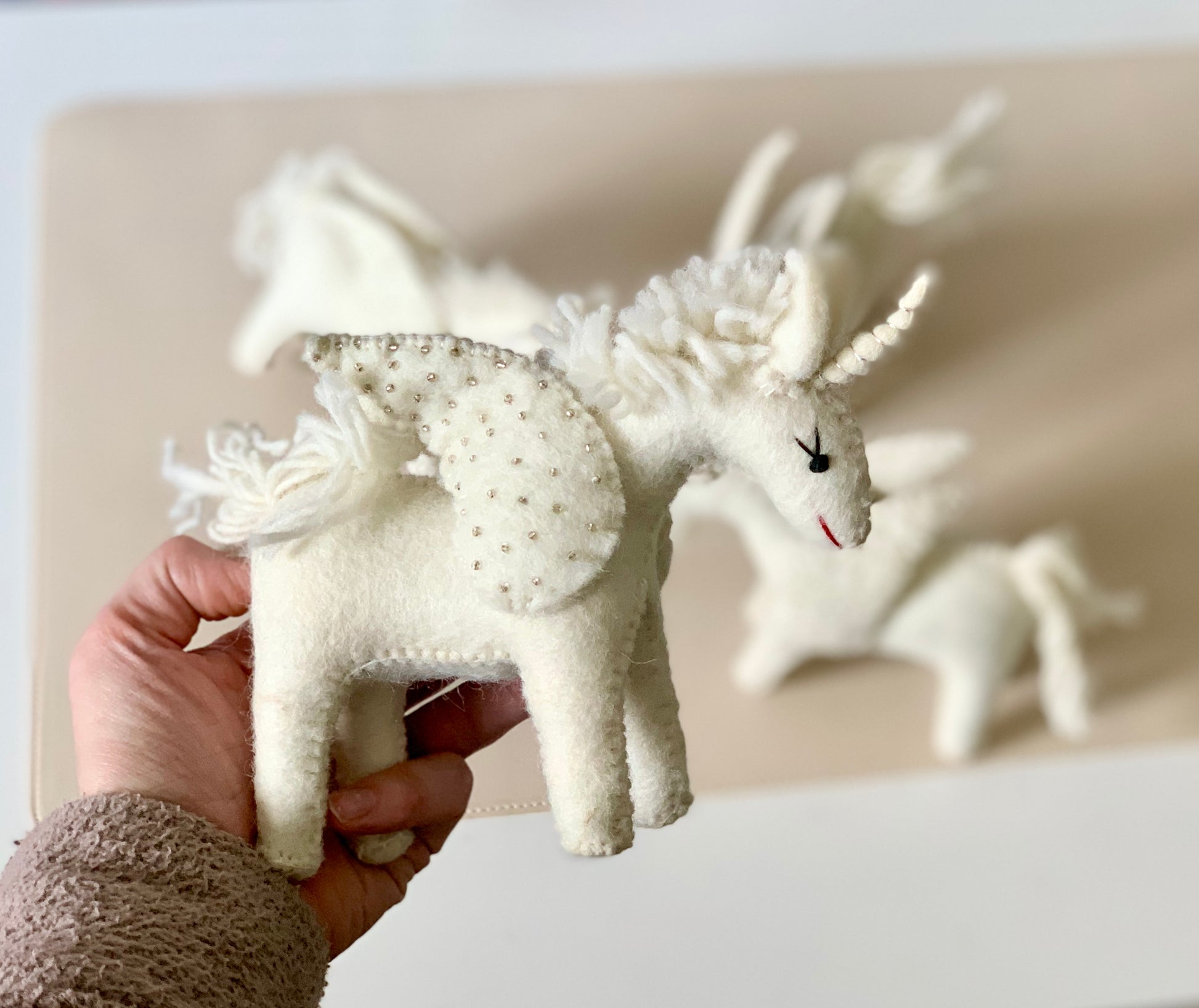 Each unicorn is handmade, fair trade from Nepal, 100% pure organic wool. They are approximately 17x14x6cm.