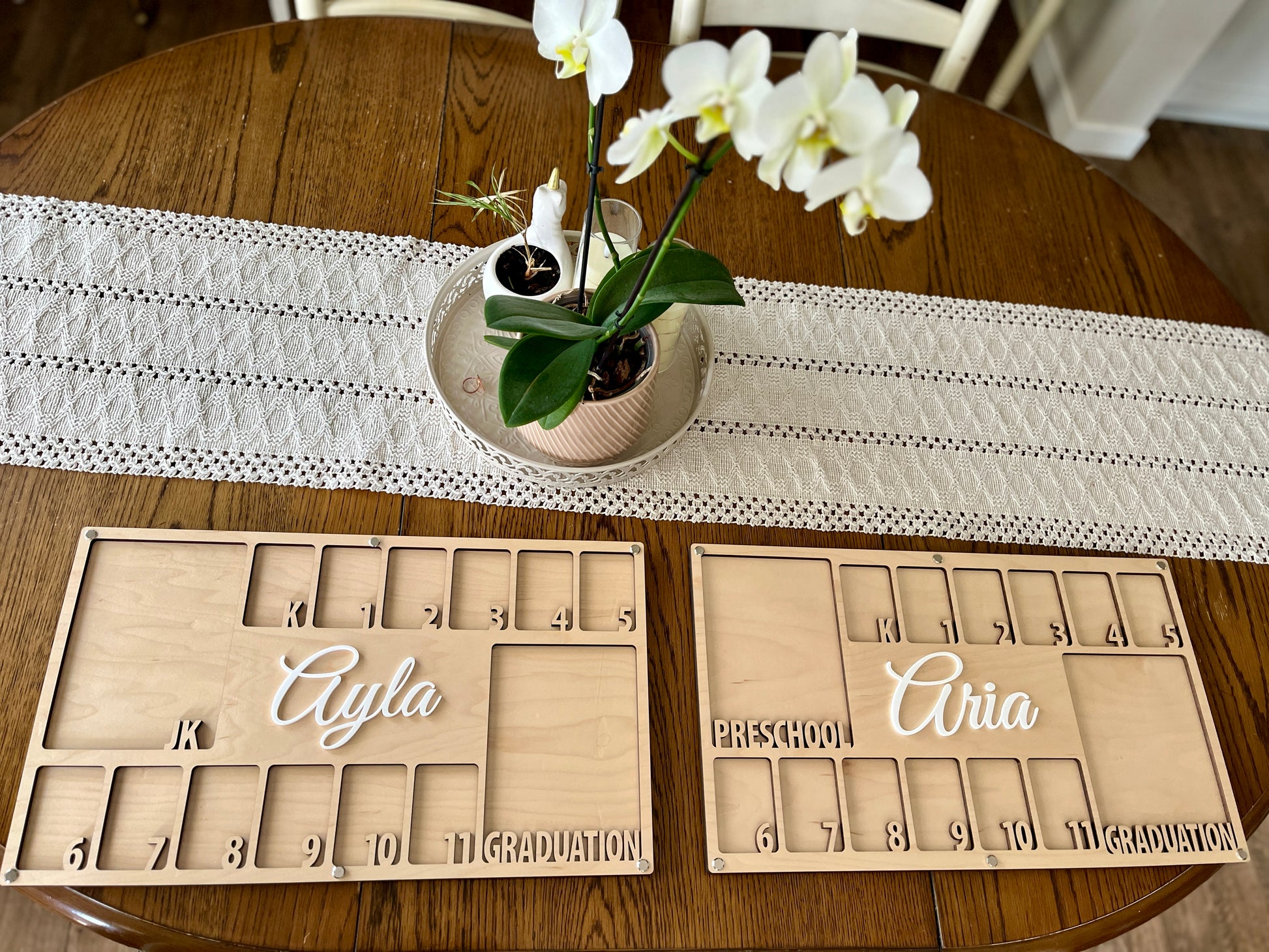 This customizable wooden photo frame features 12 small openings labeled Kindergarten through Grade 11, plus 2 slots for Preschool/PreK/JK and Graduation photos. Add your child’s school pictures each year to watch their transformation unfold in one meaningful display.