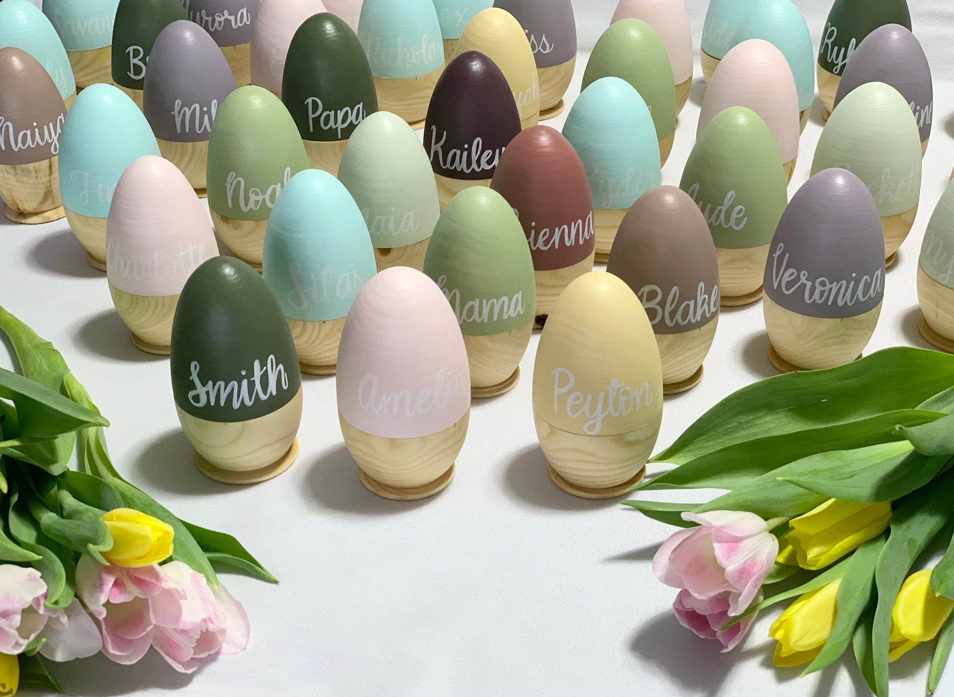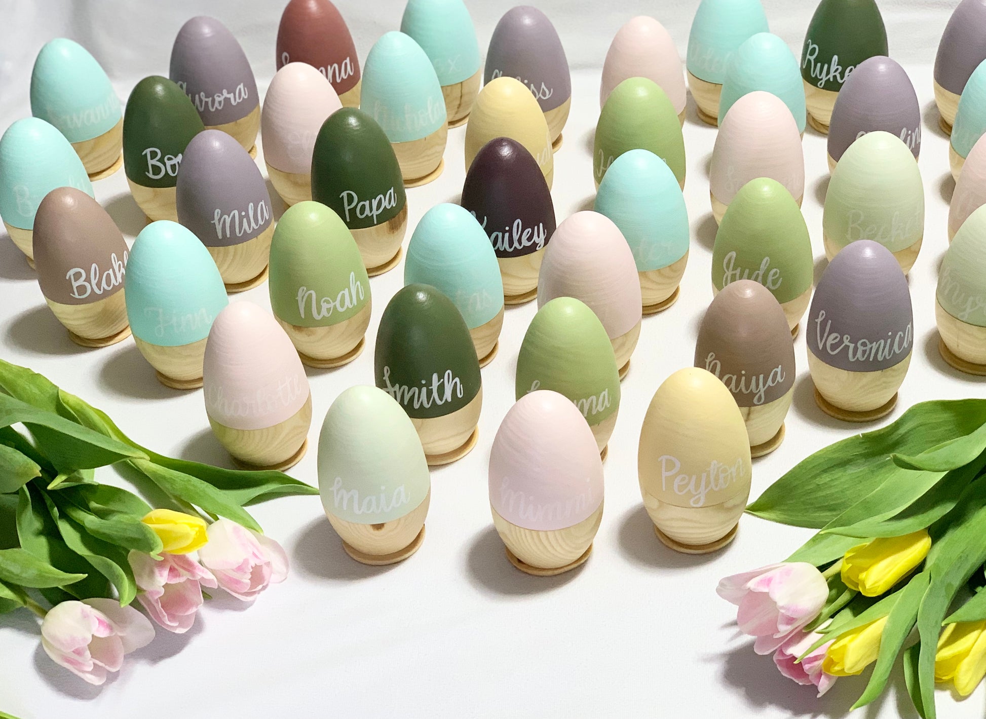 The top half is painted the colour of your choice, and each name has been free hand painted on. Please choose from the colours in the photo and leave a note in the the personalization options area. I am so excited to paint these for you!