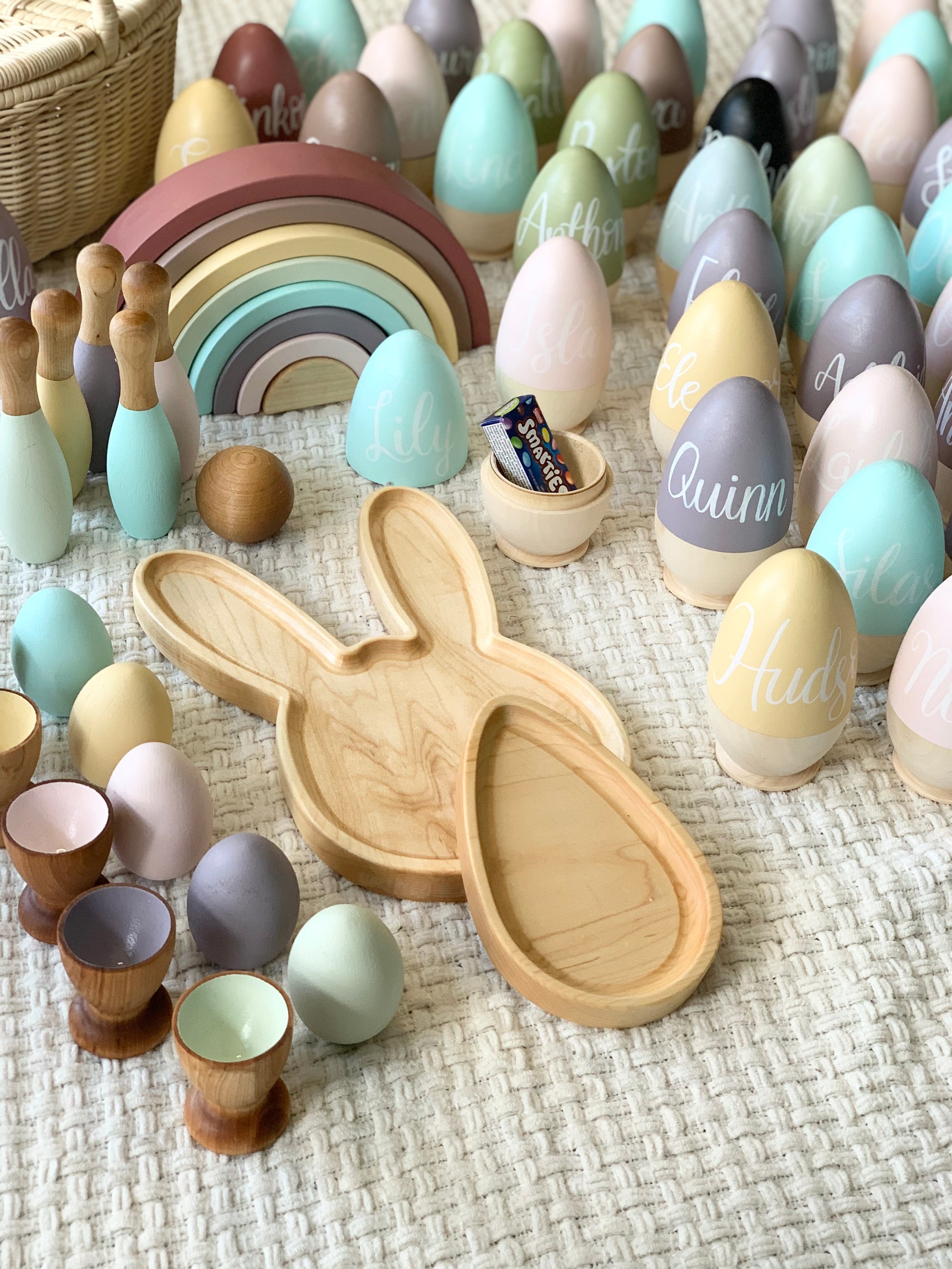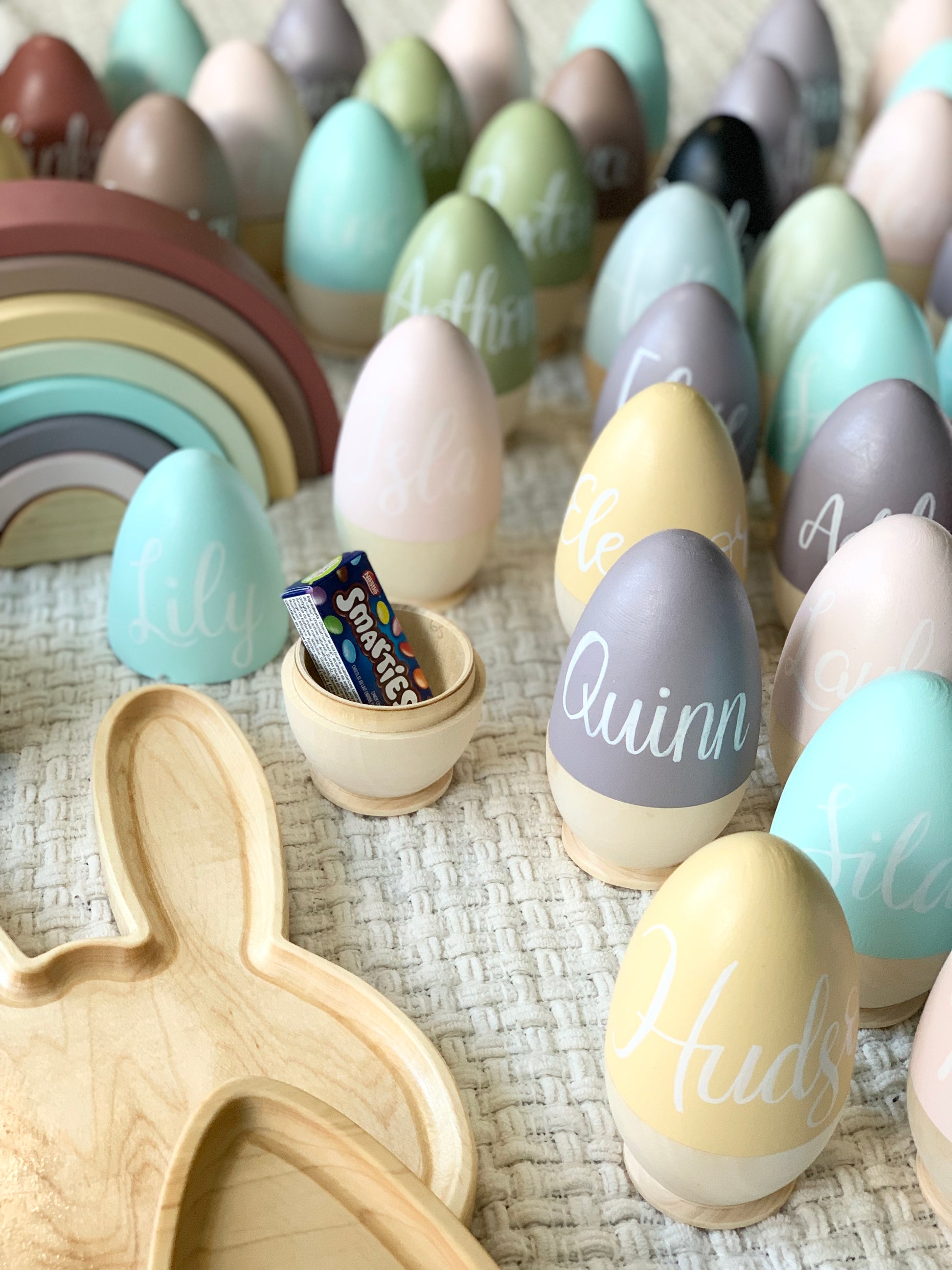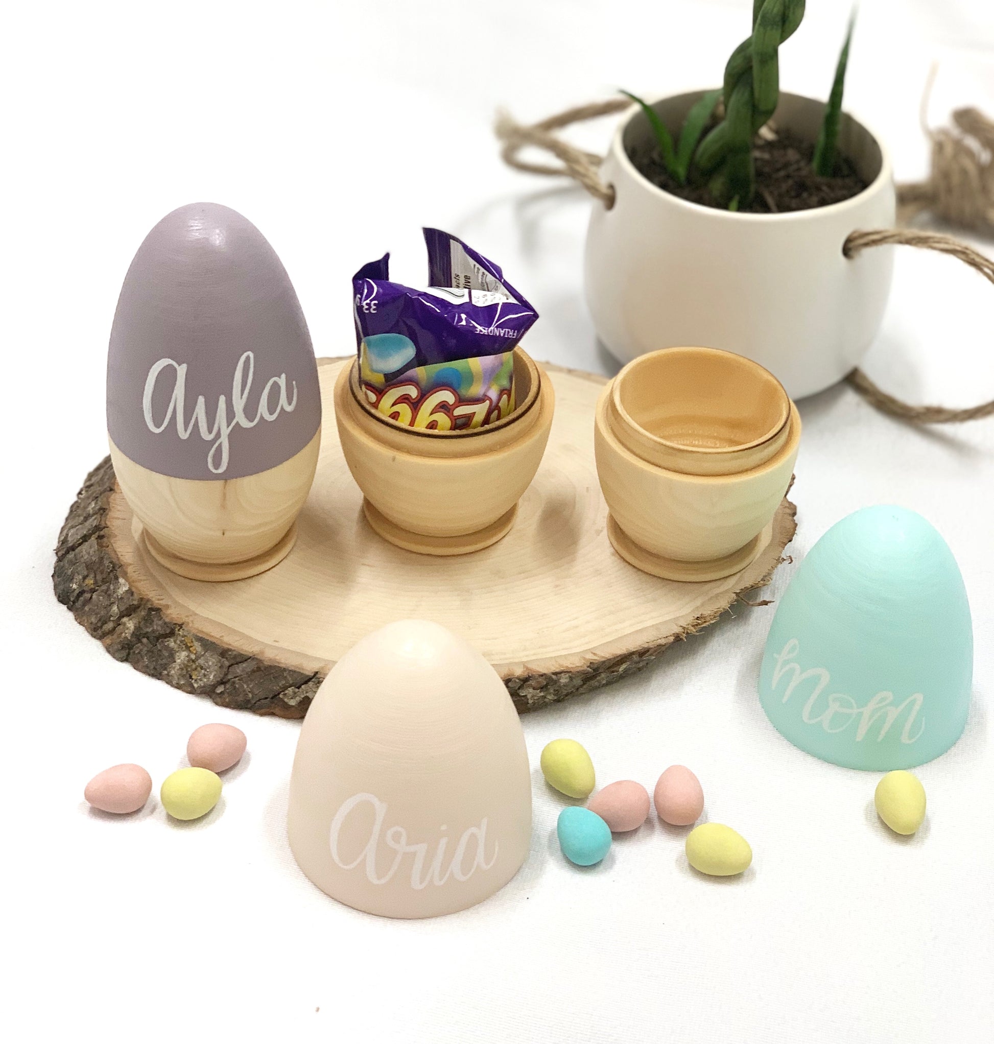 Our Personalized Wooden Hollow Eggs are the perfect gift for your little one this Easter. Reduce waste by buying this special keepsake item that can be used year after year. Fill it with chocolate, our smaller personalized eggs, or any kind of goodies of your choice. Our baby bunnies fit inside too!