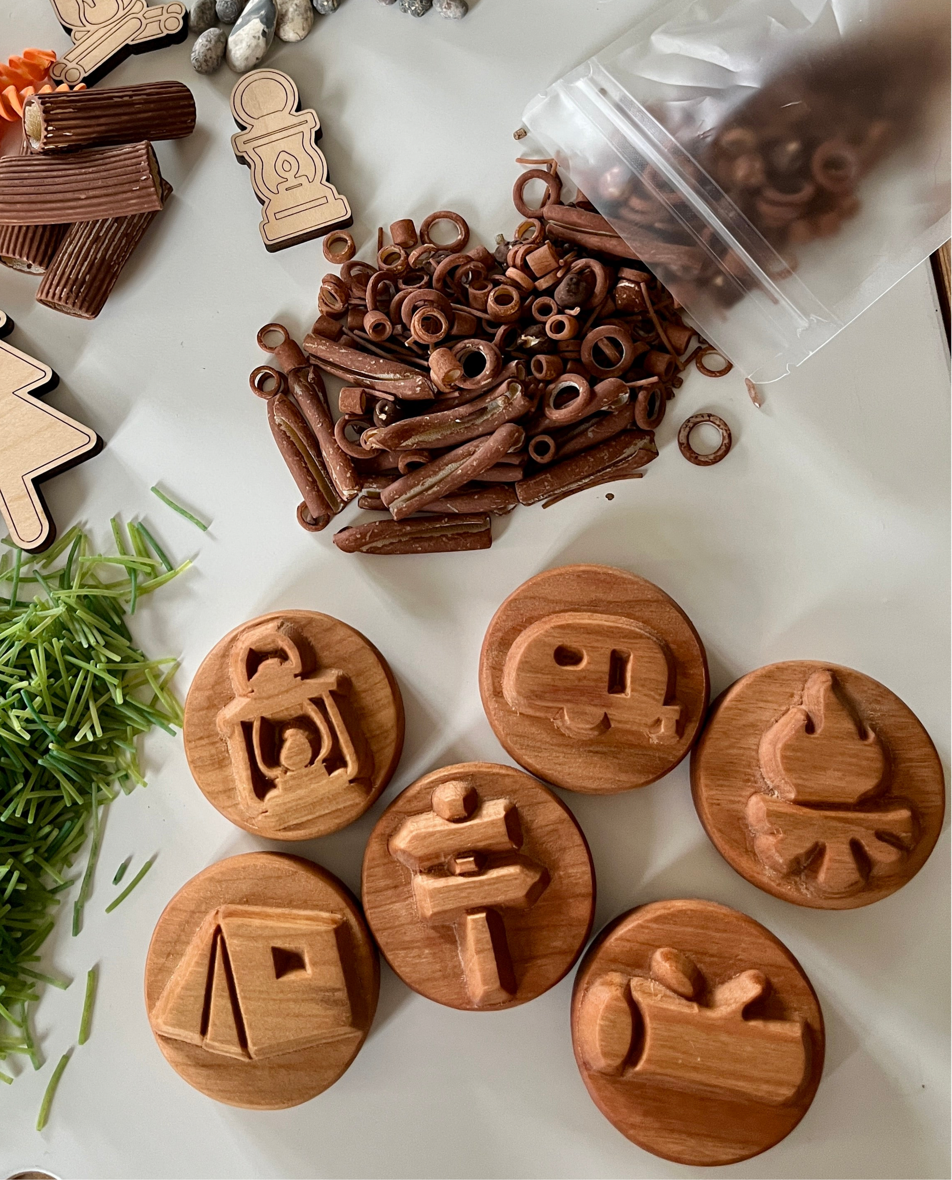 Each Stamp has the corresponding image laser engraved on the top, making them easy to find and use. They are made from cherry wood, and are 2 inches round and 3/4” deep — perfect size for little hands!