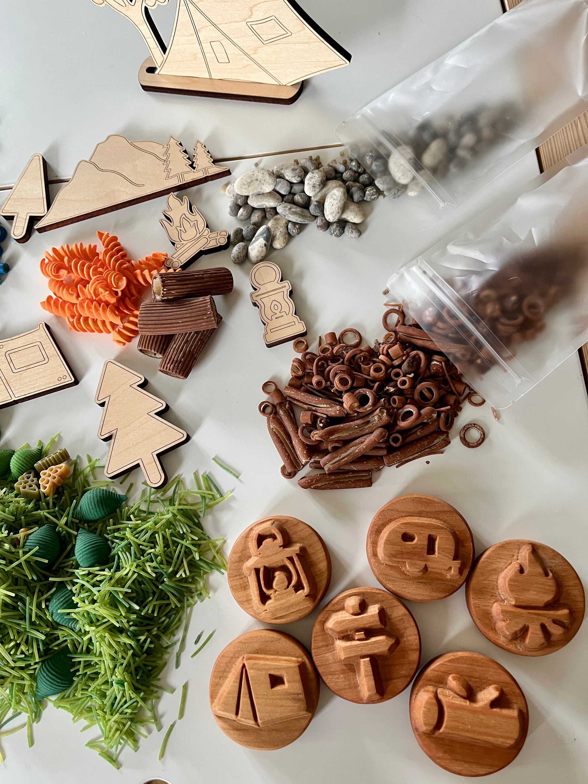 These play dough stamper sets can also be used in other fun materials such as kinetic sand, baking, air dry clay, salt dough.