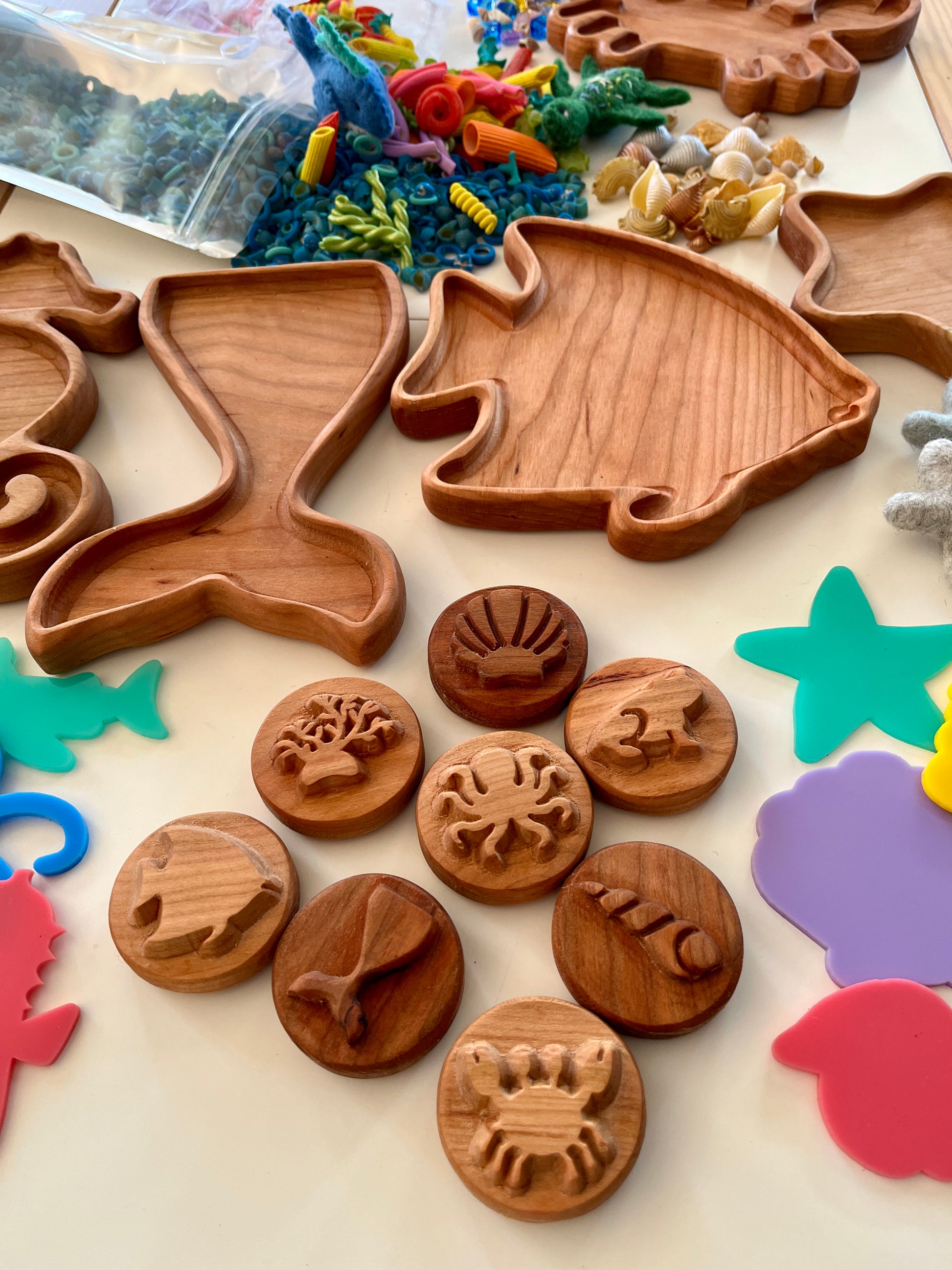 Each Stamp has the corresponding image laser engraved on the top, making them easy to find and use. They are made from cherry wood, and are 2 inches round and 3/4” deep — perfect size for little hands!