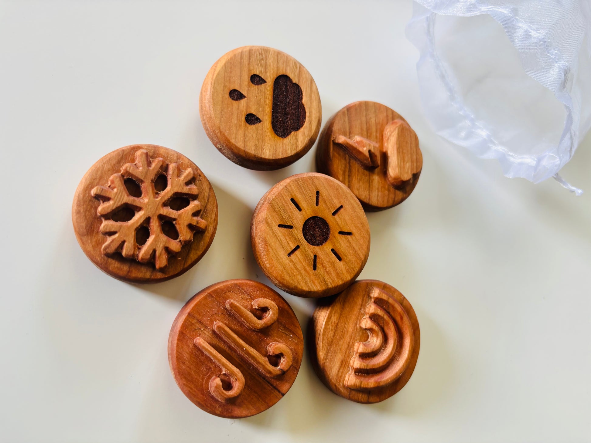 Hello from our beautifully crafted hardwood play dough stamps! Explore our range of ferocious lightning clouds, radiant suns, delightful rainbows, fluffy snowflakes, windy days, and pitter-pattering raindrops—all meticulously handcrafted from sustainable wood. These charming stamps are perfect for sparking creativity and imaginative play, allowing children to craft their own weather-inspired scenes with ease. Each stamp is carefully made for durability and safe, eco-friendly play. Join us in celebrating the wonders of nature through the magic of play dough!