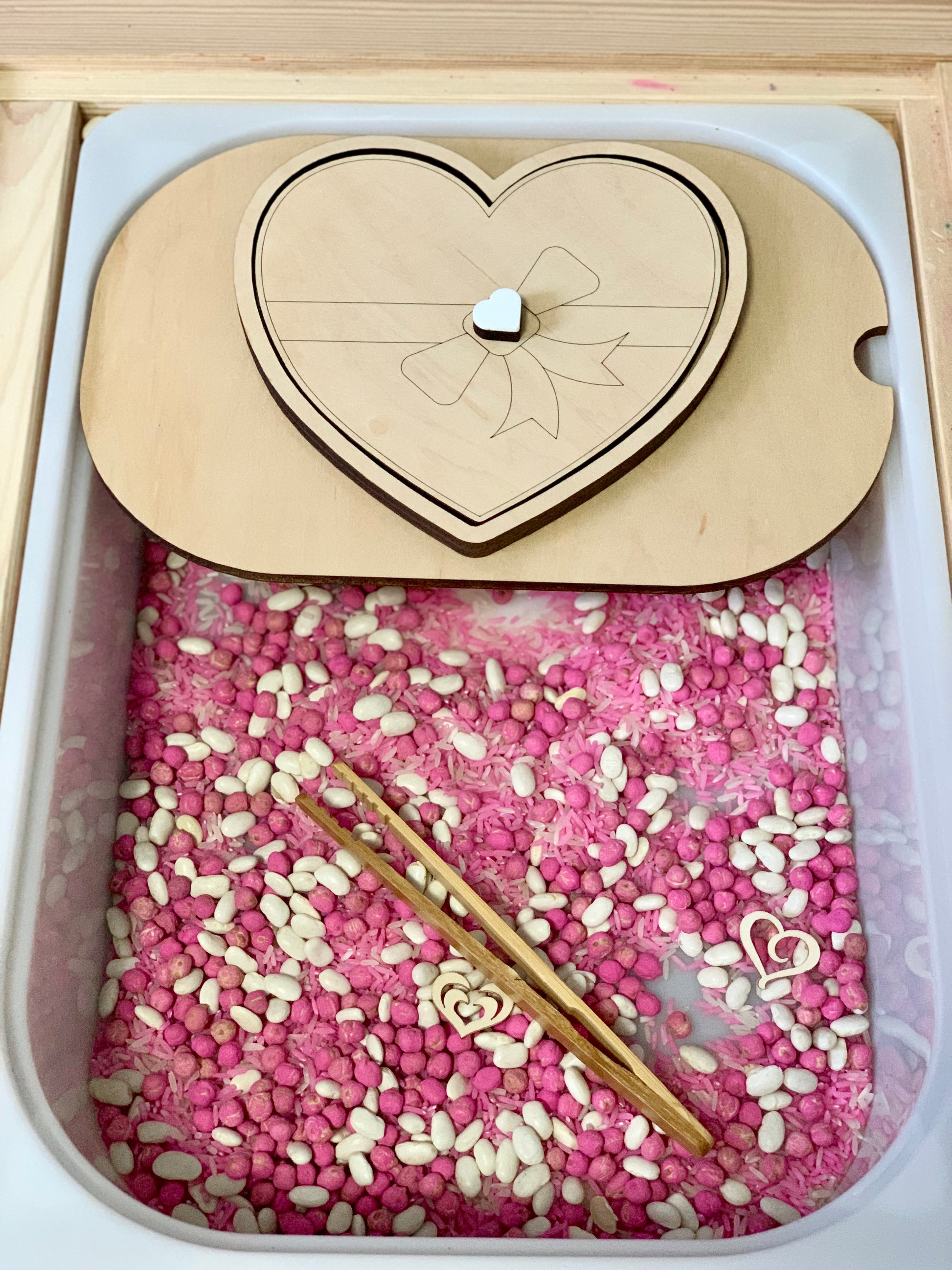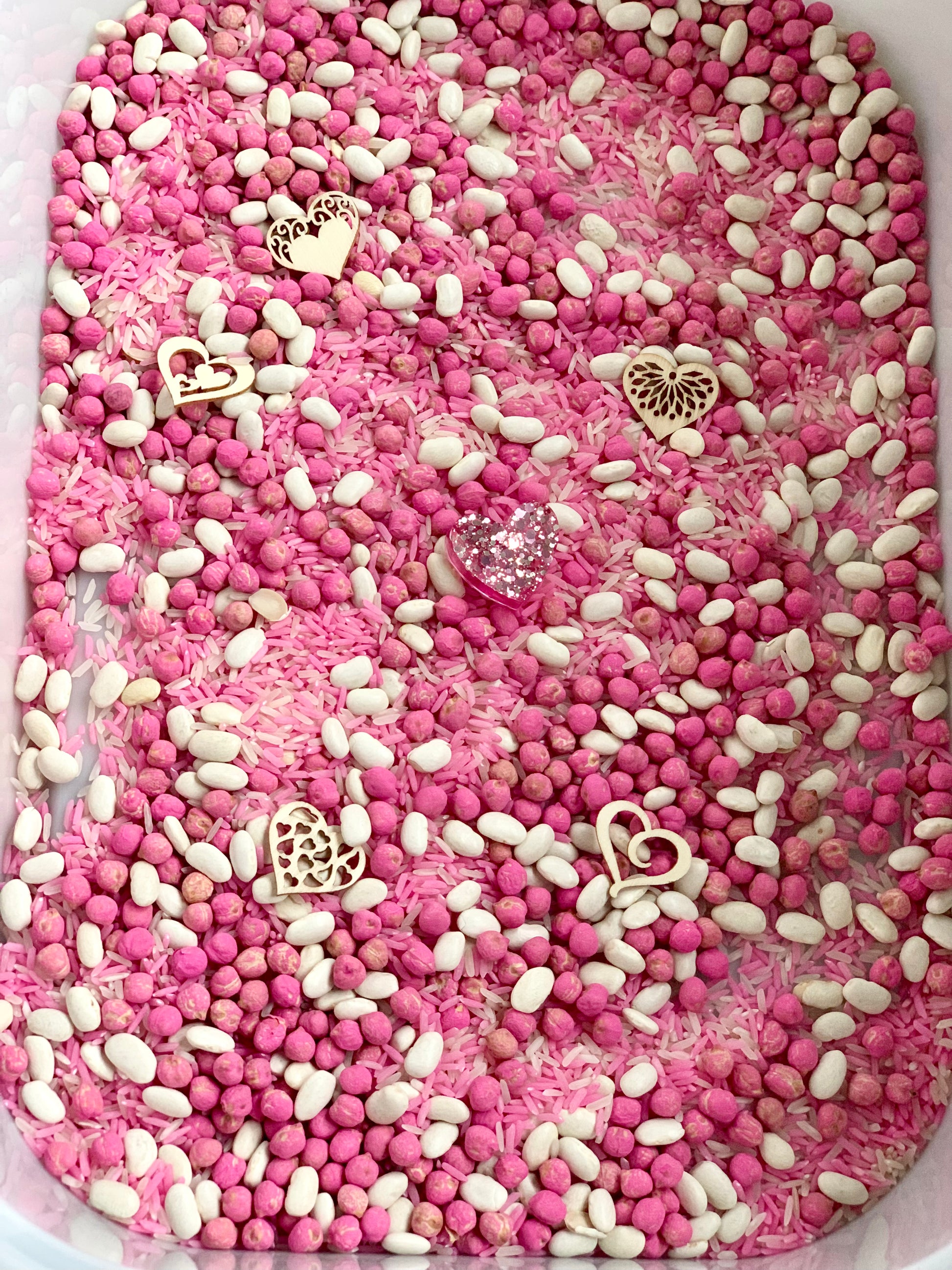 Each Kit comes with 5 cups of filler and loose parts. 5 cups is enough to cover the bottom of a large Trofast bin. They are layered in a large bag and the loose parts come in a separate bag. This kit comes with everything pictured which is the sensory filler and wooden hearts