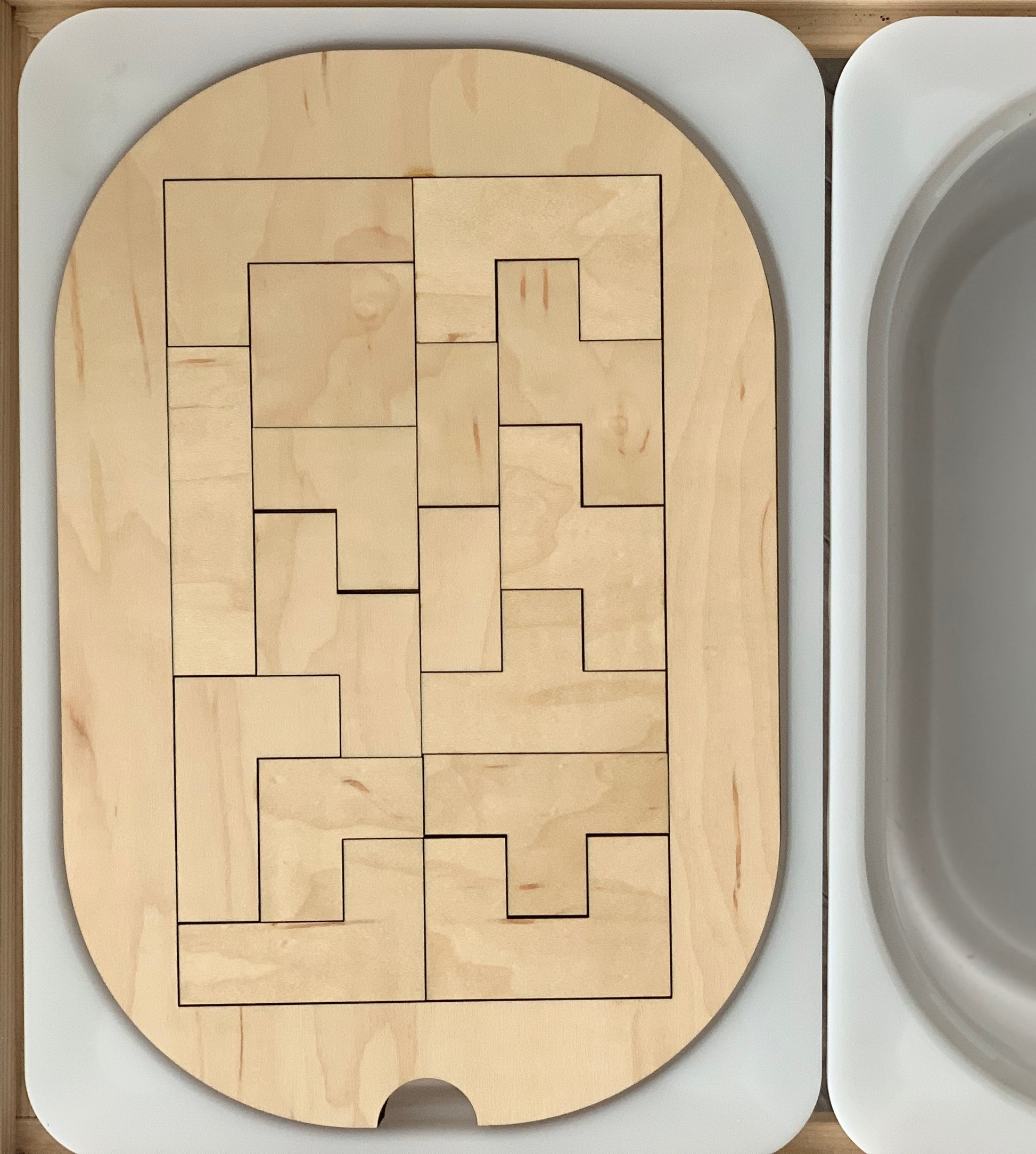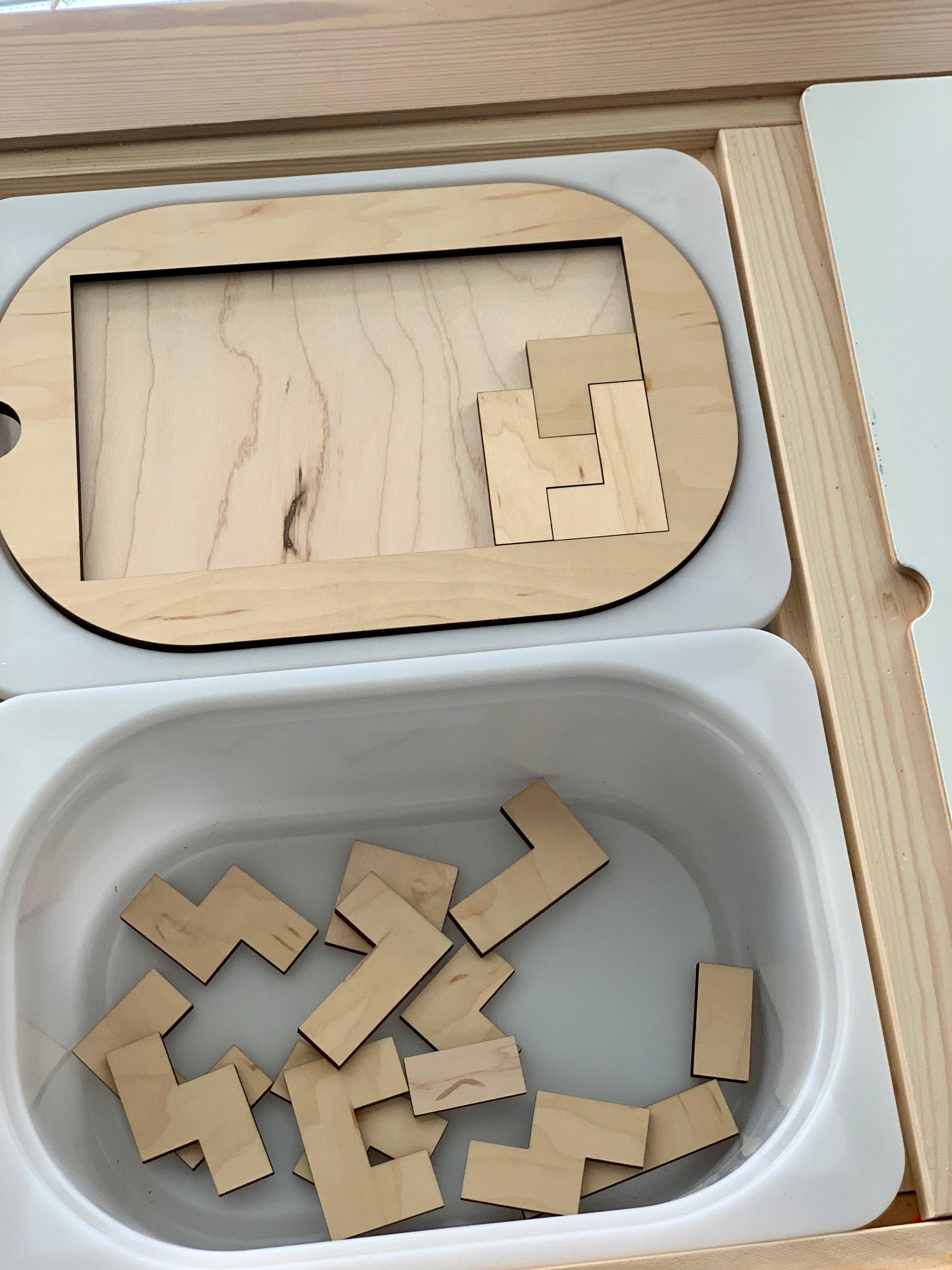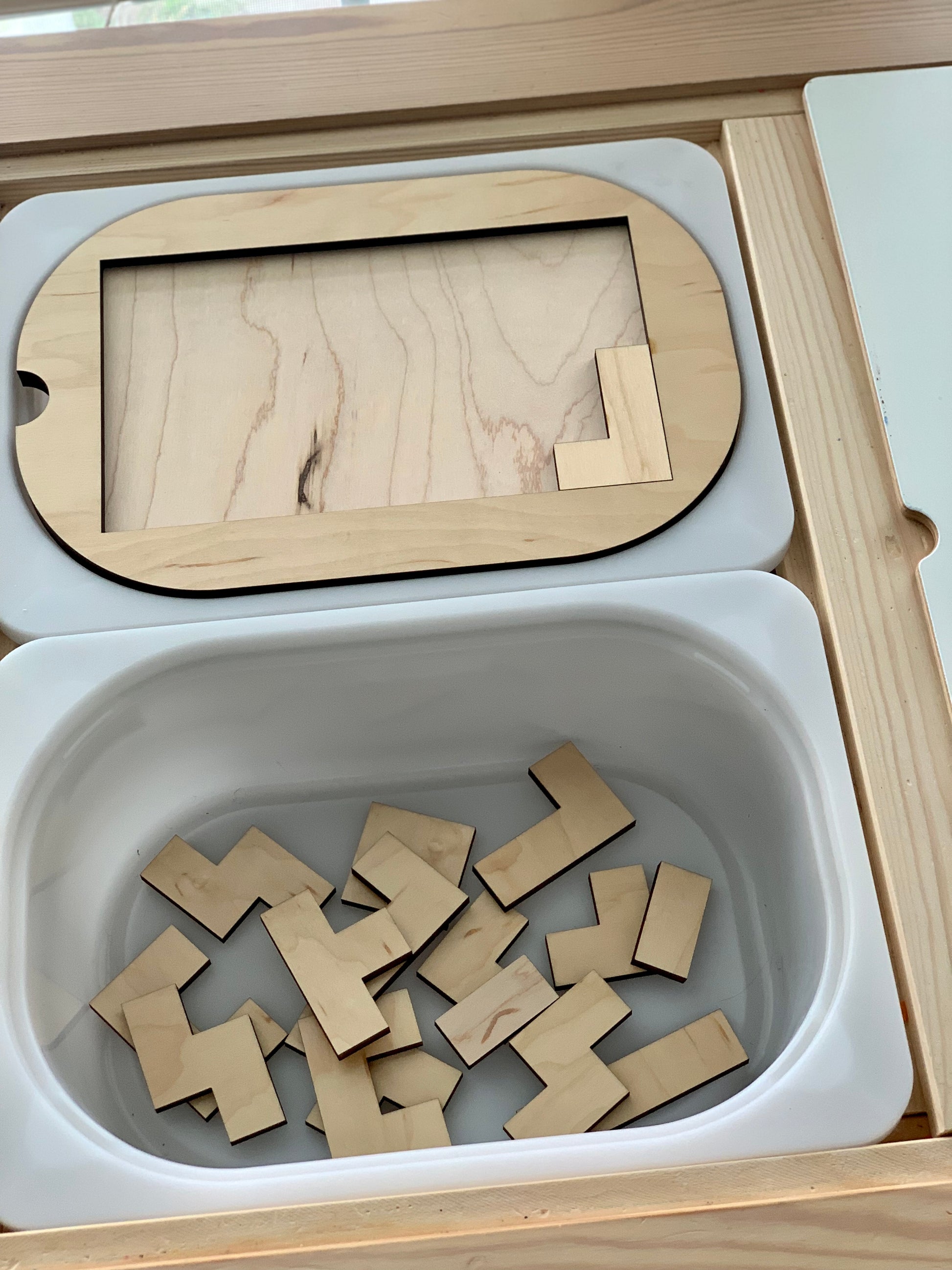 These Flisat inserts/table tops are made to fit the Trofast / Flisat bins. Pictured here is the SMALL size bin insert. The Large comes with more pieces in the puzzle than the small.