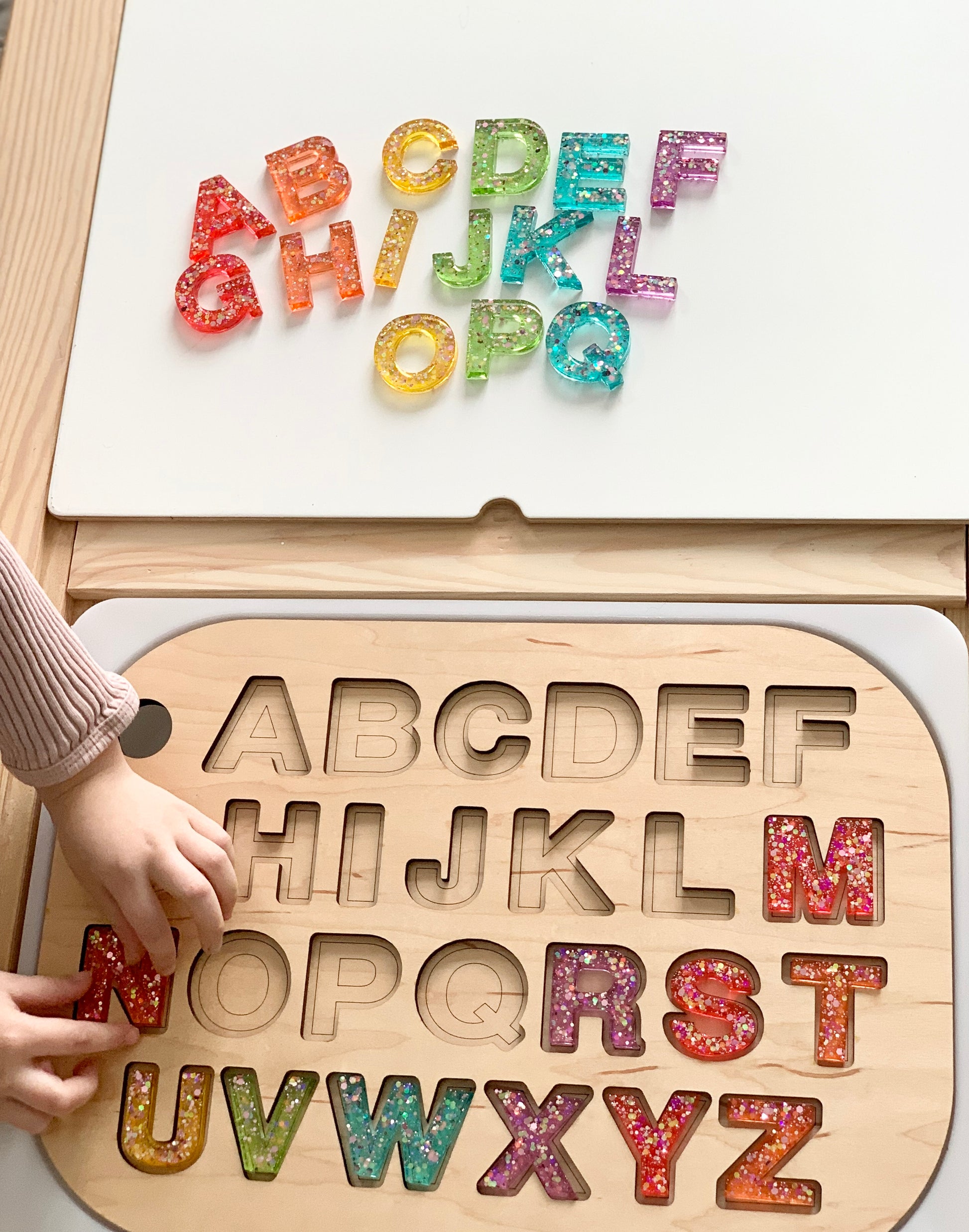 Alphabet set features uppercase A-Z, making up a full 26-piece set that comes in a drawstring bag for safekeeping & storage. Made with love by Dreamy Ink Art in Ontario, Canada. Each set is made individually , and the level of colour tint may vary. Minor air bubbles may occur. Find the matching puzzle insert here — it also fits into the Flisat Table & Trofast Bins!
