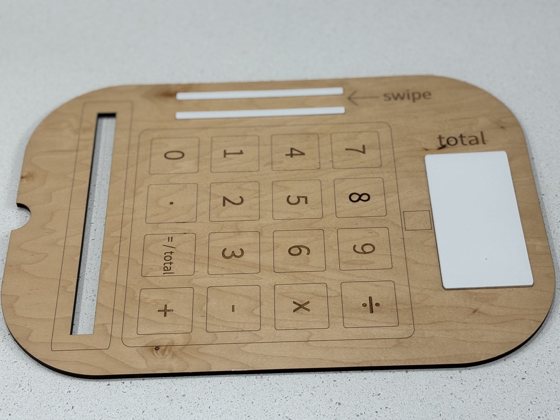 This insert is designed to fit the large Flisat/Trofast bin. This Cash Register has a dry erase “total” and add ons of credit card, and money.