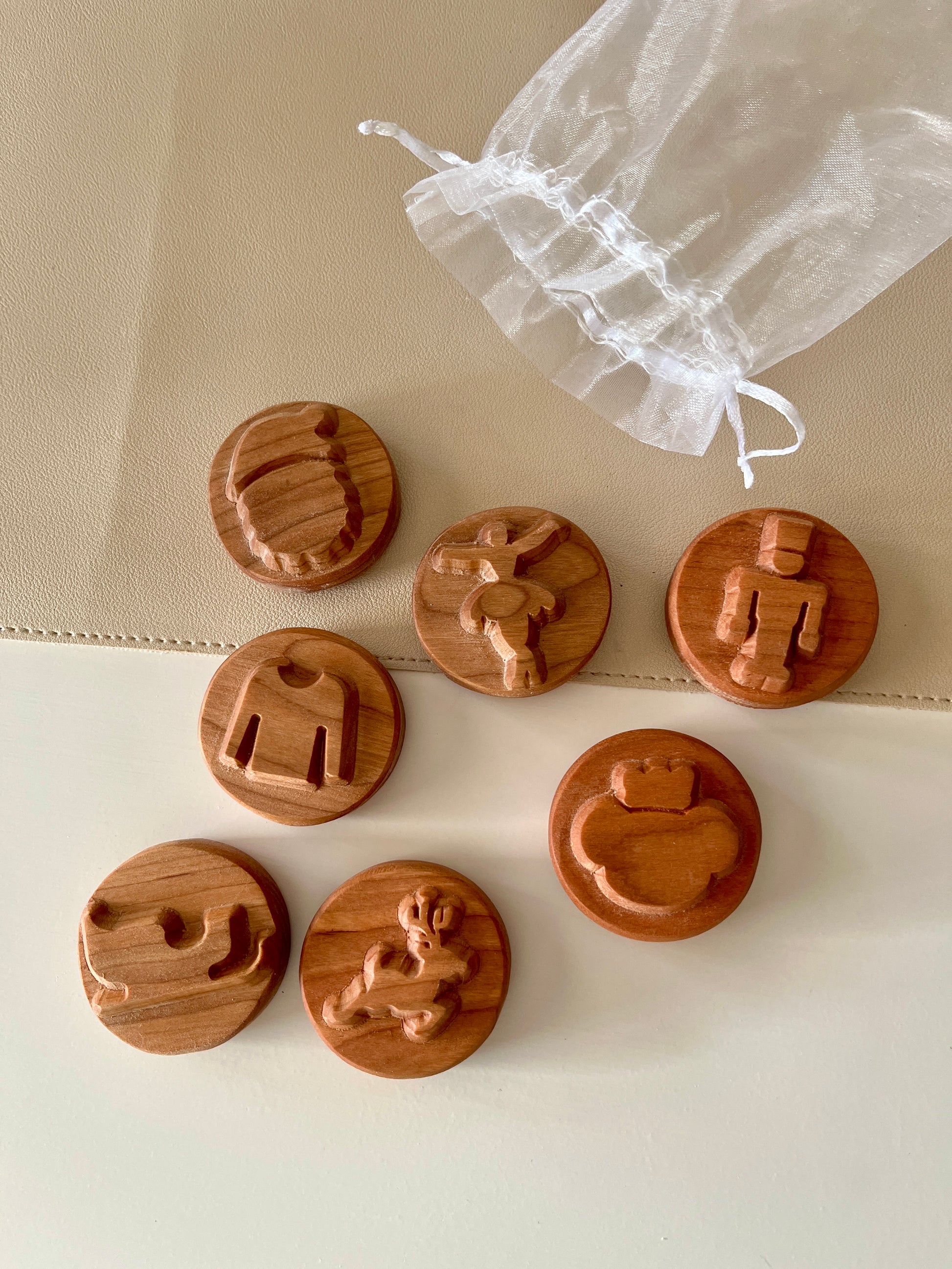 Each Stamp has the corresponding image laser engraved on the top, making them easy to find and use. They are made from cherry wood, and are 2 inches round and 3/4” deep — perfect size for little hands!