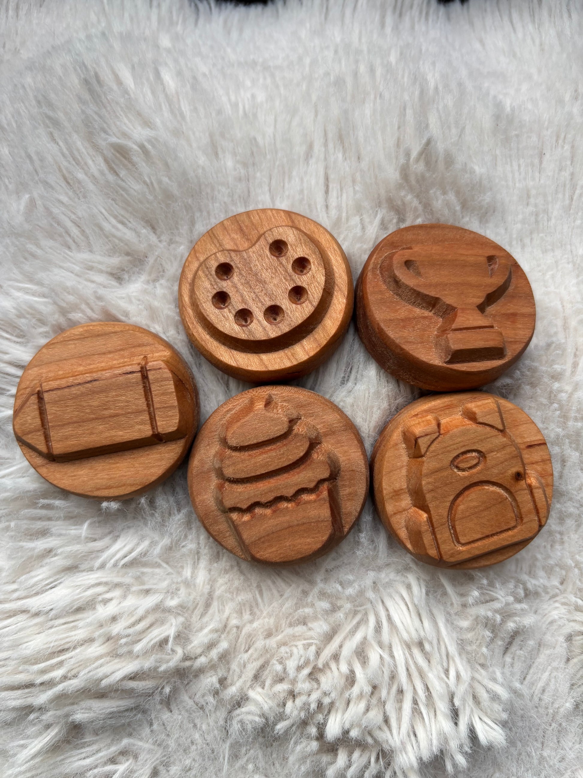 Each Stamp has the corresponding image laser engraved on the top, making them easy to find and use. They are made from cherry wood, and are 2 inches round and 3/4” deep — perfect size for little hands!