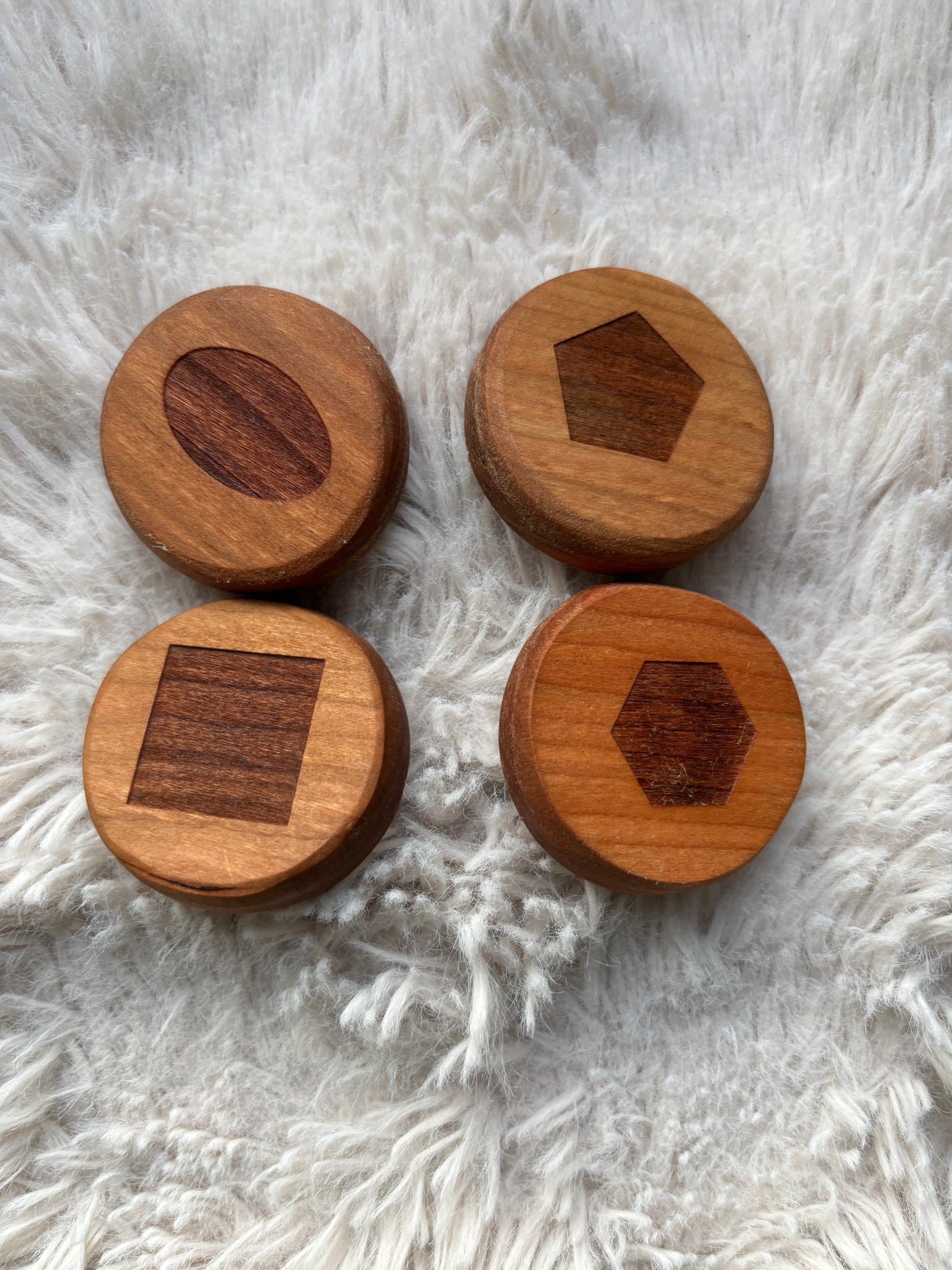 Each Stamp has the corresponding image laser engraved on the top, making them easy to find and use. They are made from cherry wood, and are 2 inches round and 3/4” deep — perfect size for little hands!