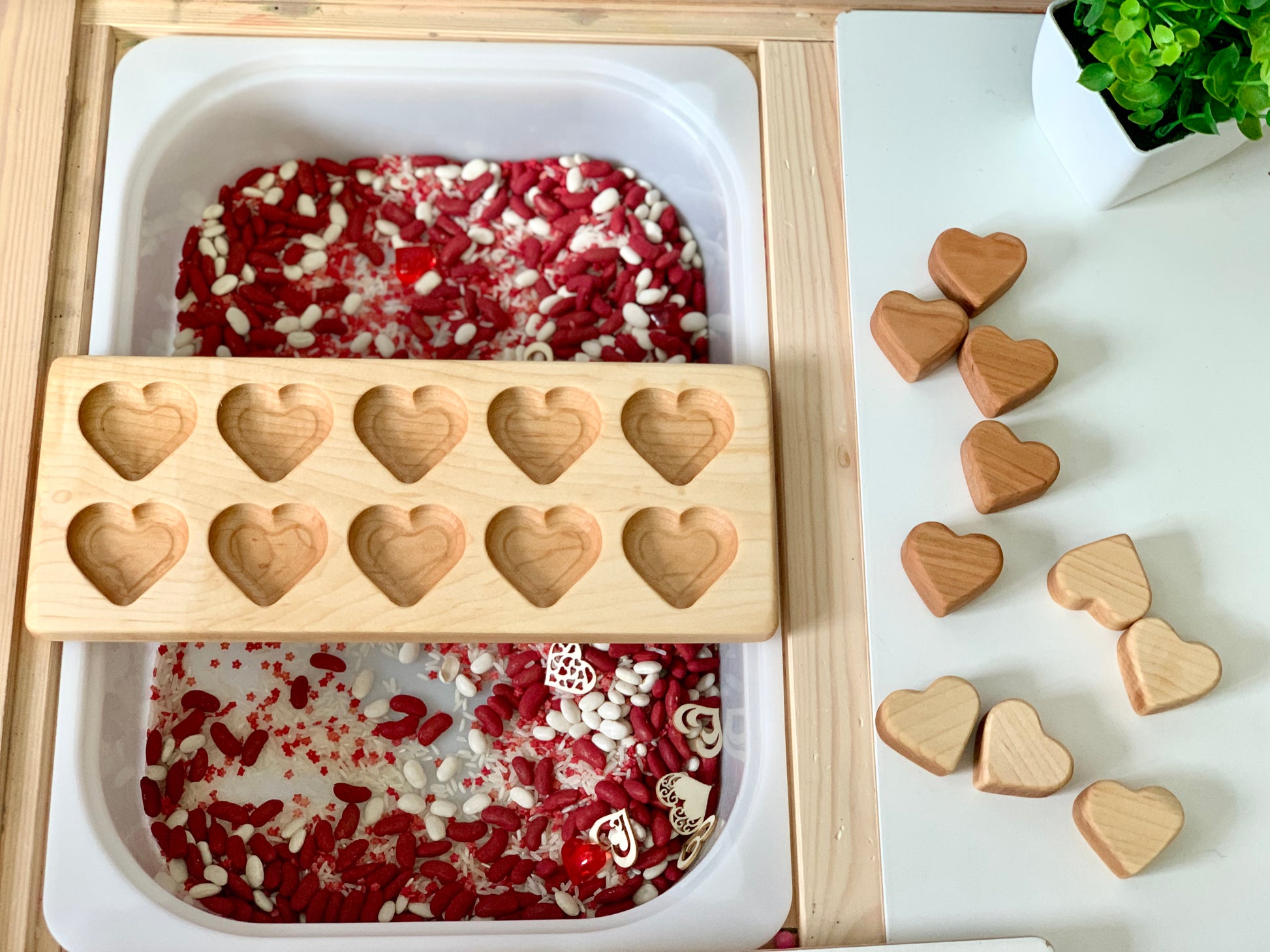Each Kit comes with 5 cups of filler and loose parts. 5 cups is enough to cover the bottom of a large Trofast bin. They are layered in a large bag and the loose parts come in a separate bag. This kit comes with everything pictured which is the sensory filler, acrylic and wooden hearts.