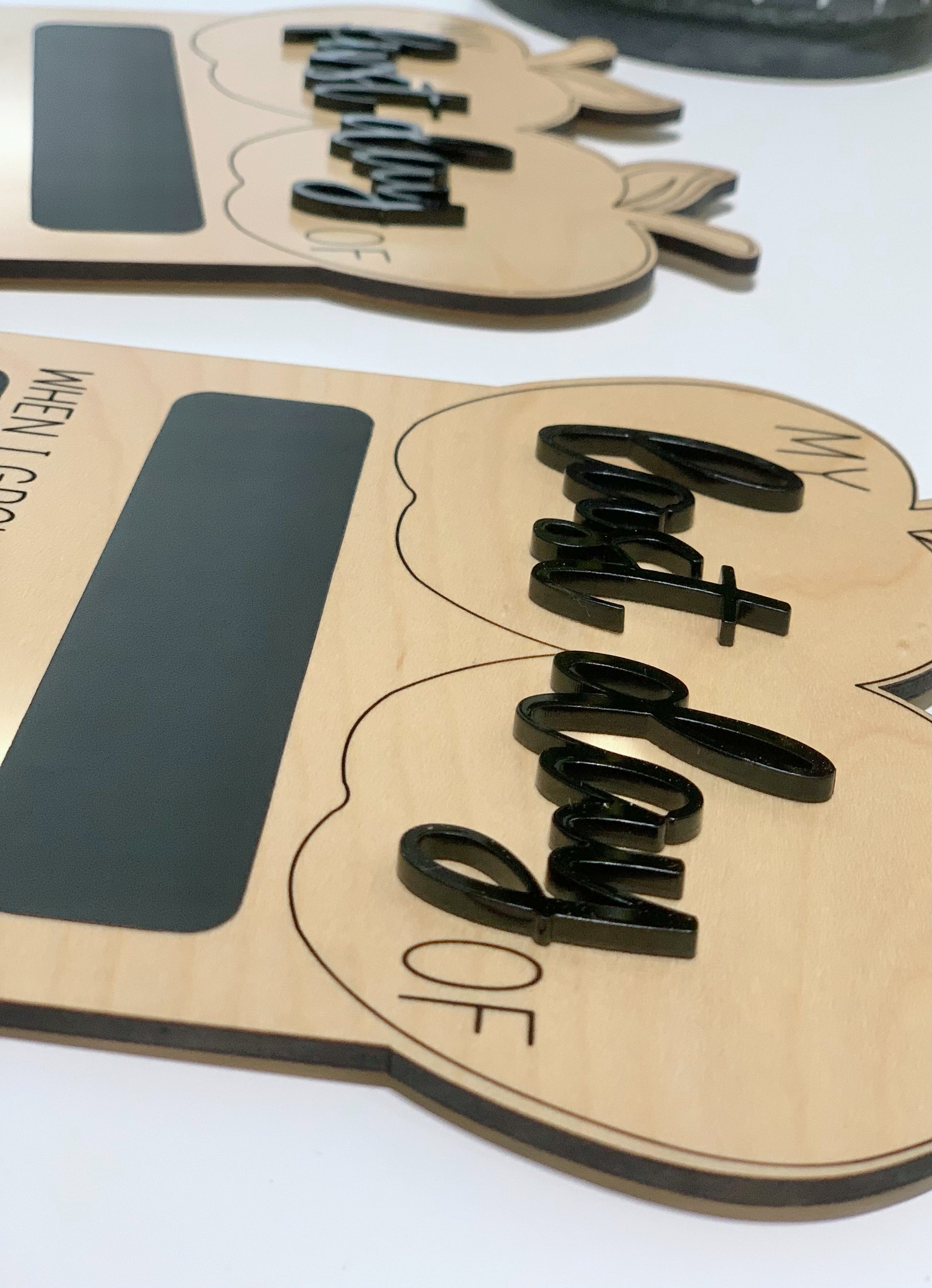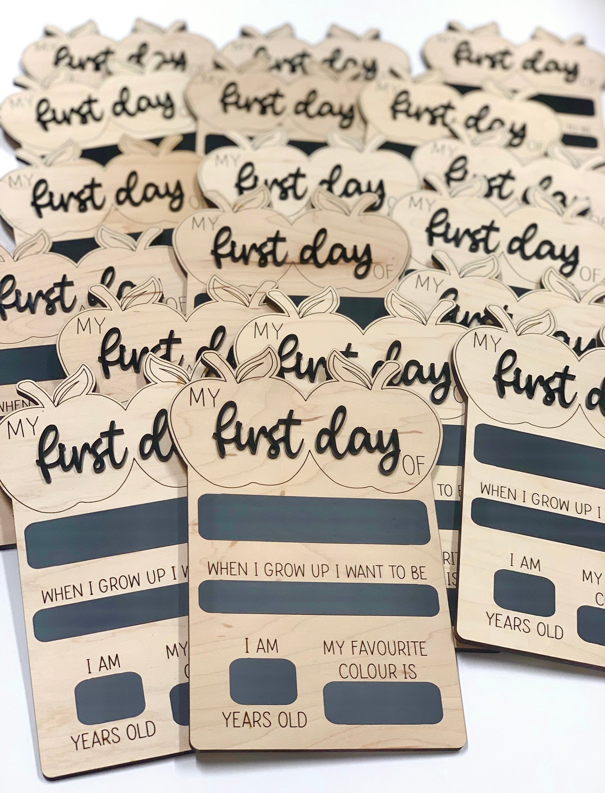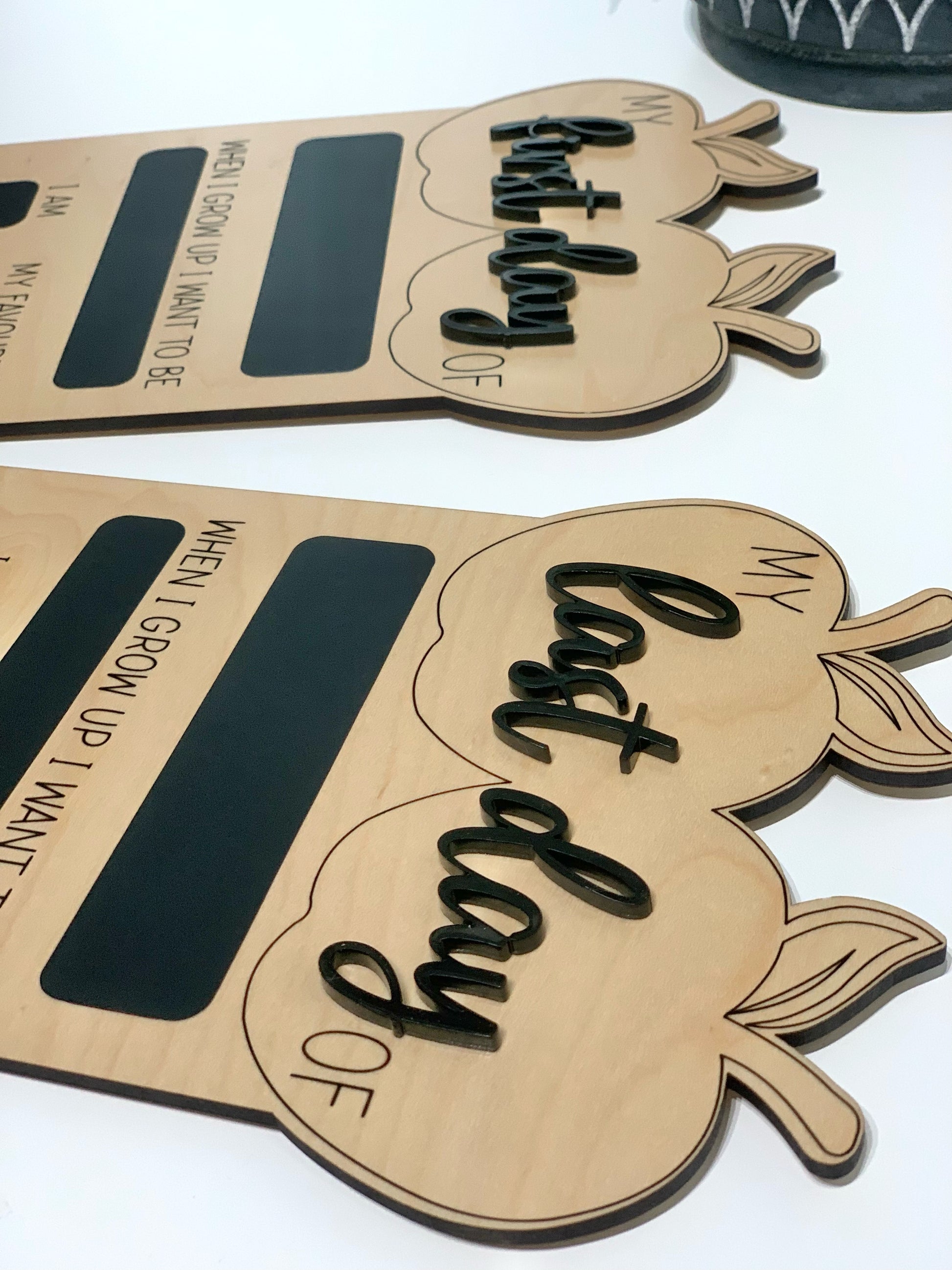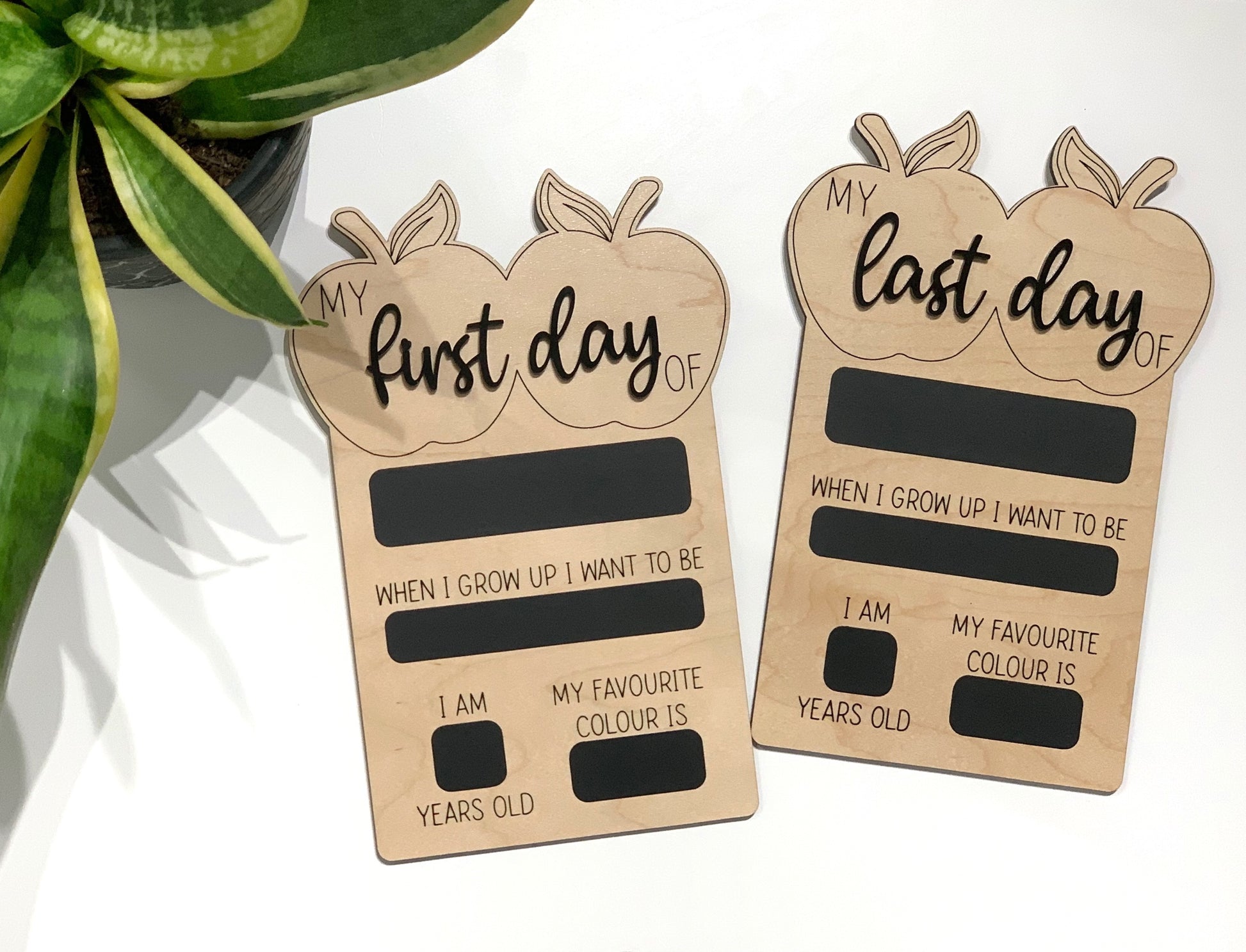 These are 9x6 reversible boards which come with 3d acrylic accent “first/last day” ; and chalkboard writing areas which are easily wiped clean with a wet cloth or wipe and let air dry to be used again and again year after year — or with multiple kiddos.