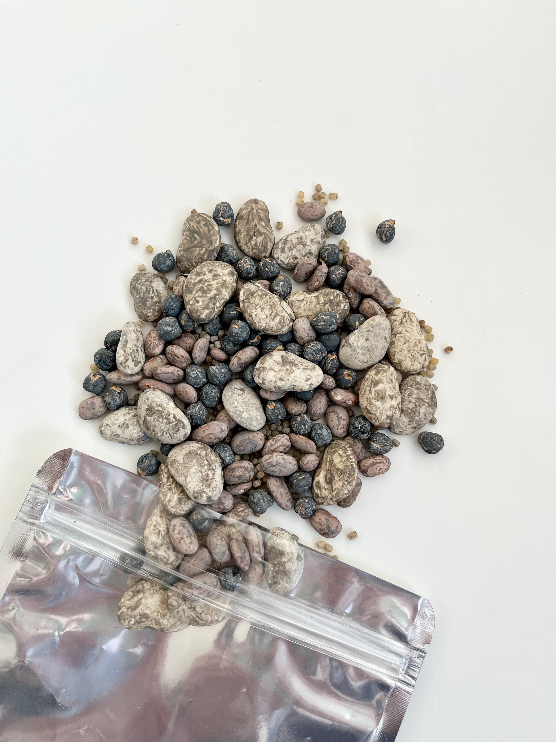 Sensory bin filler — rocks !!! 4 different sensory fillers mixed together to create a fun filler with a variety of different textures. Made from beans, chickpeas and pastas.