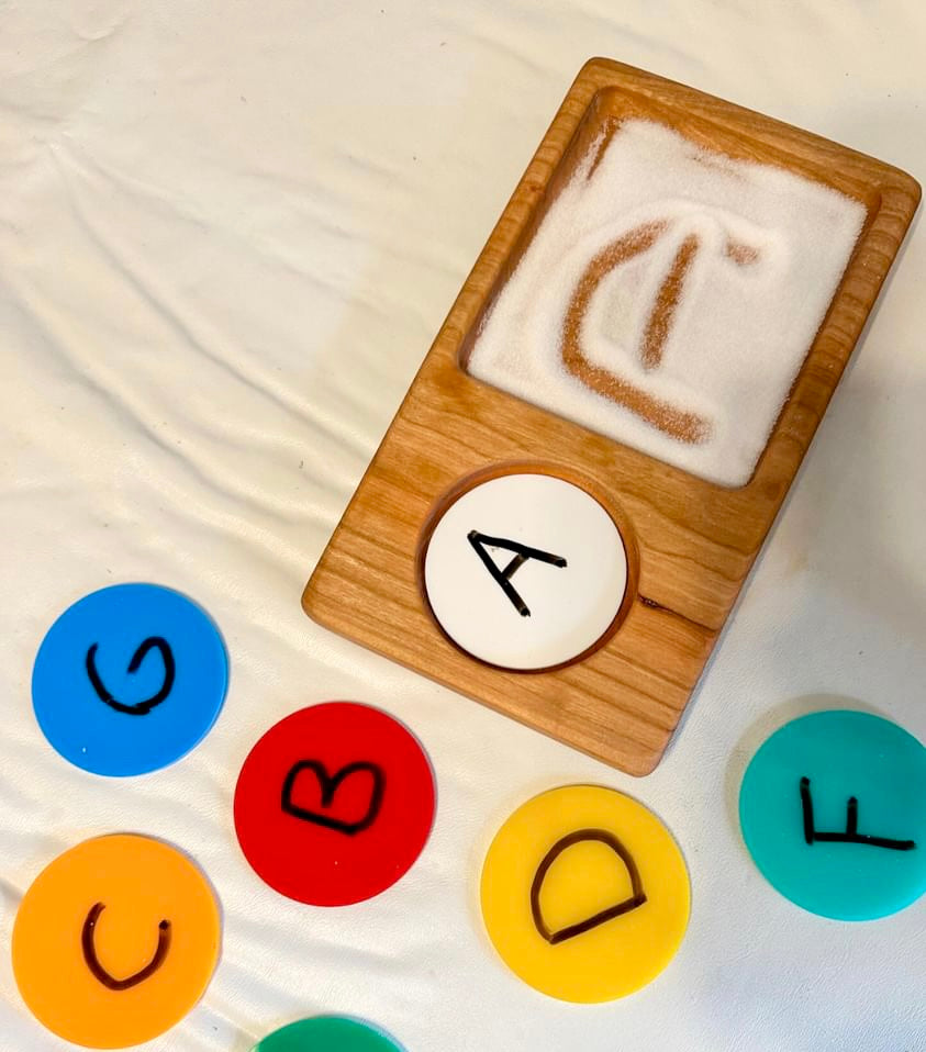Harnessing the tactile joy of sand, your little one can explore letters and numbers in a playful way. Place a letter or number in the top circle and watch as they trace it in the smooth salt below. For numbers or currency, add an extra twist by having them place the corresponding number of pieces or coins in the area below. A sensory adventure that combines creativity, fine motor skills, and numerical understanding.
