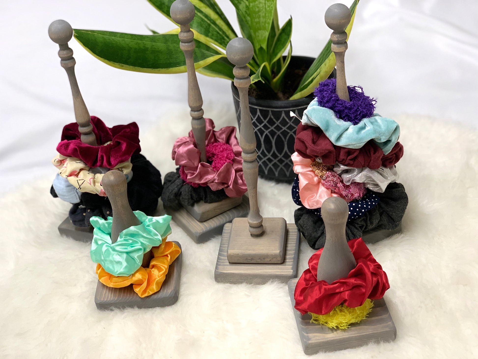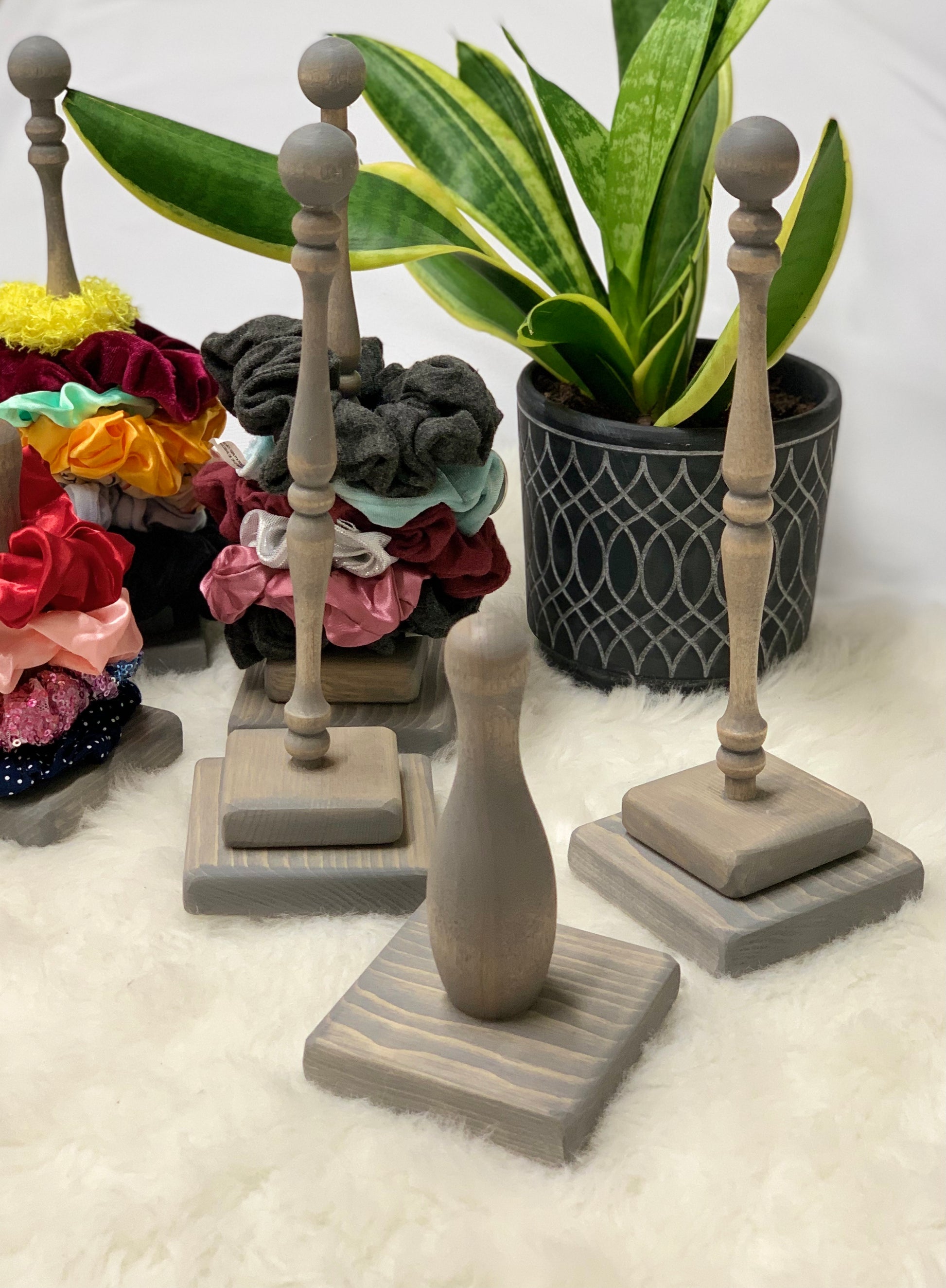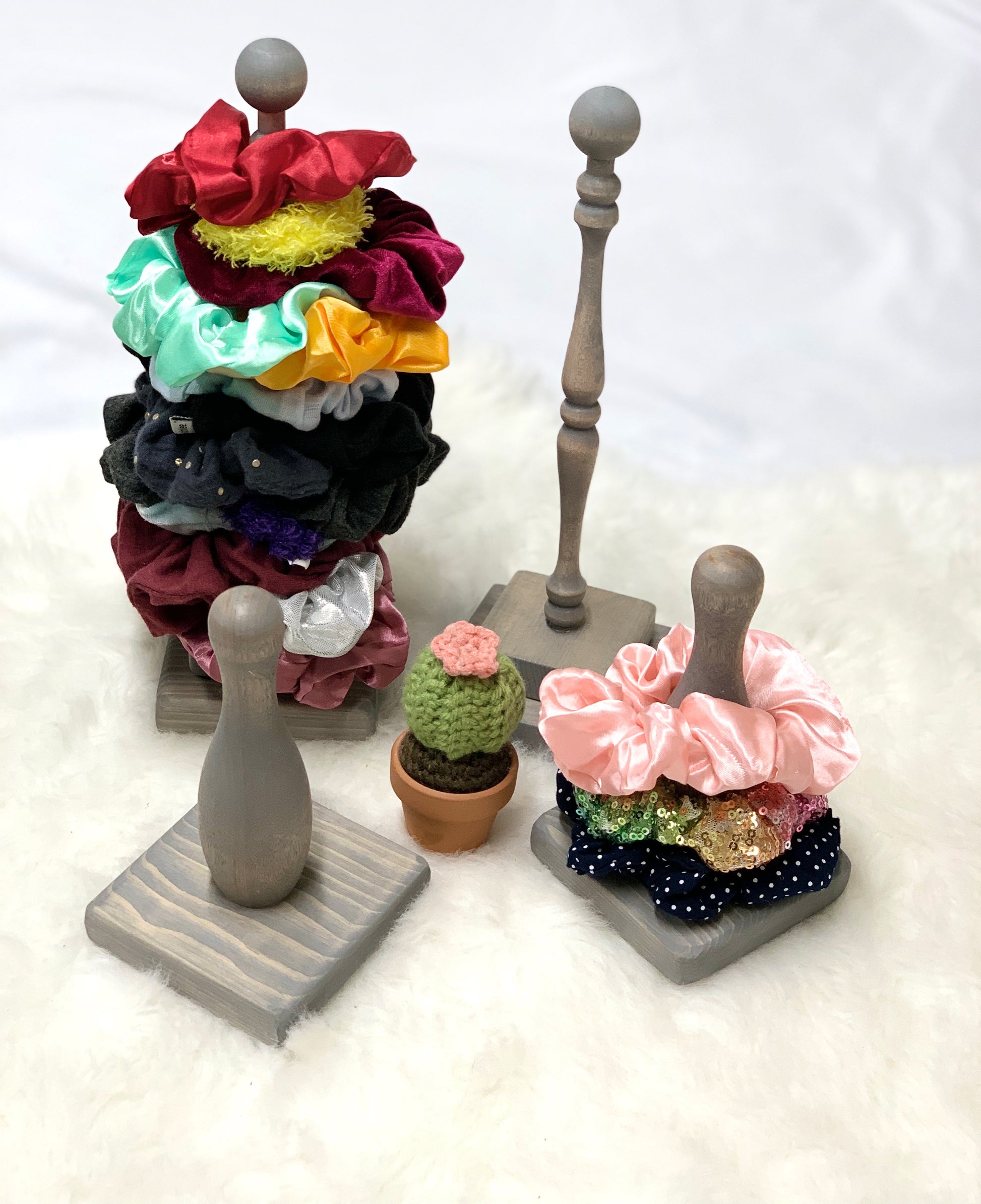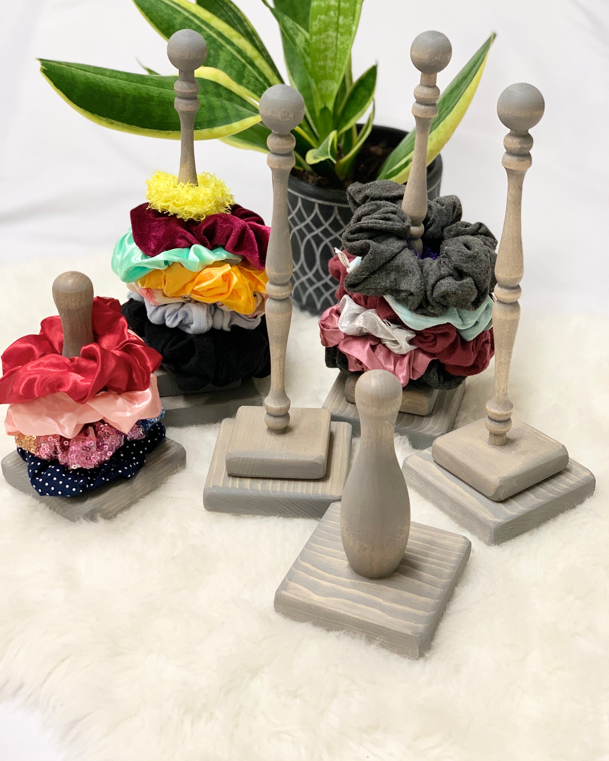 The base of the scrunchie holder is approximately 3.5 inches square and measures about 8.75 inches tall off of the base