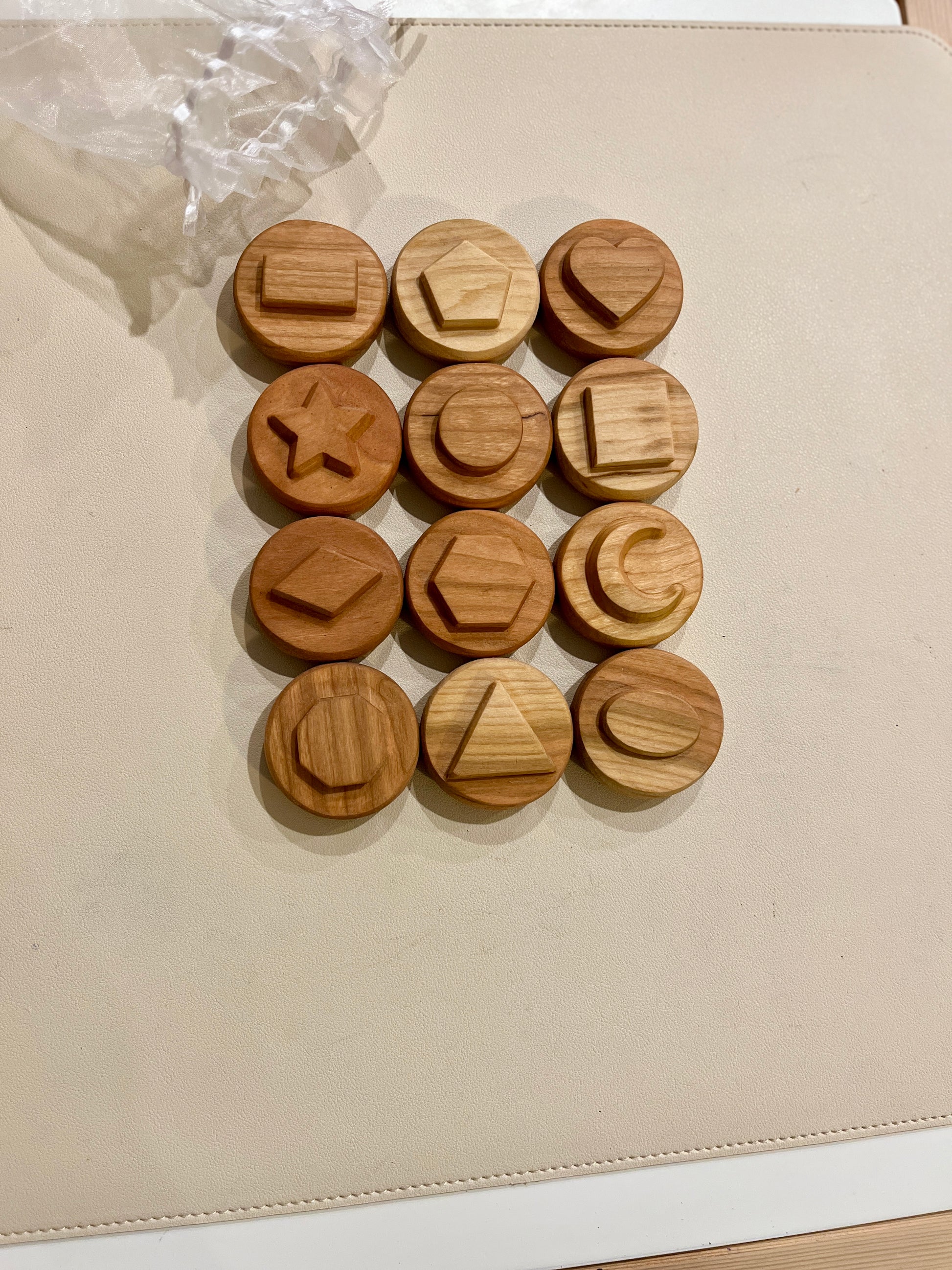 🌈 12 Shape Alphabet Stamps — 2 inches in diameter, all made from one solid piece of cherry hardwood.