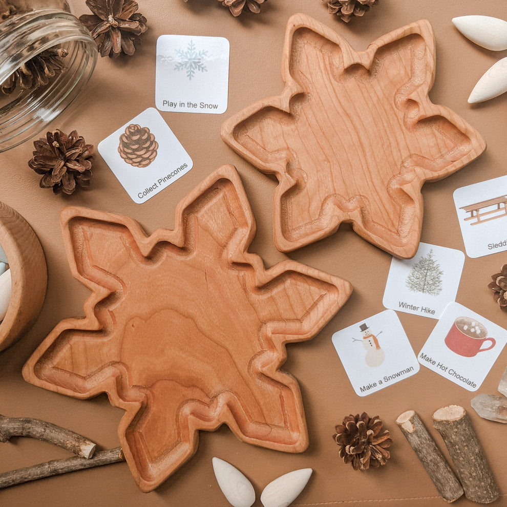 snowflake sensory tray, wooden sensory tray, tactile learning, sensory development, eco-friendly wood, imaginative exploration, hands-on play, winter wonderland, creative playtime, educational enrichment.
