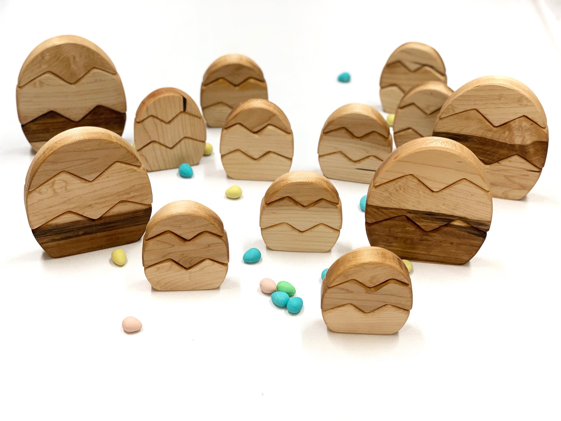 Each Egg is designed by yours truly ! They are made from beautiful maple hardwood and are cut, sanded, painted and finished completely in house.