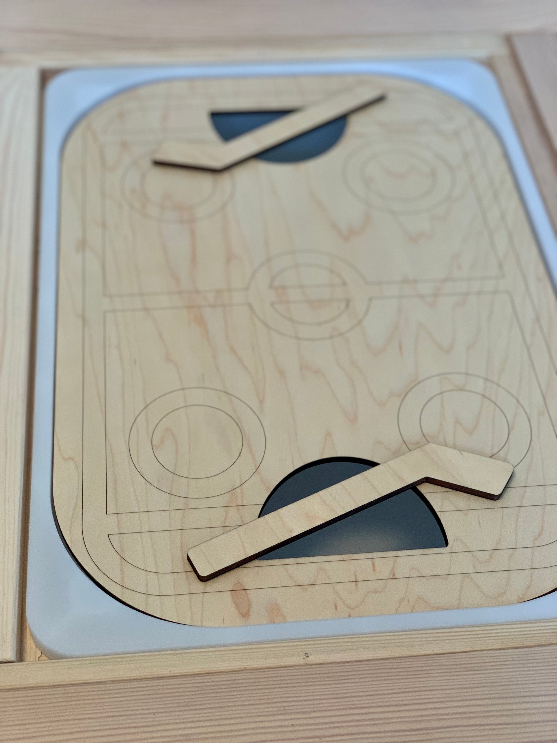 These Flisat inserts/table tops are made to fit the large Flisat bins. Two hockey “sticks” are included but no felt balls are included. We recommend getting a bag of our felt balls.