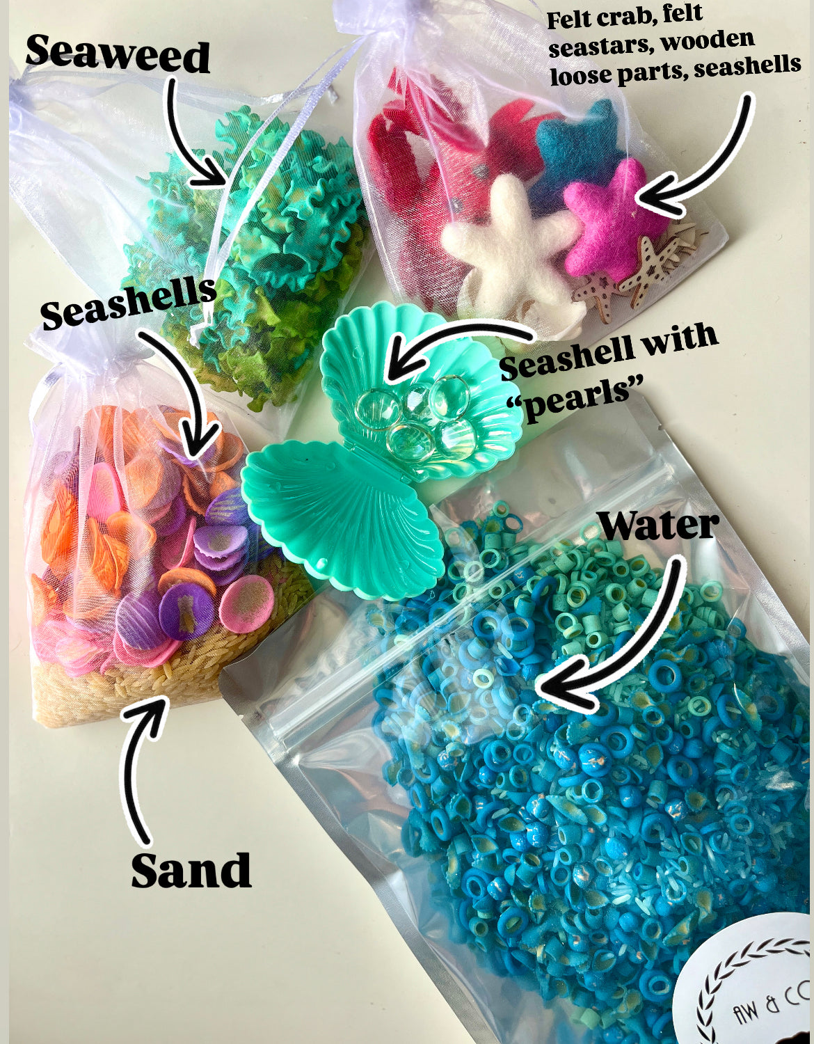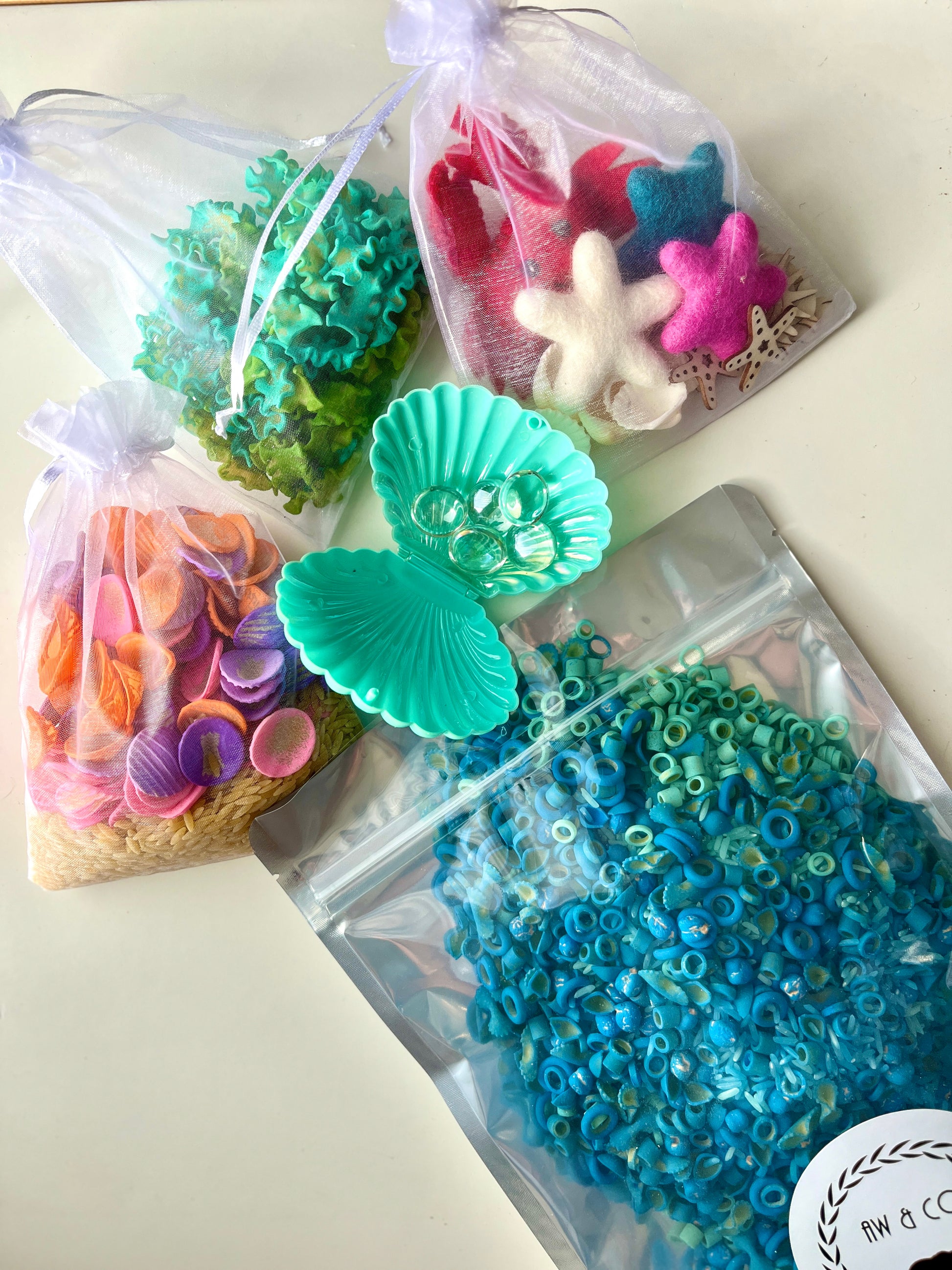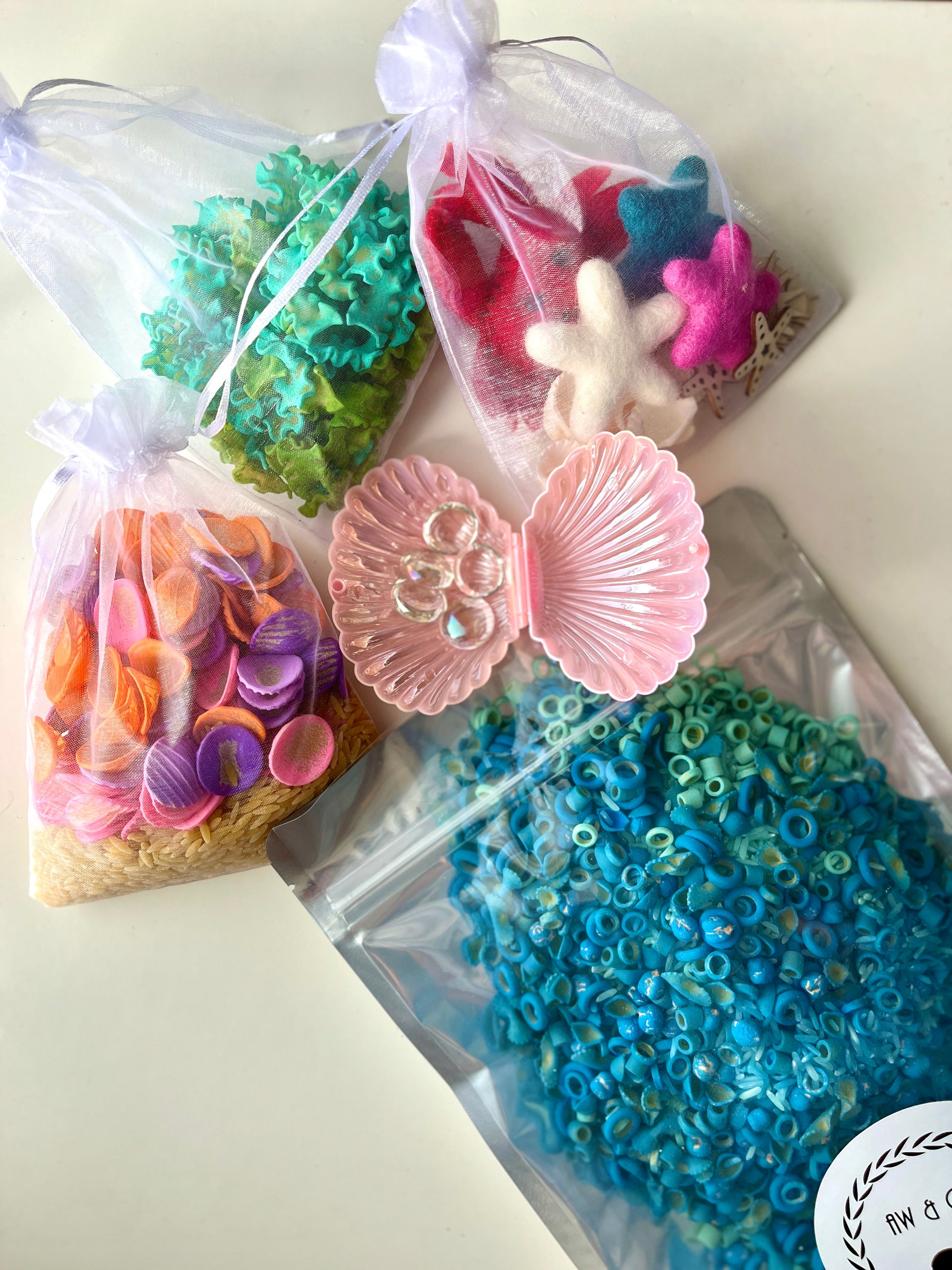 Each Kit comes with 6 cups of filler, a plastic seashell with gems inside, some seashells and wooden items, and an optional felt add on that includes one felt crab and three felt stars.