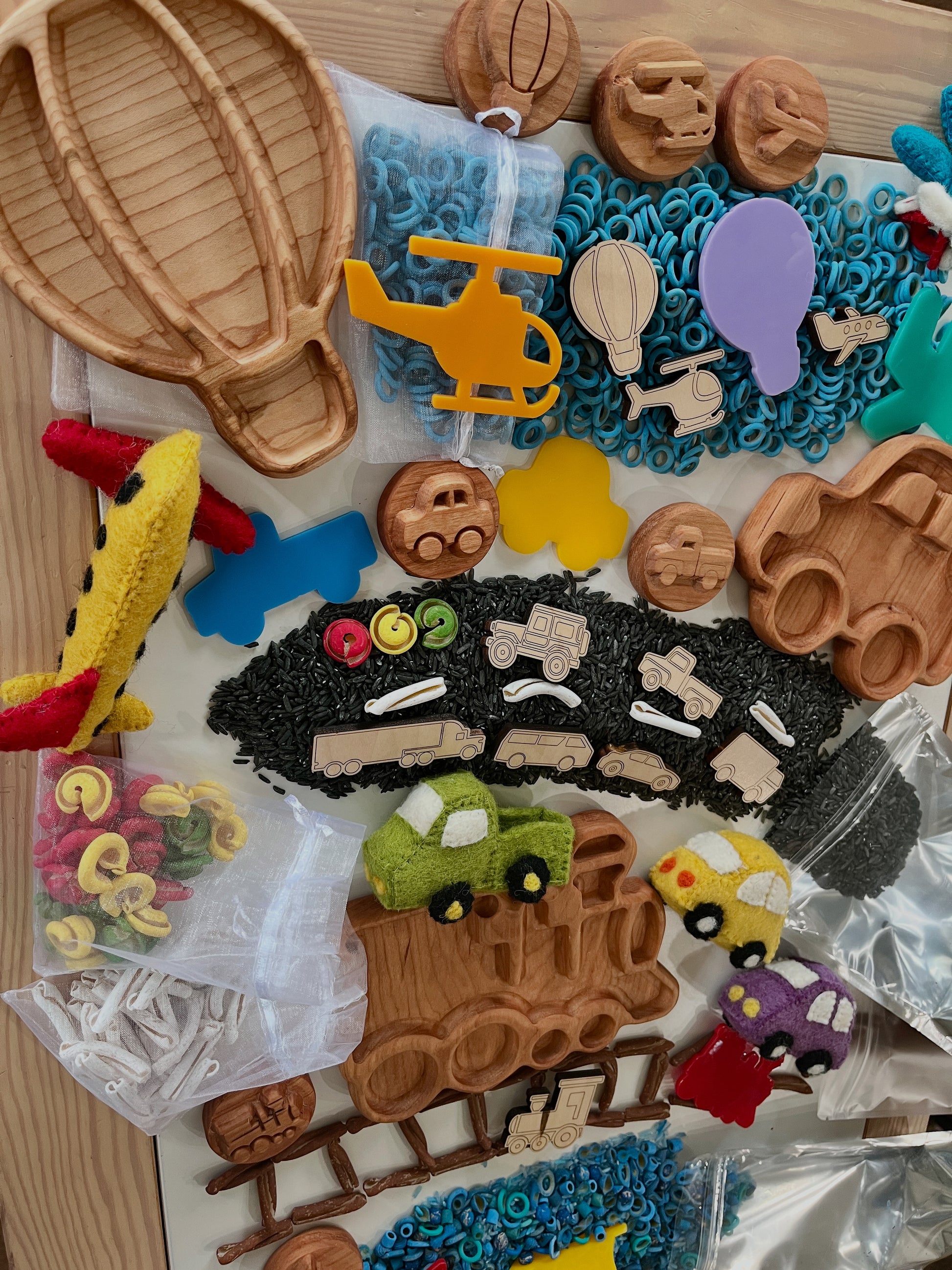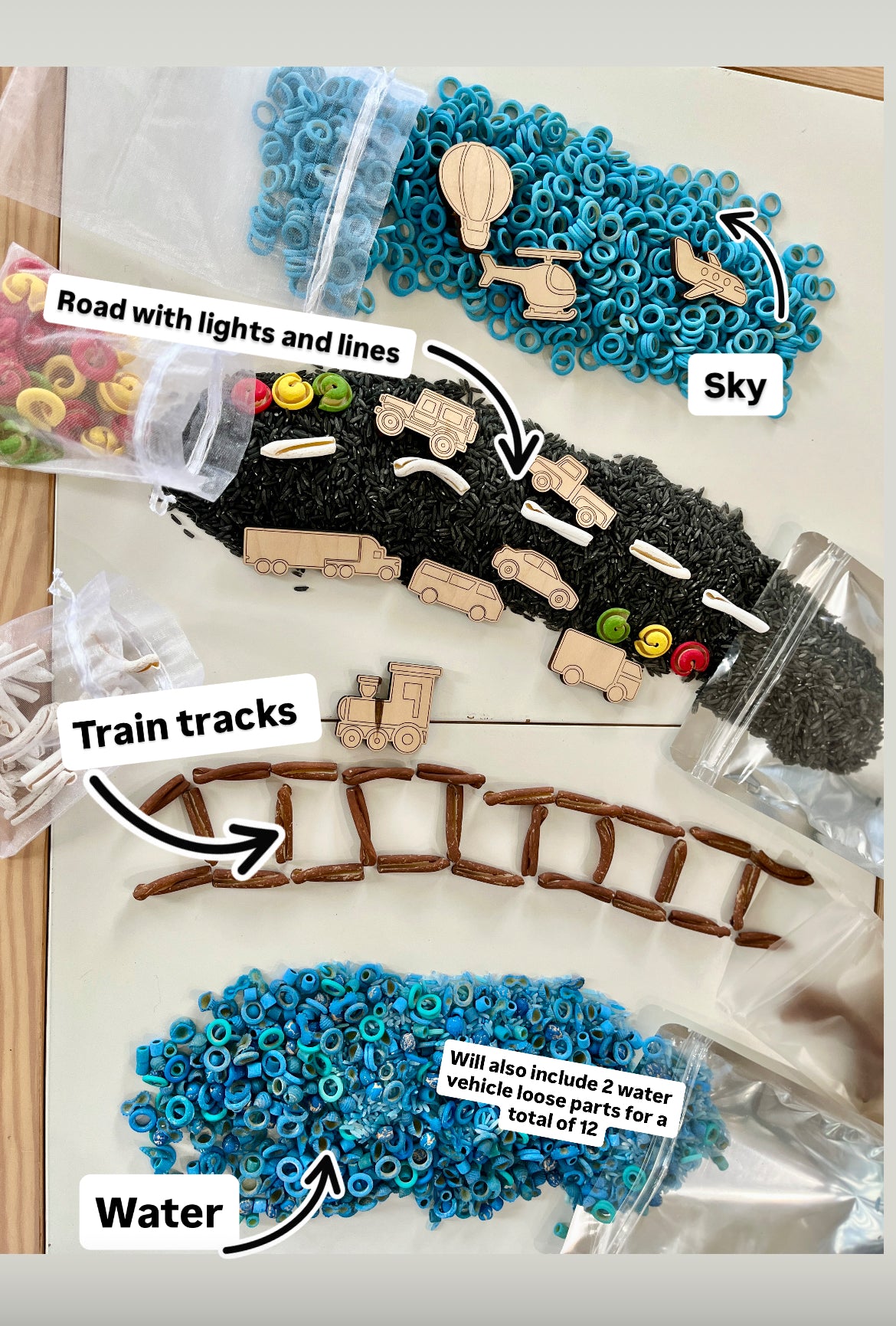 Transportation Fun Filler Sensory Kit with 12 Wood Parts