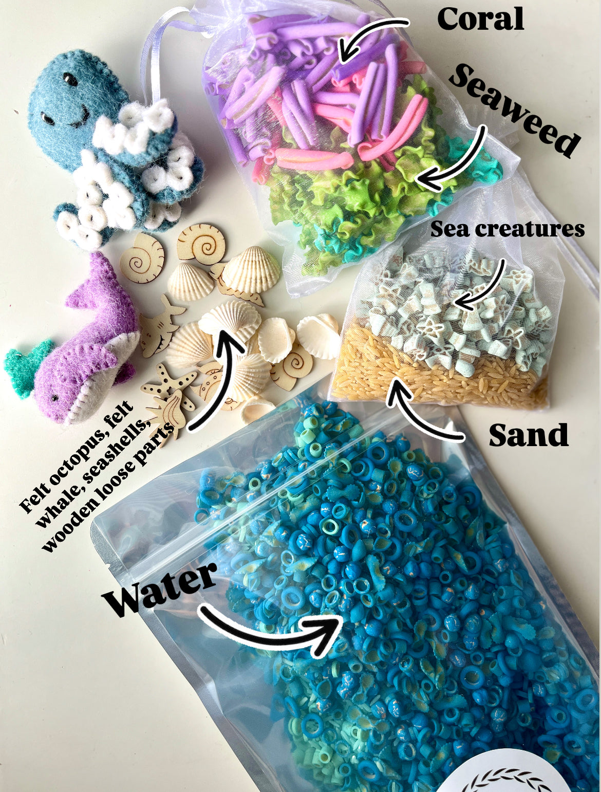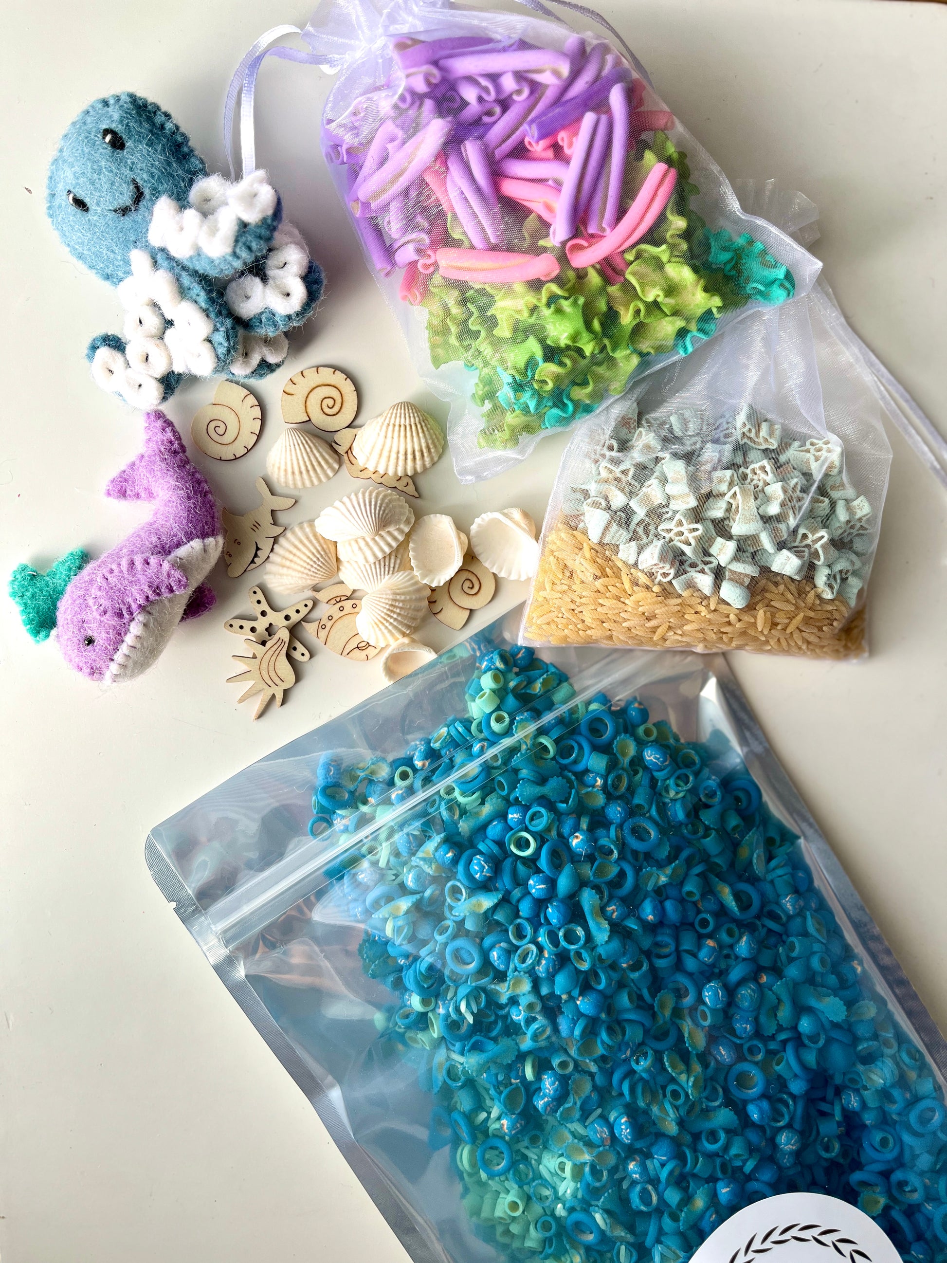 Each Kit comes with 6 cups of filler, some seashells and wooden items, and one felt whale and one felt octopus.