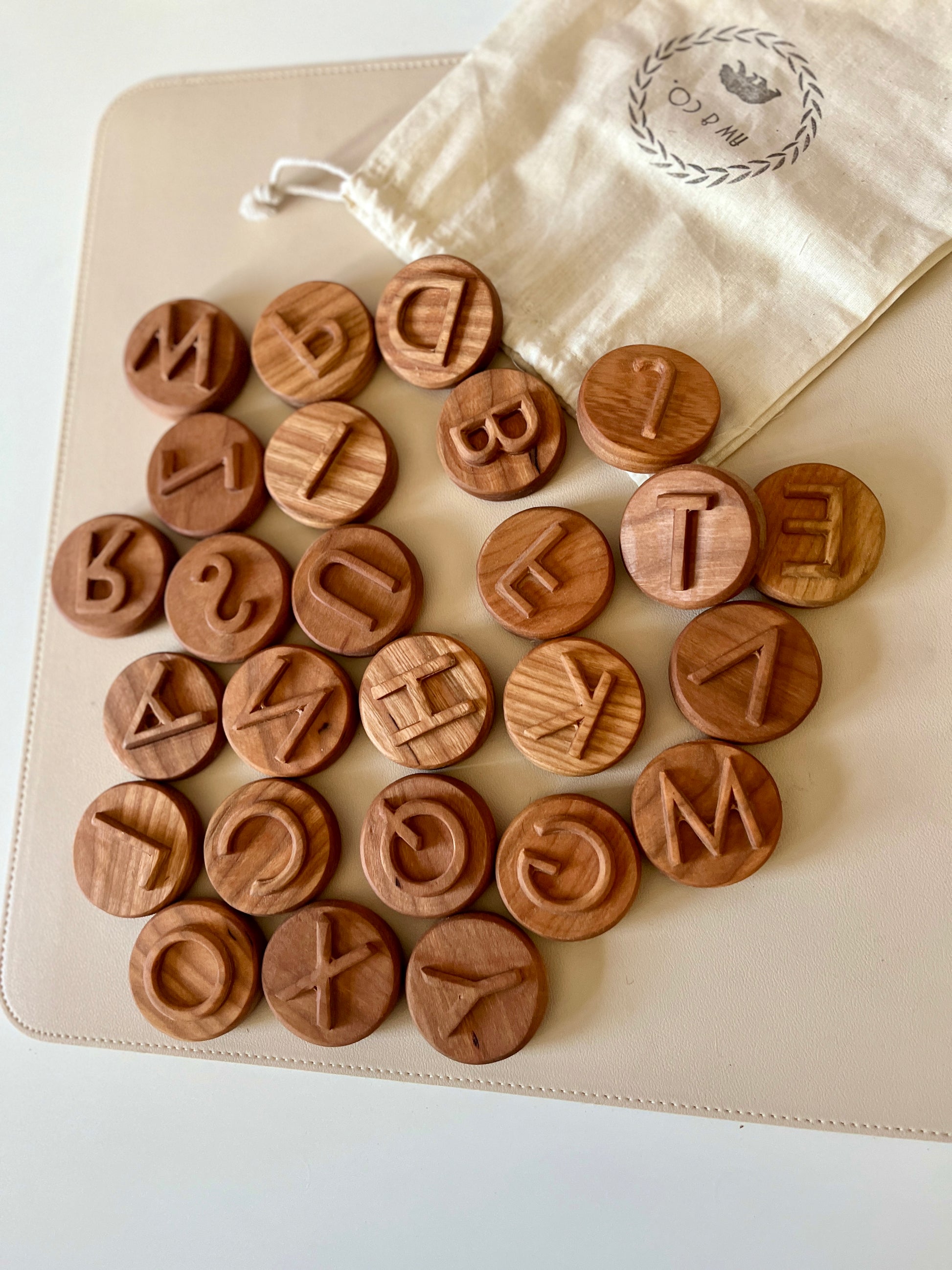 🌈 26 Uppercase Letter Alphabet Stamps — 2 inches in diameter, 3/4” thick, all made from one solid piece of cherry hardwood.