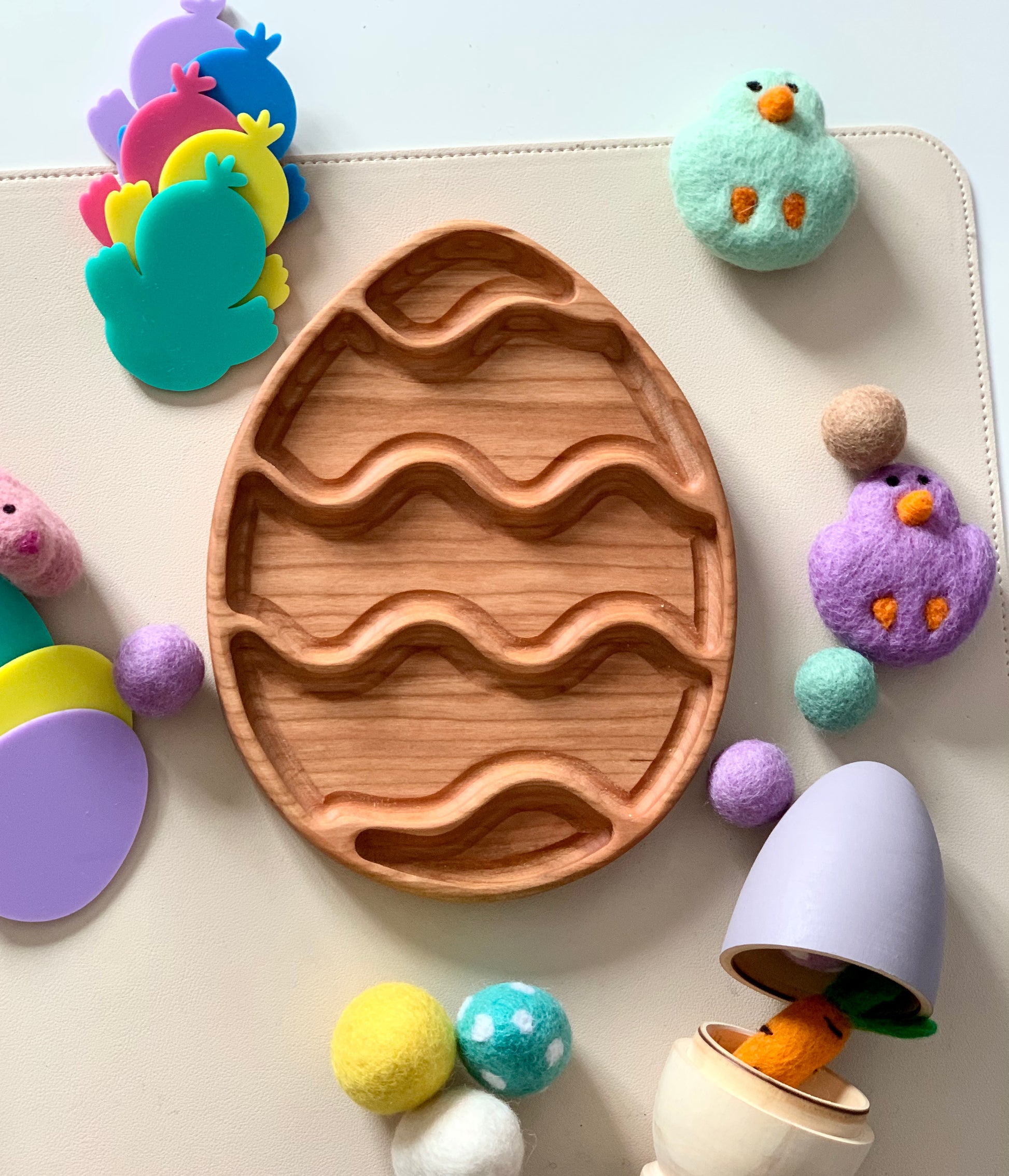 Let your kiddos “decorate” their eggs with various sensory mediums and loose parts. Use them for plates, sensory trays, tinker trays, throw your rings in one — so many cute options!