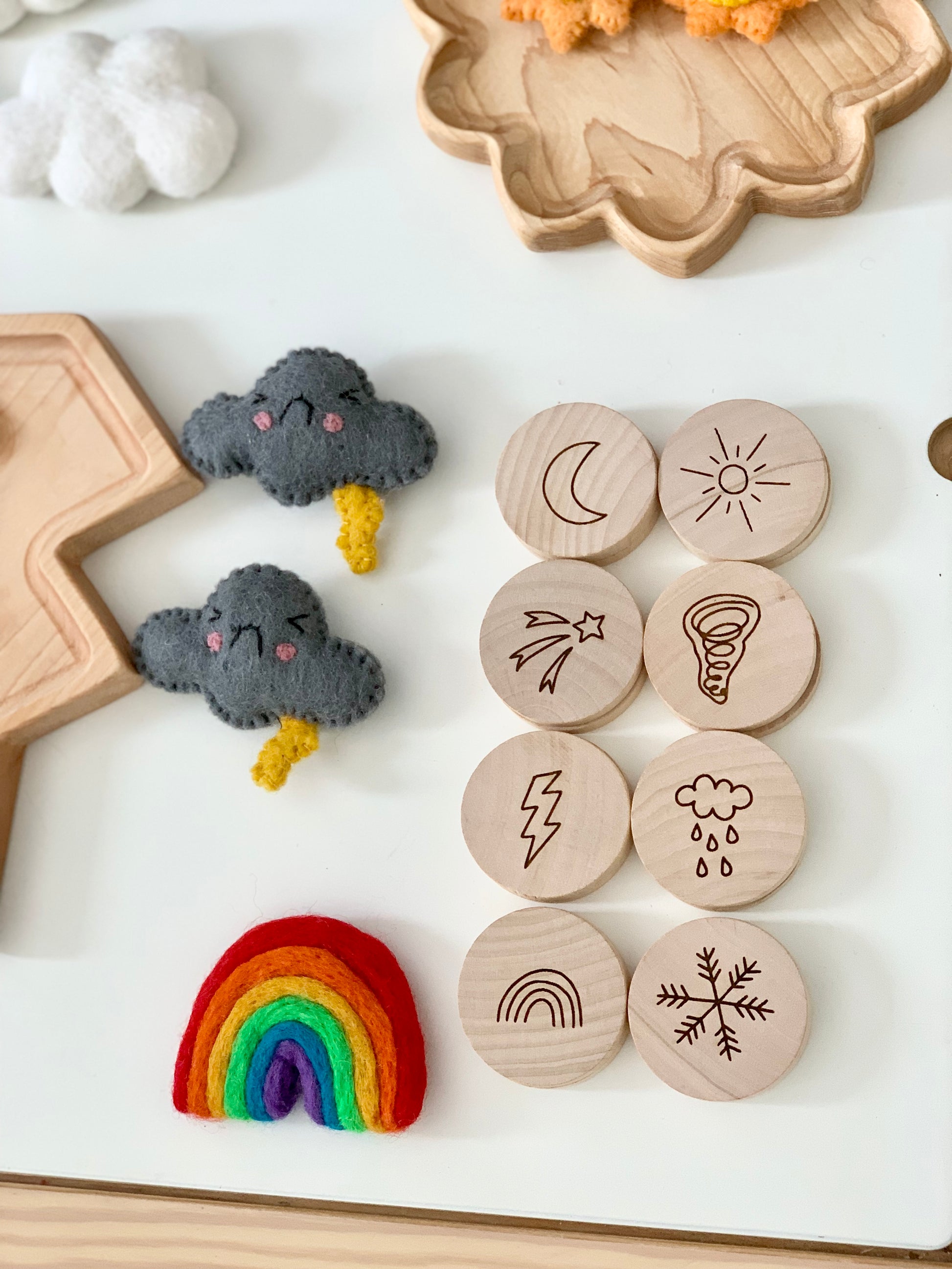 Memory games are a perfect educational toy for your little ones! In addition to using them as a traditional memory game - use them as little storytelling coins ⚡️🌈. Each time you pull a coin out of the bag - add a new sentence to your story, using the image as inspiration. Or - make musical & rhythmic sounds by tapping them together or plopping them into an empty Kleenex box. The possibilities are endless. These are wood burned with a laser machine and coated in a non toxic wood oil — completely eco friendly long lasting heirloom toys 🌿. Oh, and made with the most love ❤️