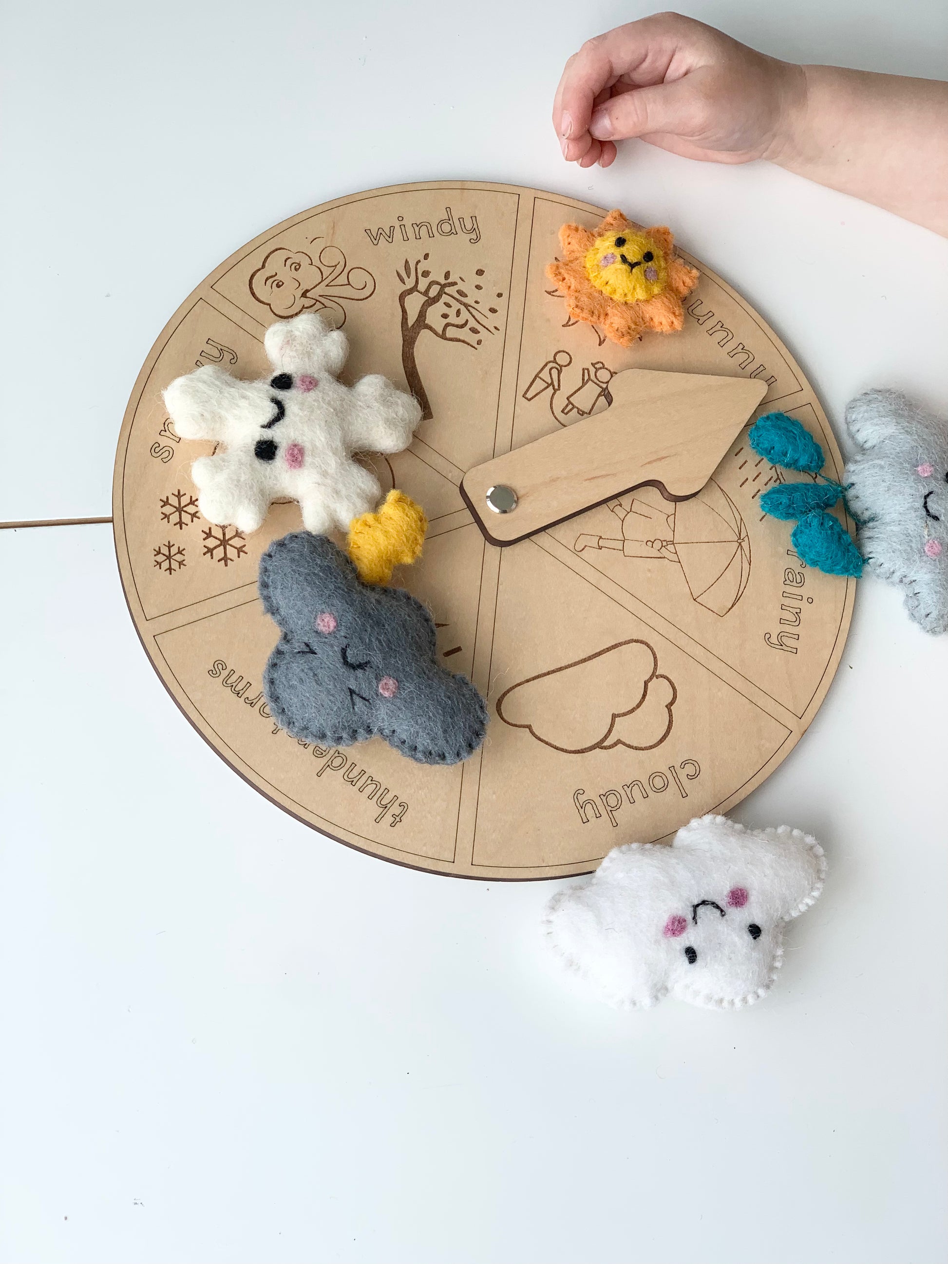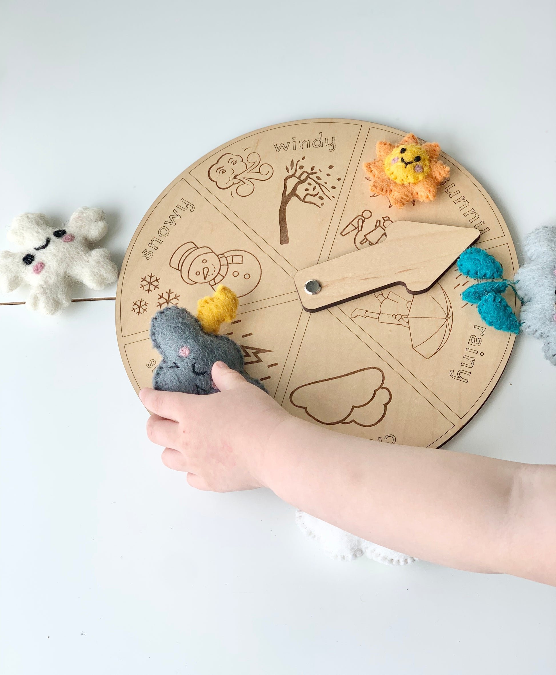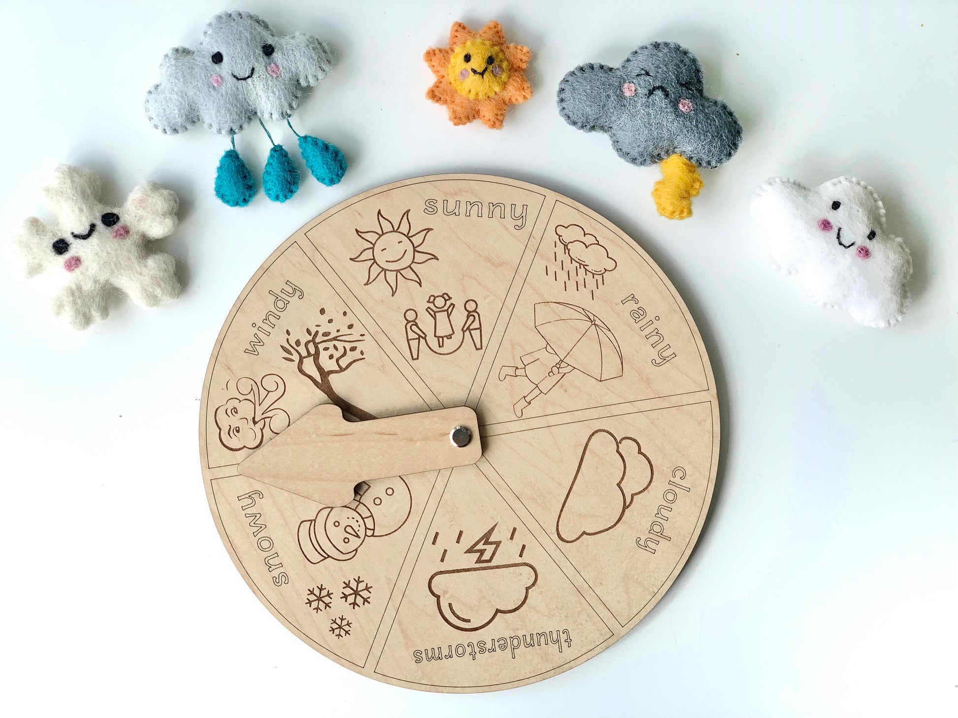 Weather Wheel featuring rainy days, sunny days, cloudy days, thunderstorms, windy days and snowy days!