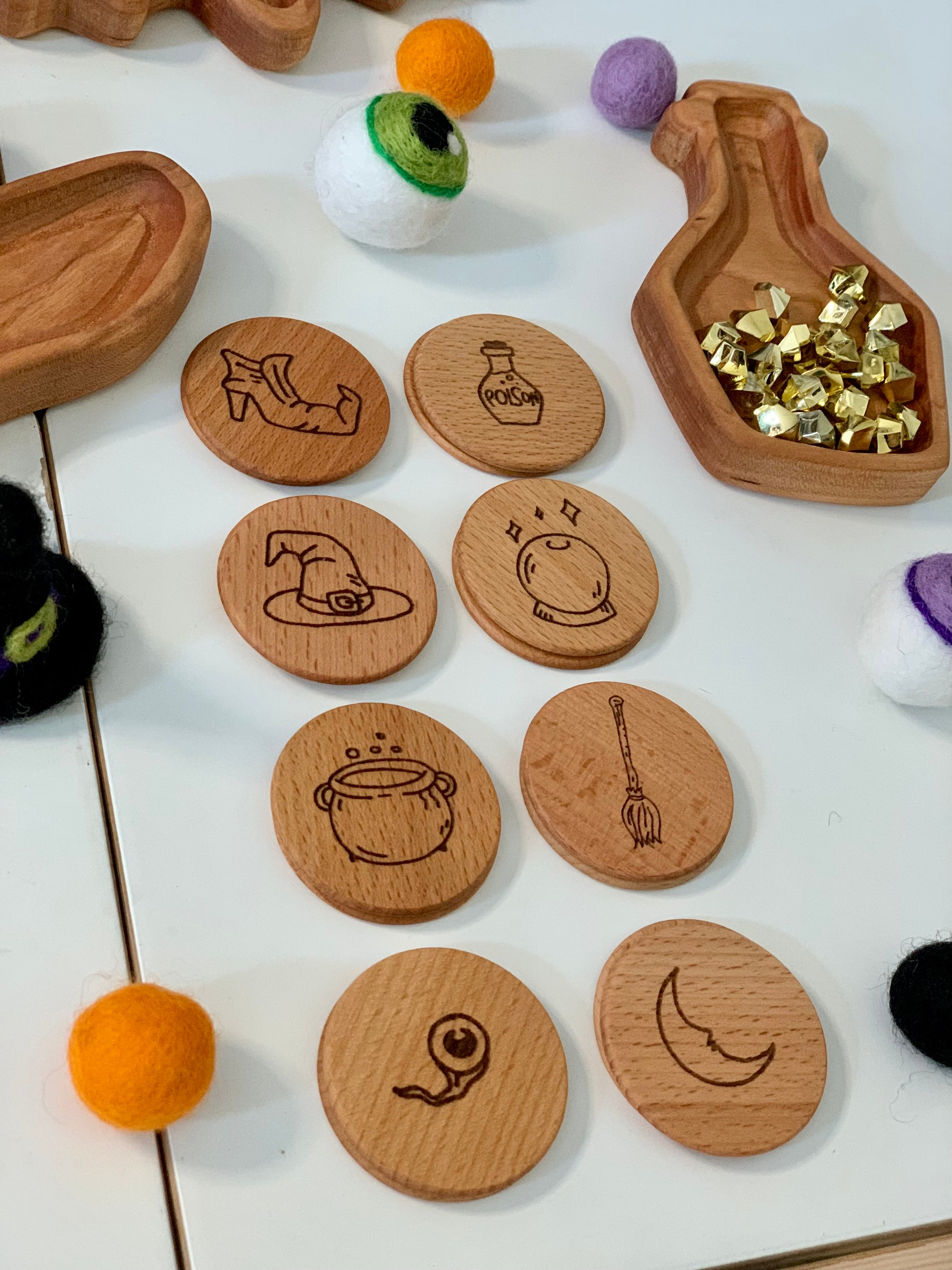 Memory games are a perfect educational toy for your little ones! In addition to using them as a traditional memory game - use them as little storytelling coins ⚡️🌈. Each time you pull a coin out of the bag - add a new sentence to your story, using the image as inspiration. Or - make musical & rhythmic sounds by tapping them together or plopping them into an empty Kleenex box. The possibilities are endless. These are wood burned with a laser machine and coated in a non toxic wood oil — completely eco friendly long lasting heirloom toys 🌿. Oh, and made with the most love ❤️
