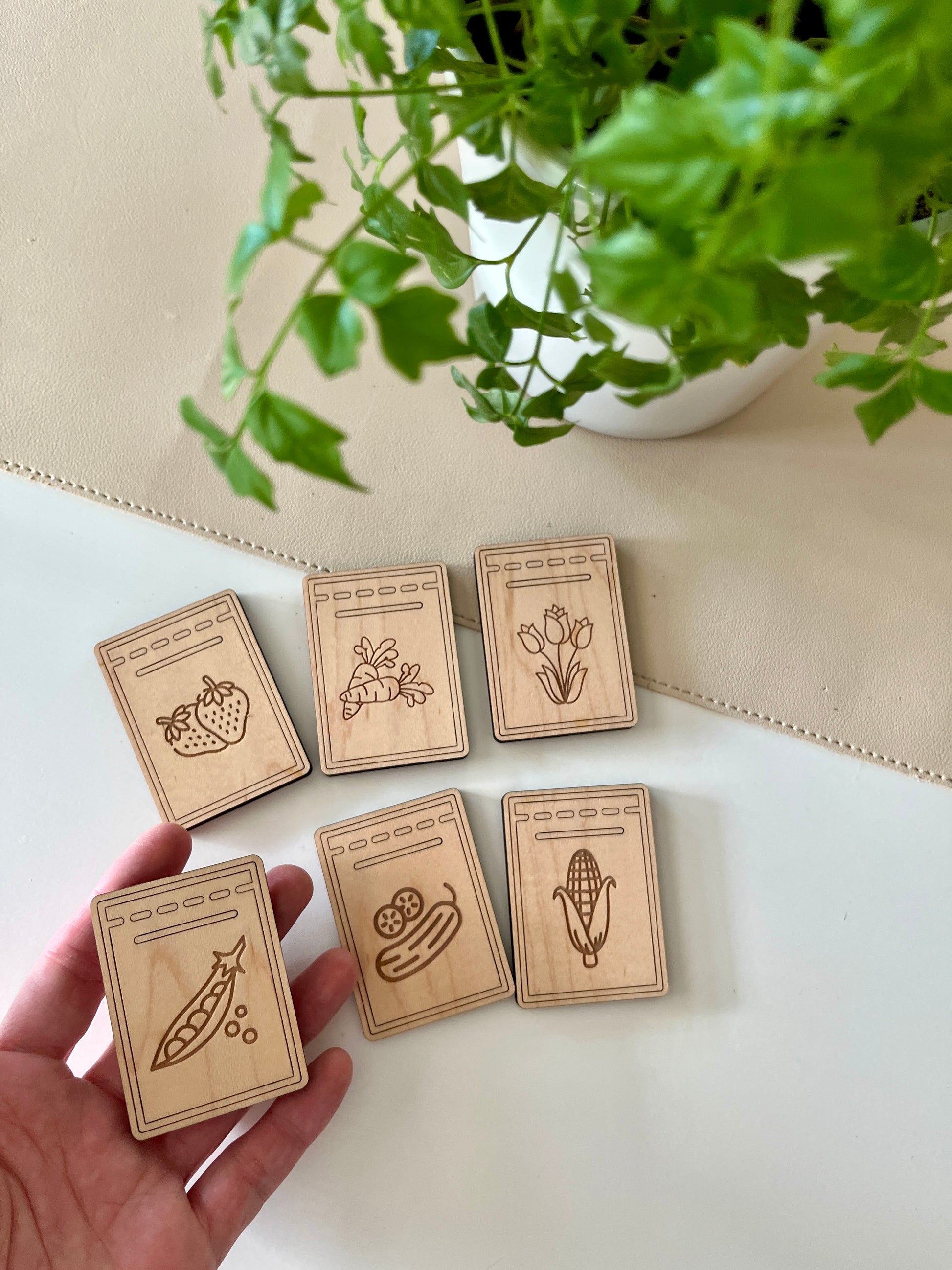 Explore the world of gardening with our beautifully crafted wooden seed packages, perfect for sensory play, counting, sorting, and loose parts exploration. Each piece is laser-cut from high-quality wood and engraved with fine details, making them perfect for: