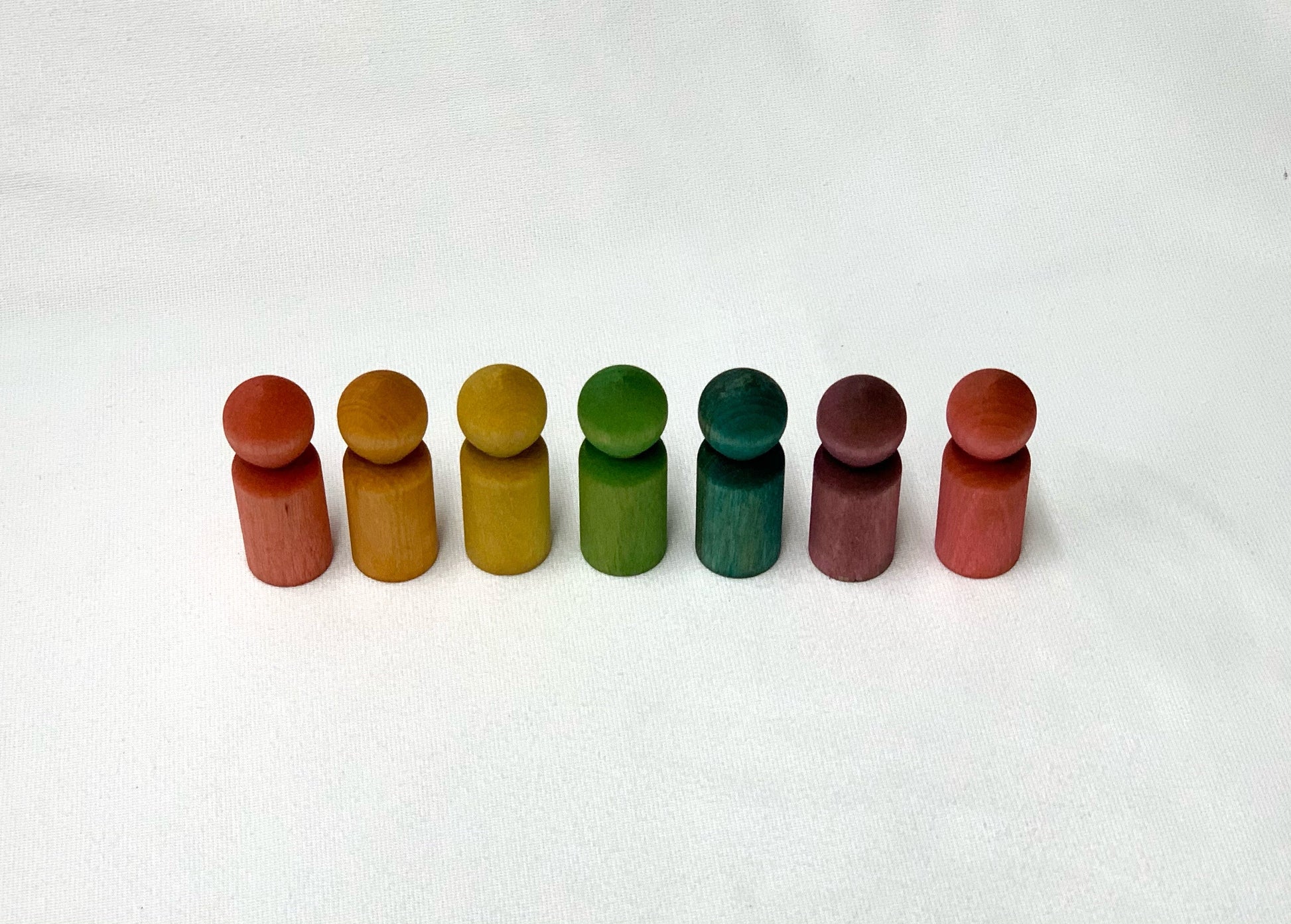 Help your little one learn colors while practicing fine motor skills and sharpening color recognition. Your little one will love playing with these colored men! . This set pairs beautifully with other toys in our lineup. This set is good for colour sorting, shape identification, pincer grasp, counting, stacking, hand-eye coordination — the list goes on. Plus it is great for imaginary play. My daughter likes sorting the colours, playing with them with her rainbow and trees, and even playing with them with her play food. She plays with them in her “kitchen”. Open ended play is also encouraged — Hand dyed in rainbow colours, the dolls are pleasing to touch; as well as look beautiful on a shelf.