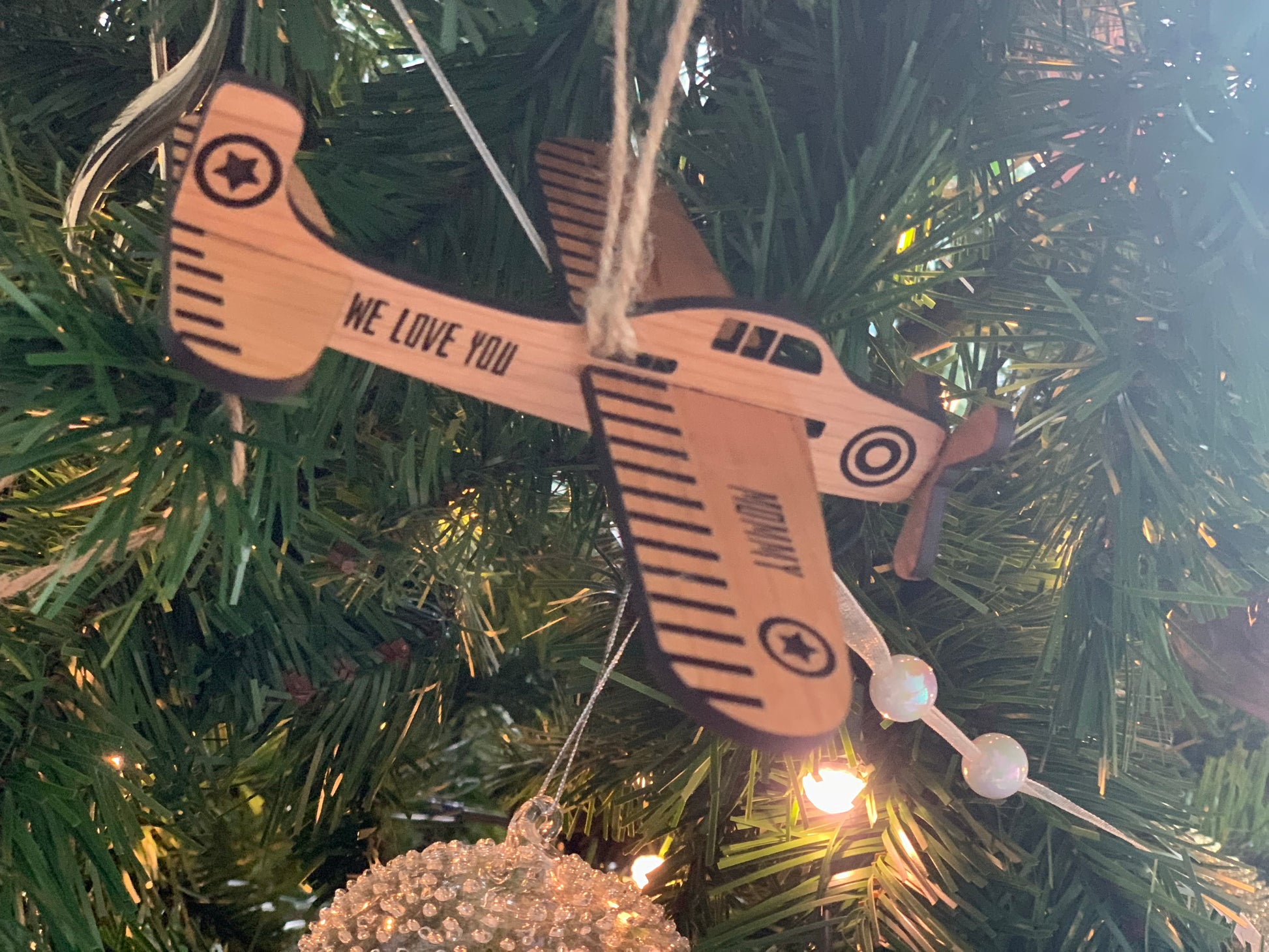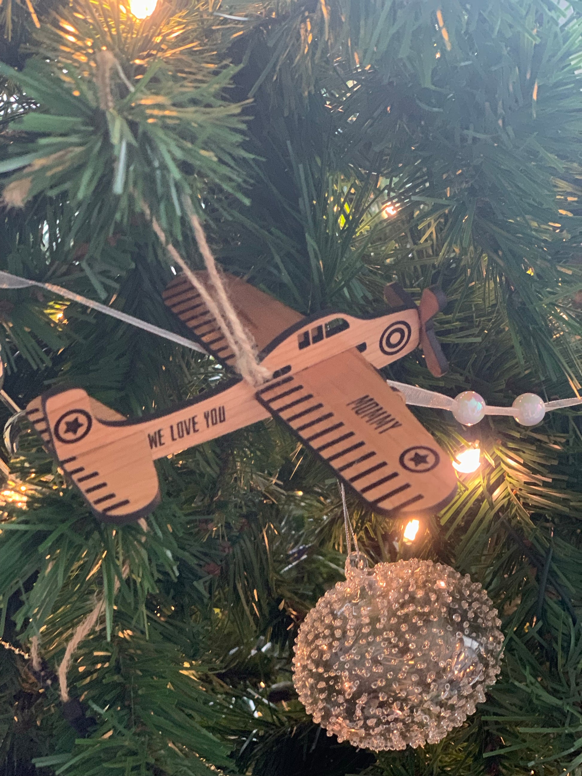 Purchase a wooden airplane Christmas Ornament for yourself, a loved one, or your favourite pilot!.