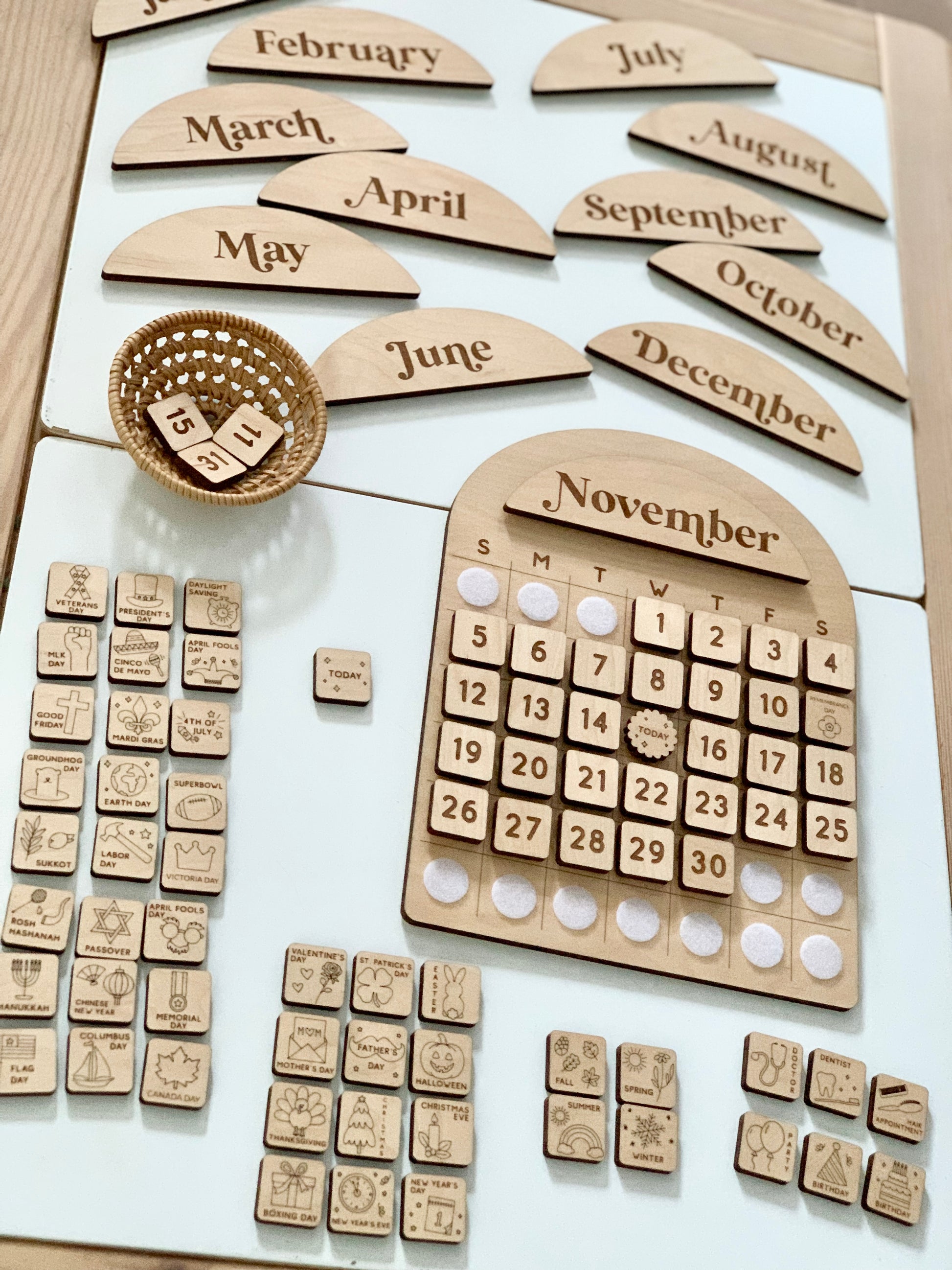Explore our versatile wooden calendar featuring Velcro tiles and a delightful array of holidays, perfect for families, homeschooling, early childhood education centres and more. Foster learning, engagement, and a sense of routine with this interactive and customizable calendar designed to make each day special.