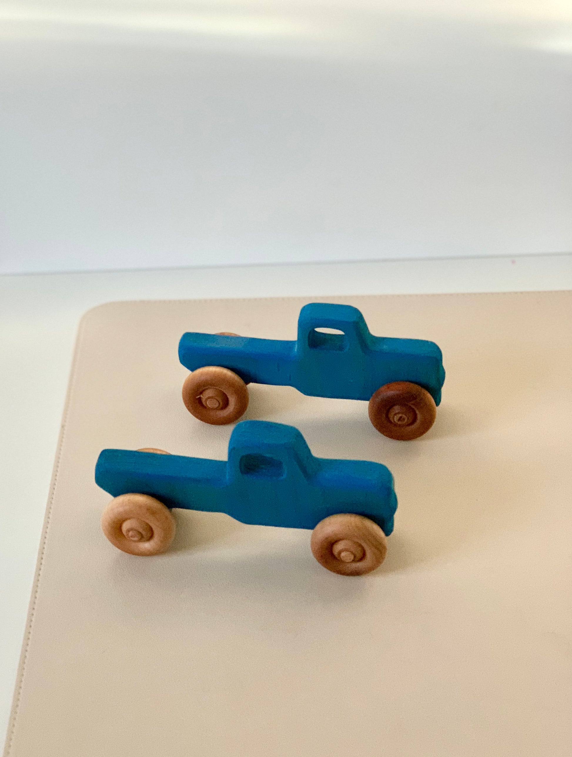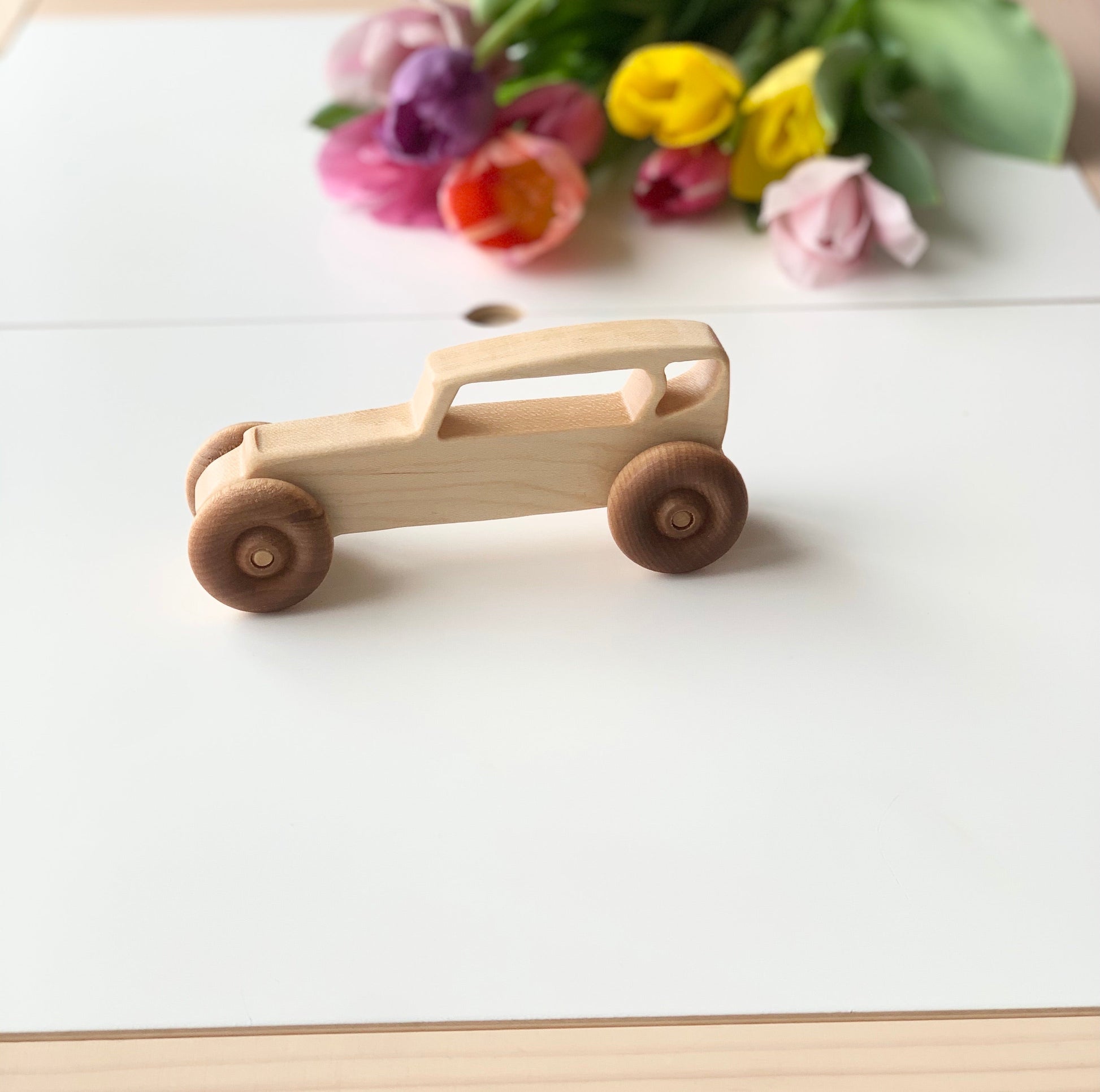 These toy vehicles are designed and produced completely in house made out of solid or cherry maple hardwood and sealed with a non toxic food safe sealer. They are sanded buttery smooth and perfect for little hands. Each one is made to order, giving you the option for personalization as well.