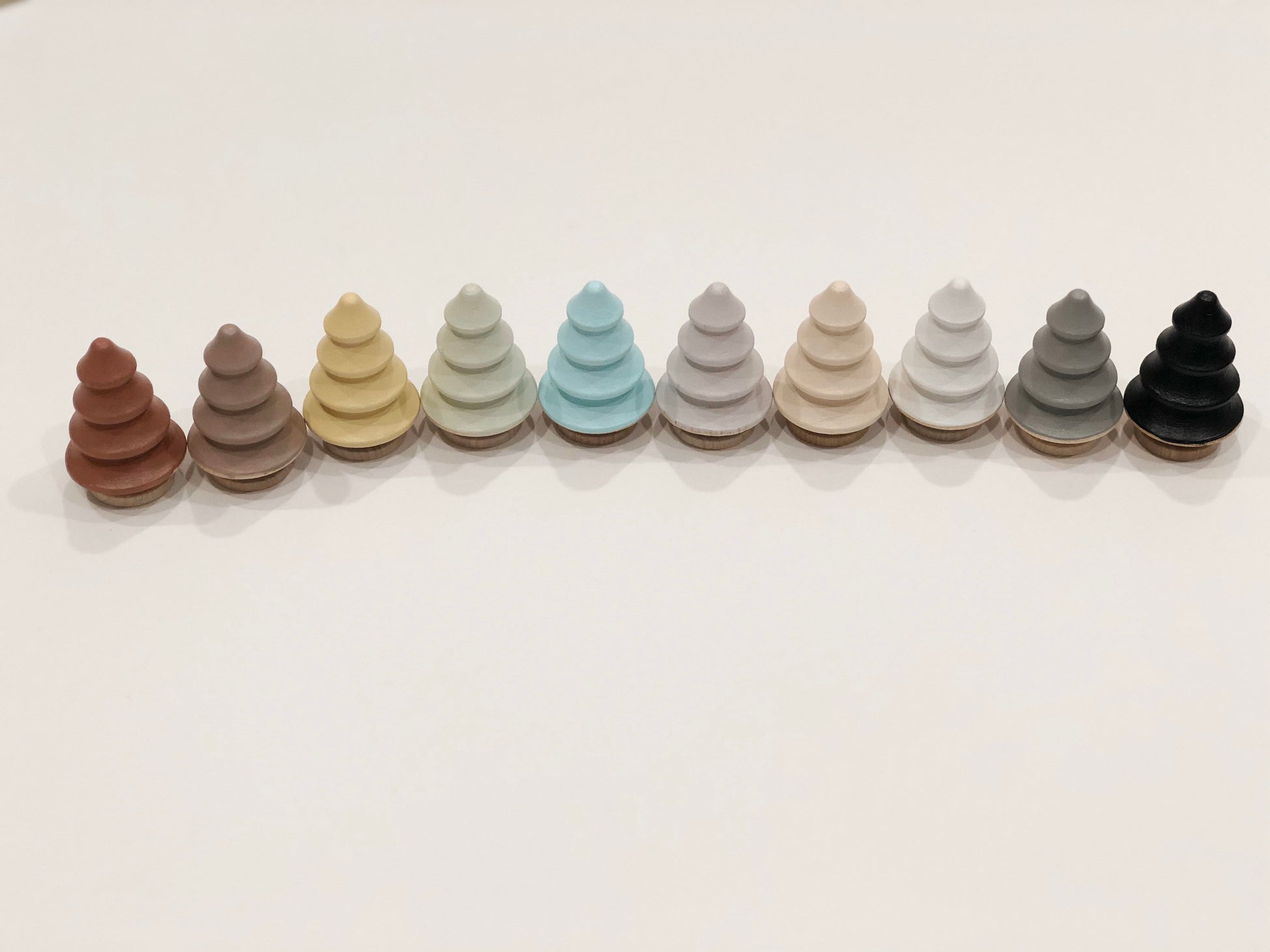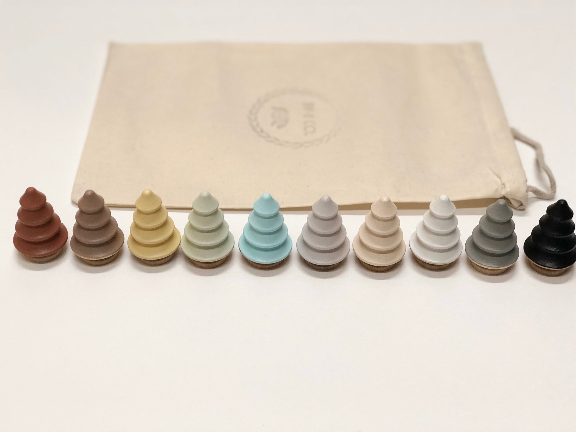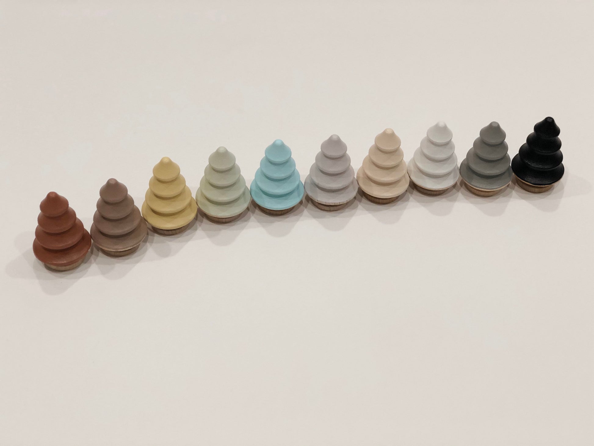 Help your little one learn colors while practicing fine motor skills and sharpening color recognition. Your little one will love playing with these colored trees! . This set pairs beautifully with other toys in our lineup. This set is good for colour sorting, shape identification, pincer grasp, counting, stacking, hand-eye coordination — the list goes on. Plus it is great for imaginary play. My daughter likes sorting the colours, playing with them with peg dolls, and even playing with them with her play food. She plays with them in her “kitchen”. Open ended play is also encouraged — Painted in pastel and neutral colours, the trees are pleasing to touch; as well as look beautiful on a shelf.